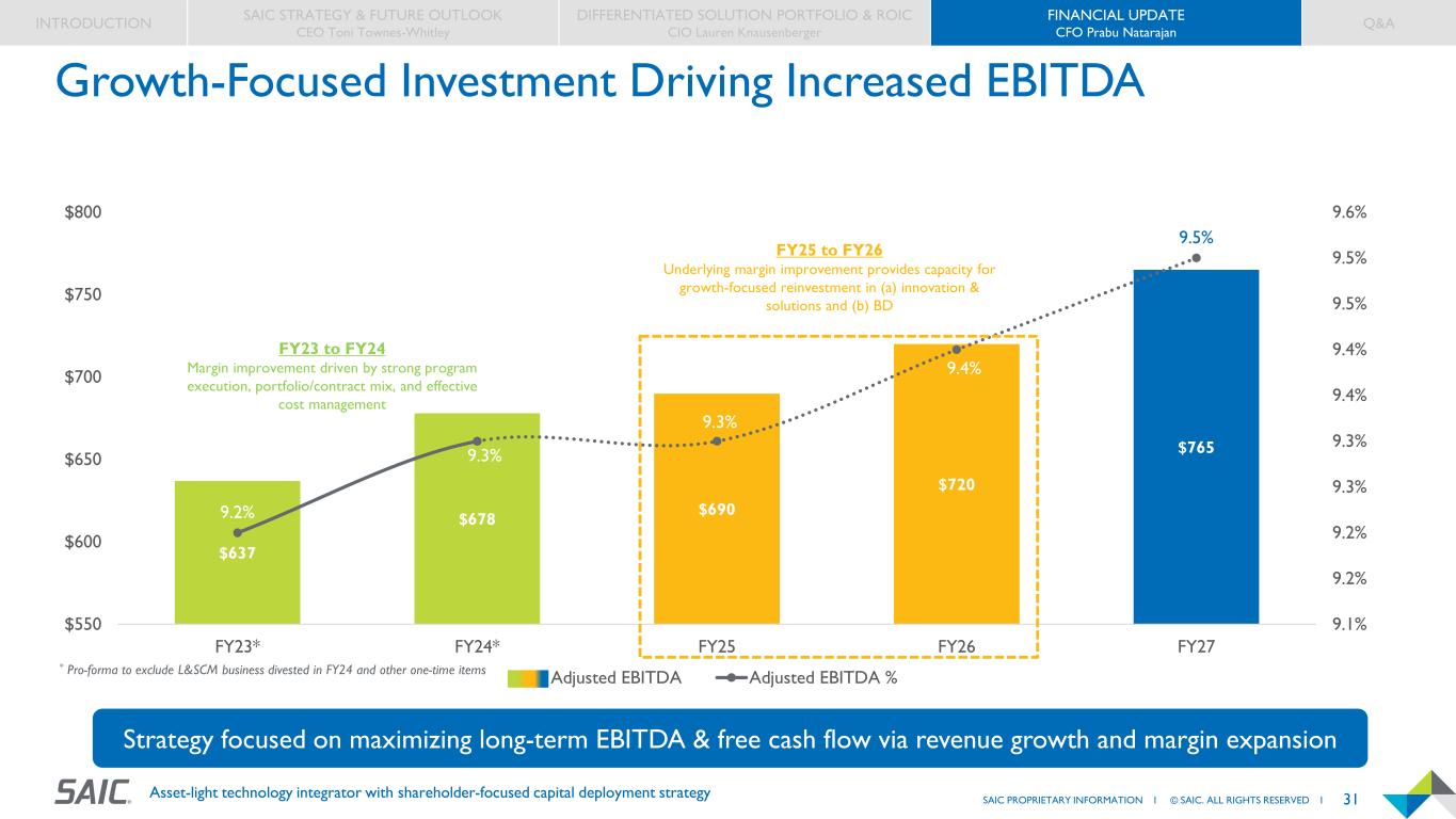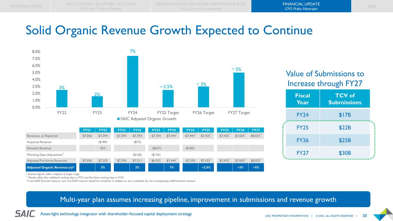 30SAIC PROPRIETARY INFORMATION I © SAIC. ALL RIGHTS RESERVED I Asset-light technology integrator with shareholder-focused capital deployment strategy Fiscal Year TCV of Submissions FY24 $17B FY25 $22B FY26 $25B FY27 $30B Value of Submissions to Increase through FY27 INTRODUCTION SAIC STRATEGY & FUTURE OUTLOOK CEO Toni Townes-Whitley DIFFERENTIATED SOLUTION PORTFOLIO & ROIC CIO Lauren Knausenberger FINANCIAL UPDATE CFO Prabu Natarajan Q&A Solid Organic Revenue Growth Expected to Continue + Revenue figures reflect midpoint of target range ** Results reflect four additional working days in FY23 and five fewer working days in FY24 * A non-GAAP financial measure; such non-GAAP measure should be considered in addition to, not a substitute for, the corresponding GAAP financial measure 3% 2% 7% 2.5% 3% 5% 0.0% 1.0% 2.0% 3.0% 4.0% 5.0% 6.0% 7.0% 8.0% FY22 FY23 FY24 FY25 Target FY26 Target FY27 Target SAIC Adjusted Organic Growth FY21 FY22 FY22 FY23 FY23 FY24 FY24 FY25 FY25 FY26 FY27 Revenues, as Reported $7,056 $7,394 $7,394 $7,704 $7,704 $7,444 + $7,444 + $7,425 + $7,425 + $7,650 + $8,025 + Acquired Revenue ($184) ($73) Divested Revenue $25 ($637) ($185) Working Days Adjustment** ($120) ($135) Adjusted Pro-forma Revenues $7,056 $7,235 $7,394 $7,511 $6,932 $7,444 + $7,259 $7,425 + $7,425 + $7,650 + $8,025 + Adjusted Organic Revenue y/y* 3% 2% 7% ~2.5% ~3% ~5% ~ ~ ~ Multi-year plan assumes increasing pipeline, improvement in submissions and revenue growth