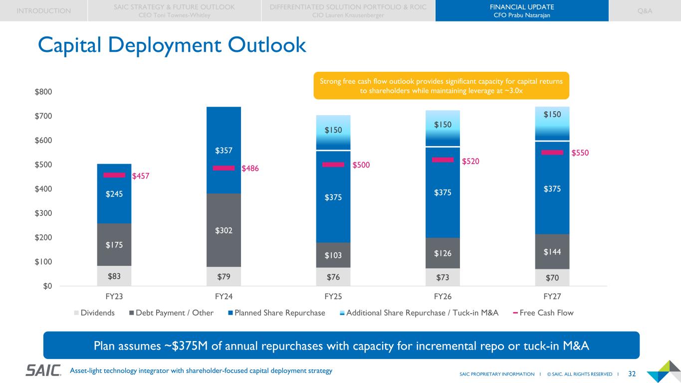 31SAIC PROPRIETARY INFORMATION I © SAIC. ALL RIGHTS RESERVED I Asset-light technology integrator with shareholder-focused capital deployment strategy $637 $678 $690 $720 $765 9.2% 9.3% 9.3% 9.4% 9.5% 9.1% 9.2% 9.2% 9.3% 9.3% 9.4% 9.4% 9.5% 9.5% 9.6% $550 $600 $650 $700 $750 $800 FY23* FY24* FY25 FY26 FY27 Adjusted EBITDA Adjusted EBITDA % Growth-Focused Investment Driving Increased EBITDA * Pro-forma to exclude L&SCM business divested in FY24 and other one-time items FY23 to FY24 Margin improvement driven by strong program execution, portfolio/contract mix, and effective cost management FY25 to FY26 Underlying margin improvement provides capacity for growth-focused reinvestment in (a) innovation & solutions and (b) BD INTRODUCTION SAIC STRATEGY & FUTURE OUTLOOK CEO Toni Townes-Whitley DIFFERENTIATED SOLUTION PORTFOLIO & ROIC CIO Lauren Knausenberger FINANCIAL UPDATE CFO Prabu Natarajan Q&A Strategy focused on maximizing long-term EBITDA & free cash flow via revenue growth and margin expansion