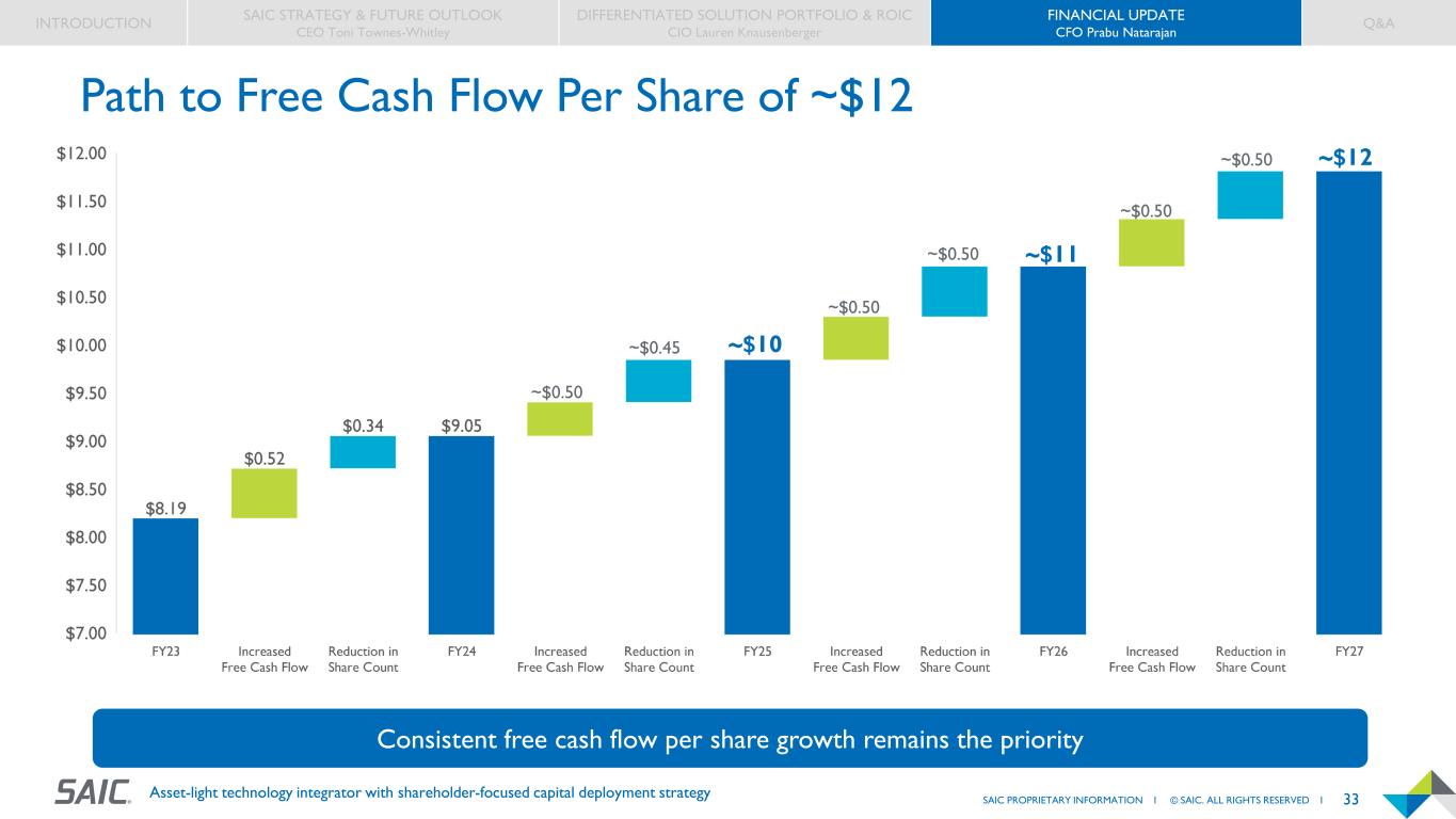 32SAIC PROPRIETARY INFORMATION I © SAIC. ALL RIGHTS RESERVED I Asset-light technology integrator with shareholder-focused capital deployment strategy $83 $79 $76 $73 $70 $175 $302 $103 $126 $144 $245 $357 $375 $375 $375 $150 $150 $150 $457 $486 $500 $520 $550 $0 $100 $200 $300 $400 $500 $600 $700 $800 FY23 FY24 FY25 FY26 FY27 Dividends Debt Payment / Other Planned Share Repurchase Additional Share Repurchase / Tuck-in M&A Free Cash Flow Capital Deployment Outlook Strong free cash flow outlook provides significant capacity for capital returns to shareholders while maintaining leverage at ~3.0x INTRODUCTION SAIC STRATEGY & FUTURE OUTLOOK CEO Toni Townes-Whitley DIFFERENTIATED SOLUTION PORTFOLIO & ROIC CIO Lauren Knausenberger FINANCIAL UPDATE CFO Prabu Natarajan Q&A Plan assumes ~$375M of annual repurchases with capacity for incremental repo or tuck-in M&A