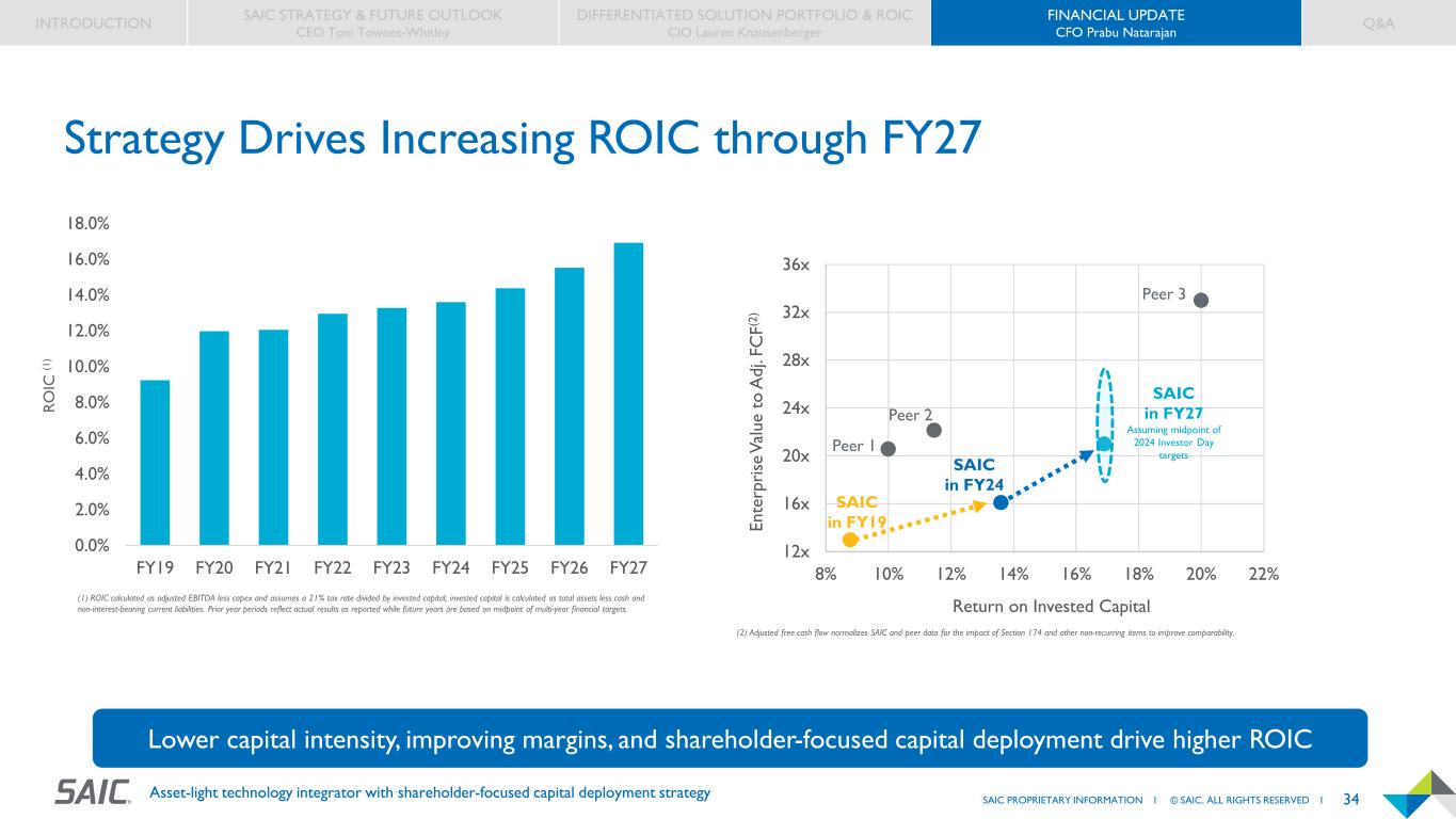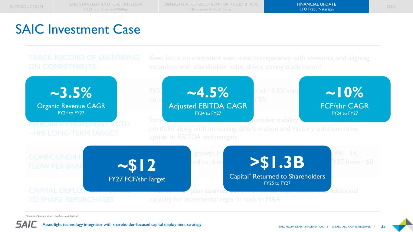 34SAIC PROPRIETARY INFORMATION I © SAIC. ALL RIGHTS RESERVED I Asset-light technology integrator with shareholder-focused capital deployment strategy Strategy Drives Increasing ROIC through FY27 0.0% 2.0% 4.0% 6.0% 8.0% 10.0% 12.0% 14.0% 16.0% 18.0% FY19 FY20 FY21 FY22 FY23 FY24 FY25 FY26 FY27 R O IC (1 ) 12x 16x 20x 24x 28x 32x 36x 8% 10% 12% 14% 16% 18% 20% 22% En te rp ri se V al ue t o A dj . F C F( 2) Return on Invested Capital SAIC in FY24 Peer 3 Peer 1 Peer 2 SAIC in FY27 Assuming midpoint of 2024 Investor Day targets (1) ROIC calculated as adjusted EBITDA less capex and assumes a 21% tax rate divided by invested capital; invested capital is calculated as total assets less cash and non-interest-bearing current liabilities. Prior year periods reflect actual results as reported while future years are based on midpoint of multi-year financial targets. (2) Adjusted free cash flow normalizes SAIC and peer data for the impact of Section 174 and other non-recurring items to improve comparability. INTRODUCTION SAIC STRATEGY & FUTURE OUTLOOK CEO Toni Townes-Whitley DIFFERENTIATED SOLUTION PORTFOLIO & ROIC CIO Lauren Knausenberger FINANCIAL UPDATE CFO Prabu Natarajan Q&A Lower capital intensity, improving margins, and shareholder-focused capital deployment drive higher ROIC SAIC in FY19