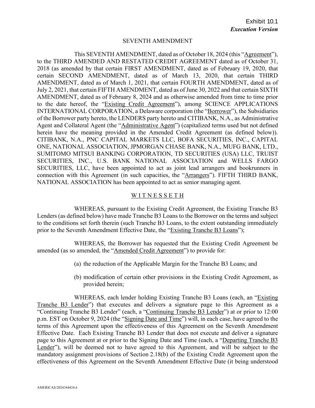 Exhibit 10.1 Execution Version AMERICAS/2024344424.6 SEVENTH AMENDMENT This SEVENTH AMENDMENT, dated as of October 18, 2024 (this “Agreement”), to the THIRD AMENDED AND RESTATED CREDIT AGREEMENT dated as of October 31, 2018 (as amended by that certain FIRST AMENDMENT, dated as of February 19, 2020, that certain SECOND AMENDMENT, dated as of March 13, 2020, that certain THIRD AMENDMENT, dated as of March 1, 2021, that certain FOURTH AMENDMENT, dated as of July 2, 2021, that certain FIFTH AMENDMENT, dated as of June 30, 2022 and that certain SIXTH AMENDMENT, dated as of February 8, 2024 and as otherwise amended from time to time prior to the date hereof, the “Existing Credit Agreement”), among SCIENCE APPLICATIONS INTERNATIONAL CORPORATION, a Delaware corporation (the “Borrower”), the Subsidiaries of the Borrower party hereto, the LENDERS party hereto and CITIBANK, N.A., as Administrative Agent and Collateral Agent (the “Administrative Agent”) (capitalized terms used but not defined herein have the meaning provided in the Amended Credit Agreement (as defined below)). CITIBANK, N.A., PNC CAPITAL MARKETS LLC, BOFA SECURITIES, INC., CAPITAL ONE, NATIONAL ASSOCIATION, JPMORGAN CHASE BANK, N.A., MUFG BANK, LTD., SUMITOMO MITSUI BANKING CORPORATION, TD SECURITIES (USA) LLC, TRUIST SECURITIES, INC., U.S. BANK NATIONAL ASSOCIATION and WELLS FARGO SECURITIES, LLC, have been appointed to act as joint lead arrangers and bookrunners in connection with this Agreement (in such capacities, the “Arrangers”). FIFTH THIRD BANK, NATIONAL ASSOCIATION has been appointed to act as senior managing agent. W I T N E S S E T H WHEREAS, pursuant to the Existing Credit Agreement, the Existing Tranche B3 Lenders (as defined below) have made Tranche B3 Loans to the Borrower on the terms and subject to the conditions set forth therein (such Tranche B3 Loans, to the extent outstanding immediately prior to the Seventh Amendment Effective Date, the “Existing Tranche B3 Loans”); WHEREAS, the Borrower has requested that the Existing Credit Agreement be amended (as so amended, the “Amended Credit Agreement”) to provide for: (a) the reduction of the Applicable Margin for the Tranche B3 Loans; and (b) modification of certain other provisions in the Existing Credit Agreement, as provided herein; WHEREAS, each lender holding Existing Tranche B3 Loans (each, an “Existing Tranche B3 Lender”) that executes and delivers a signature page to this Agreement as a “Continuing Tranche B3 Lender” (each, a “Continuing Tranche B3 Lender”) at or prior to 12:00 p.m. EST on October 9, 2024 (the “Signing Date and Time”) will, in each case, have agreed to the terms of this Agreement upon the effectiveness of this Agreement on the Seventh Amendment Effective Date. Each Existing Tranche B3 Lender that does not execute and deliver a signature page to this Agreement at or prior to the Signing Date and Time (each, a “Departing Tranche B3 Lender”), will be deemed not to have agreed to this Agreement, and will be subject to the mandatory assignment provisions of Section 2.18(b) of the Existing Credit Agreement upon the effectiveness of this Agreement on the Seventh Amendment Effective Date (it being understood