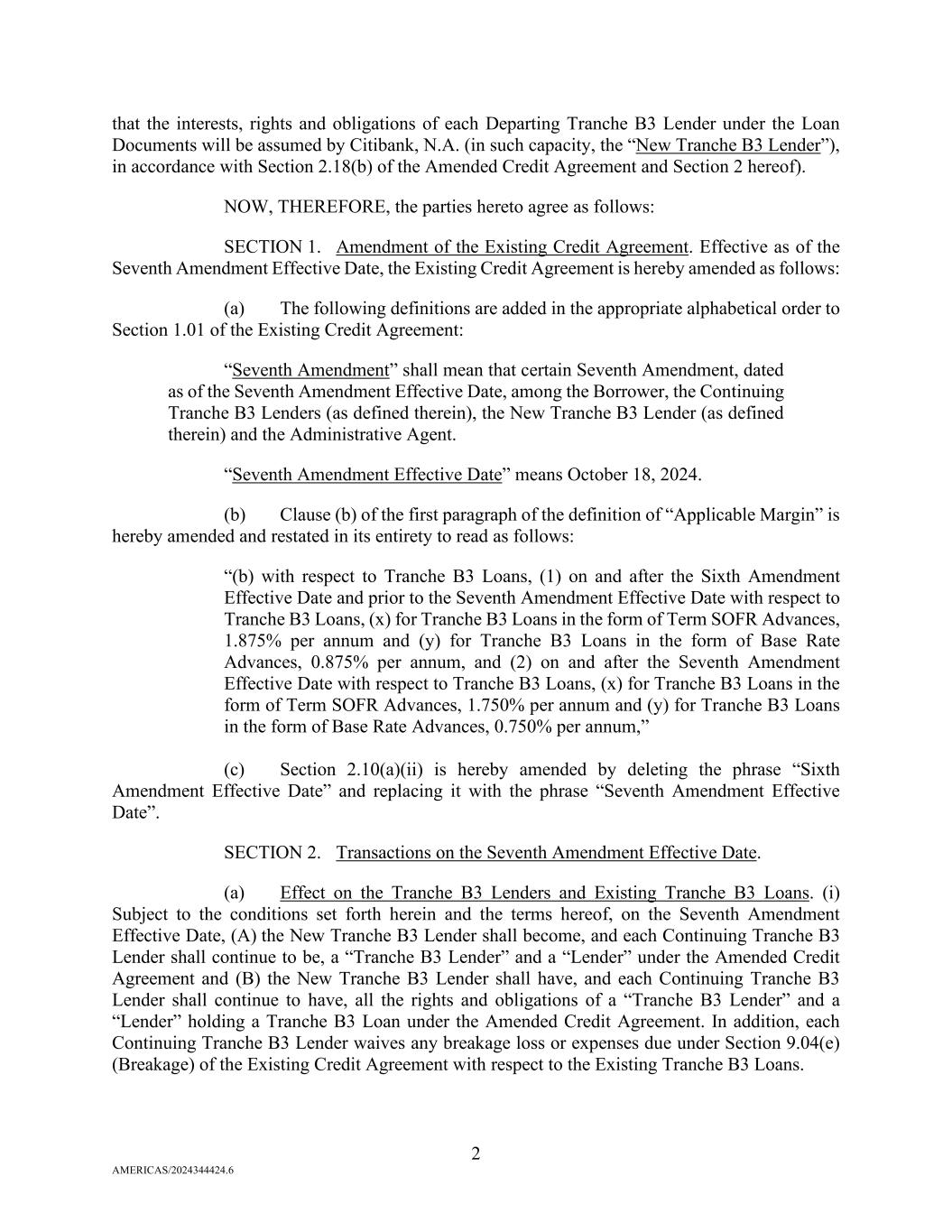 2 AMERICAS/2024344424.6 that the interests, rights and obligations of each Departing Tranche B3 Lender under the Loan Documents will be assumed by Citibank, N.A. (in such capacity, the “New Tranche B3 Lender”), in accordance with Section 2.18(b) of the Amended Credit Agreement and Section 2 hereof). NOW, THEREFORE, the parties hereto agree as follows: SECTION 1. Amendment of the Existing Credit Agreement. Effective as of the Seventh Amendment Effective Date, the Existing Credit Agreement is hereby amended as follows: (a) The following definitions are added in the appropriate alphabetical order to Section 1.01 of the Existing Credit Agreement: “Seventh Amendment” shall mean that certain Seventh Amendment, dated as of the Seventh Amendment Effective Date, among the Borrower, the Continuing Tranche B3 Lenders (as defined therein), the New Tranche B3 Lender (as defined therein) and the Administrative Agent. “Seventh Amendment Effective Date” means October 18, 2024. (b) Clause (b) of the first paragraph of the definition of “Applicable Margin” is hereby amended and restated in its entirety to read as follows: “(b) with respect to Tranche B3 Loans, (1) on and after the Sixth Amendment Effective Date and prior to the Seventh Amendment Effective Date with respect to Tranche B3 Loans, (x) for Tranche B3 Loans in the form of Term SOFR Advances, 1.875% per annum and (y) for Tranche B3 Loans in the form of Base Rate Advances, 0.875% per annum, and (2) on and after the Seventh Amendment Effective Date with respect to Tranche B3 Loans, (x) for Tranche B3 Loans in the form of Term SOFR Advances, 1.750% per annum and (y) for Tranche B3 Loans in the form of Base Rate Advances, 0.750% per annum,” (c) Section 2.10(a)(ii) is hereby amended by deleting the phrase “Sixth Amendment Effective Date” and replacing it with the phrase “Seventh Amendment Effective Date”. SECTION 2. Transactions on the Seventh Amendment Effective Date. (a) Effect on the Tranche B3 Lenders and Existing Tranche B3 Loans. (i) Subject to the conditions set forth herein and the terms hereof, on the Seventh Amendment Effective Date, (A) the New Tranche B3 Lender shall become, and each Continuing Tranche B3 Lender shall continue to be, a “Tranche B3 Lender” and a “Lender” under the Amended Credit Agreement and (B) the New Tranche B3 Lender shall have, and each Continuing Tranche B3 Lender shall continue to have, all the rights and obligations of a “Tranche B3 Lender” and a “Lender” holding a Tranche B3 Loan under the Amended Credit Agreement. In addition, each Continuing Tranche B3 Lender waives any breakage loss or expenses due under Section 9.04(e) (Breakage) of the Existing Credit Agreement with respect to the Existing Tranche B3 Loans.