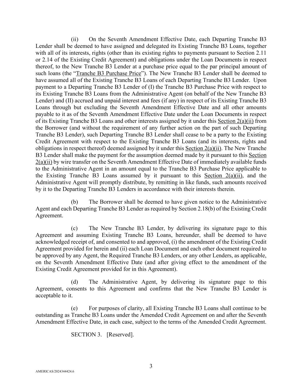3 AMERICAS/2024344424.6 (ii) On the Seventh Amendment Effective Date, each Departing Tranche B3 Lender shall be deemed to have assigned and delegated its Existing Tranche B3 Loans, together with all of its interests, rights (other than its existing rights to payments pursuant to Section 2.11 or 2.14 of the Existing Credit Agreement) and obligations under the Loan Documents in respect thereof, to the New Tranche B3 Lender at a purchase price equal to the par principal amount of such loans (the “Tranche B3 Purchase Price”). The New Tranche B3 Lender shall be deemed to have assumed all of the Existing Tranche B3 Loans of each Departing Tranche B3 Lender. Upon payment to a Departing Tranche B3 Lender of (I) the Tranche B3 Purchase Price with respect to its Existing Tranche B3 Loans from the Administrative Agent (on behalf of the New Tranche B3 Lender) and (II) accrued and unpaid interest and fees (if any) in respect of its Existing Tranche B3 Loans through but excluding the Seventh Amendment Effective Date and all other amounts payable to it as of the Seventh Amendment Effective Date under the Loan Documents in respect of its Existing Tranche B3 Loans and other interests assigned by it under this Section 2(a)(ii) from the Borrower (and without the requirement of any further action on the part of such Departing Tranche B3 Lender), such Departing Tranche B3 Lender shall cease to be a party to the Existing Credit Agreement with respect to the Existing Tranche B3 Loans (and its interests, rights and obligations in respect thereof) deemed assigned by it under this Section 2(a)(ii). The New Tranche B3 Lender shall make the payment for the assumption deemed made by it pursuant to this Section 2(a)(ii) by wire transfer on the Seventh Amendment Effective Date of immediately available funds to the Administrative Agent in an amount equal to the Tranche B3 Purchase Price applicable to the Existing Tranche B3 Loans assumed by it pursuant to this Section 2(a)(ii), and the Administrative Agent will promptly distribute, by remitting in like funds, such amounts received by it to the Departing Tranche B3 Lenders in accordance with their interests therein. (b) The Borrower shall be deemed to have given notice to the Administrative Agent and each Departing Tranche B3 Lender as required by Section 2.18(b) of the Existing Credit Agreement. (c) The New Tranche B3 Lender, by delivering its signature page to this Agreement and assuming Existing Tranche B3 Loans, hereunder, shall be deemed to have acknowledged receipt of, and consented to and approved, (i) the amendment of the Existing Credit Agreement provided for herein and (ii) each Loan Document and each other document required to be approved by any Agent, the Required Tranche B3 Lenders, or any other Lenders, as applicable, on the Seventh Amendment Effective Date (and after giving effect to the amendment of the Existing Credit Agreement provided for in this Agreement). (d) The Administrative Agent, by delivering its signature page to this Agreement, consents to this Agreement and confirms that the New Tranche B3 Lender is acceptable to it. (e) For purposes of clarity, all Existing Tranche B3 Loans shall continue to be outstanding as Tranche B3 Loans under the Amended Credit Agreement on and after the Seventh Amendment Effective Date, in each case, subject to the terms of the Amended Credit Agreement. SECTION 3. [Reserved].