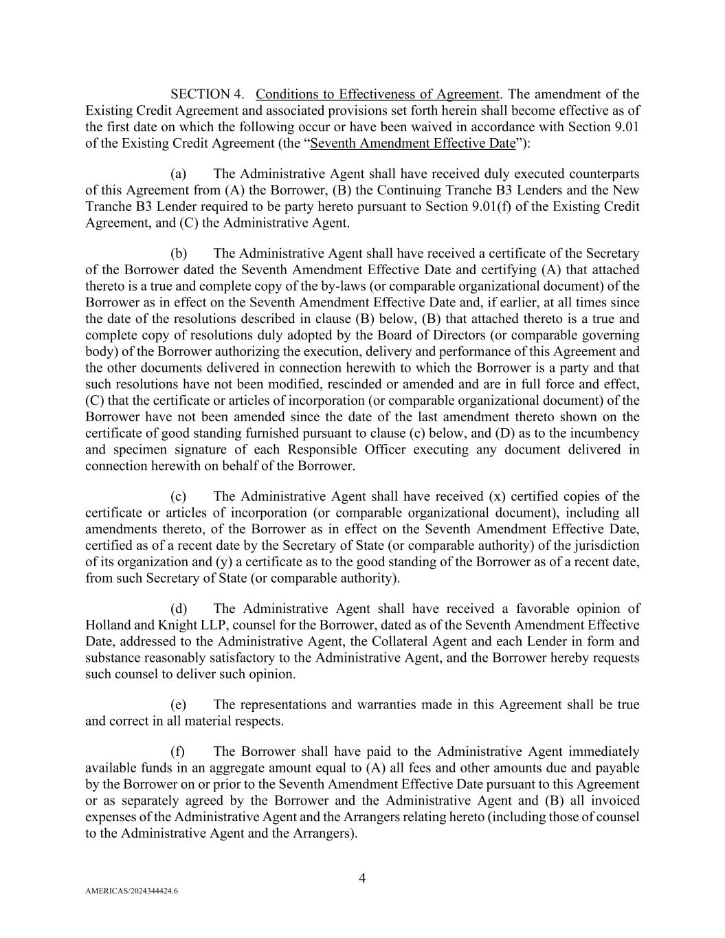 4 AMERICAS/2024344424.6 SECTION 4. Conditions to Effectiveness of Agreement. The amendment of the Existing Credit Agreement and associated provisions set forth herein shall become effective as of the first date on which the following occur or have been waived in accordance with Section 9.01 of the Existing Credit Agreement (the “Seventh Amendment Effective Date”): (a) The Administrative Agent shall have received duly executed counterparts of this Agreement from (A) the Borrower, (B) the Continuing Tranche B3 Lenders and the New Tranche B3 Lender required to be party hereto pursuant to Section 9.01(f) of the Existing Credit Agreement, and (C) the Administrative Agent. (b) The Administrative Agent shall have received a certificate of the Secretary of the Borrower dated the Seventh Amendment Effective Date and certifying (A) that attached thereto is a true and complete copy of the by-laws (or comparable organizational document) of the Borrower as in effect on the Seventh Amendment Effective Date and, if earlier, at all times since the date of the resolutions described in clause (B) below, (B) that attached thereto is a true and complete copy of resolutions duly adopted by the Board of Directors (or comparable governing body) of the Borrower authorizing the execution, delivery and performance of this Agreement and the other documents delivered in connection herewith to which the Borrower is a party and that such resolutions have not been modified, rescinded or amended and are in full force and effect, (C) that the certificate or articles of incorporation (or comparable organizational document) of the Borrower have not been amended since the date of the last amendment thereto shown on the certificate of good standing furnished pursuant to clause (c) below, and (D) as to the incumbency and specimen signature of each Responsible Officer executing any document delivered in connection herewith on behalf of the Borrower. (c) The Administrative Agent shall have received (x) certified copies of the certificate or articles of incorporation (or comparable organizational document), including all amendments thereto, of the Borrower as in effect on the Seventh Amendment Effective Date, certified as of a recent date by the Secretary of State (or comparable authority) of the jurisdiction of its organization and (y) a certificate as to the good standing of the Borrower as of a recent date, from such Secretary of State (or comparable authority). (d) The Administrative Agent shall have received a favorable opinion of Holland and Knight LLP, counsel for the Borrower, dated as of the Seventh Amendment Effective Date, addressed to the Administrative Agent, the Collateral Agent and each Lender in form and substance reasonably satisfactory to the Administrative Agent, and the Borrower hereby requests such counsel to deliver such opinion. (e) The representations and warranties made in this Agreement shall be true and correct in all material respects. (f) The Borrower shall have paid to the Administrative Agent immediately available funds in an aggregate amount equal to (A) all fees and other amounts due and payable by the Borrower on or prior to the Seventh Amendment Effective Date pursuant to this Agreement or as separately agreed by the Borrower and the Administrative Agent and (B) all invoiced expenses of the Administrative Agent and the Arrangers relating hereto (including those of counsel to the Administrative Agent and the Arrangers).