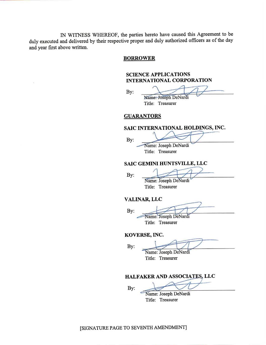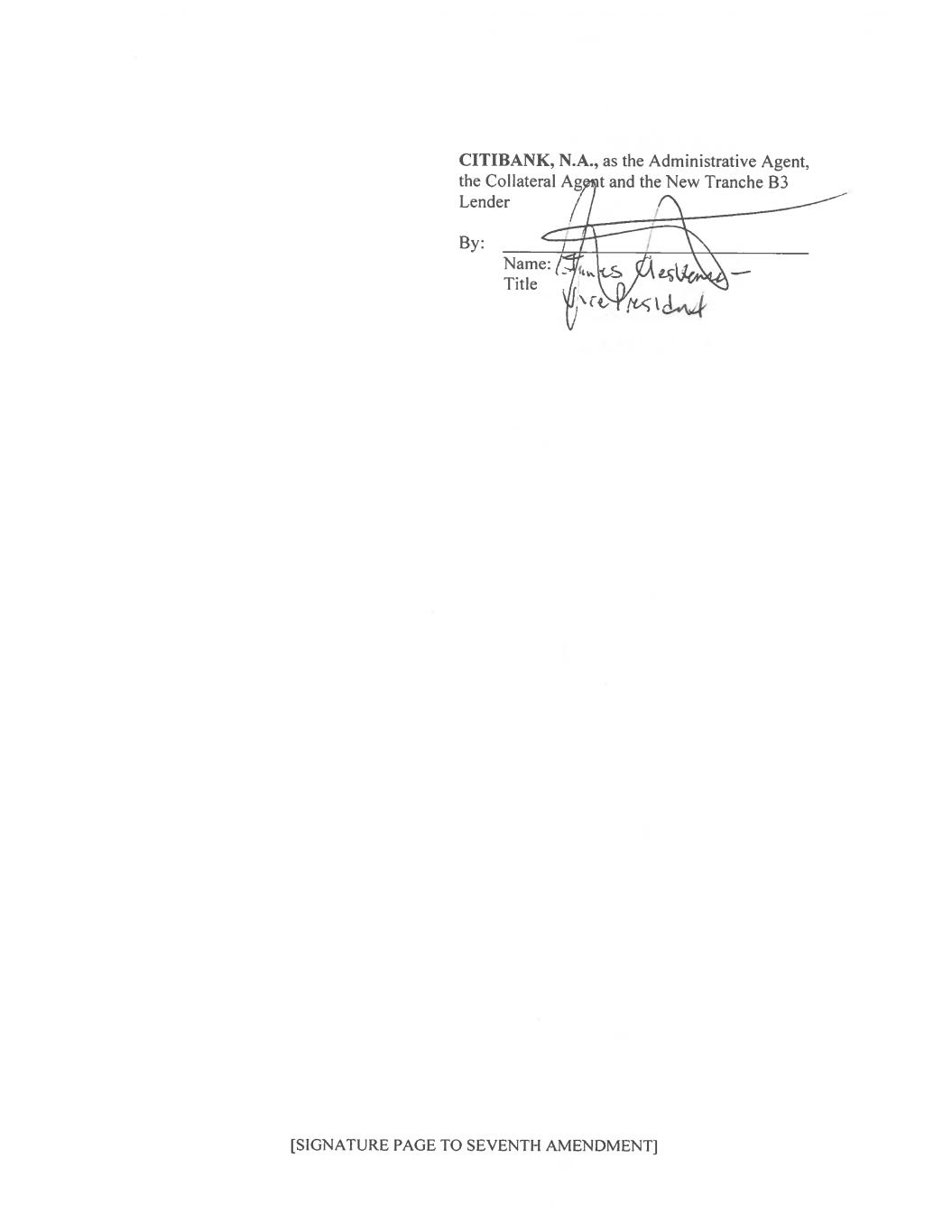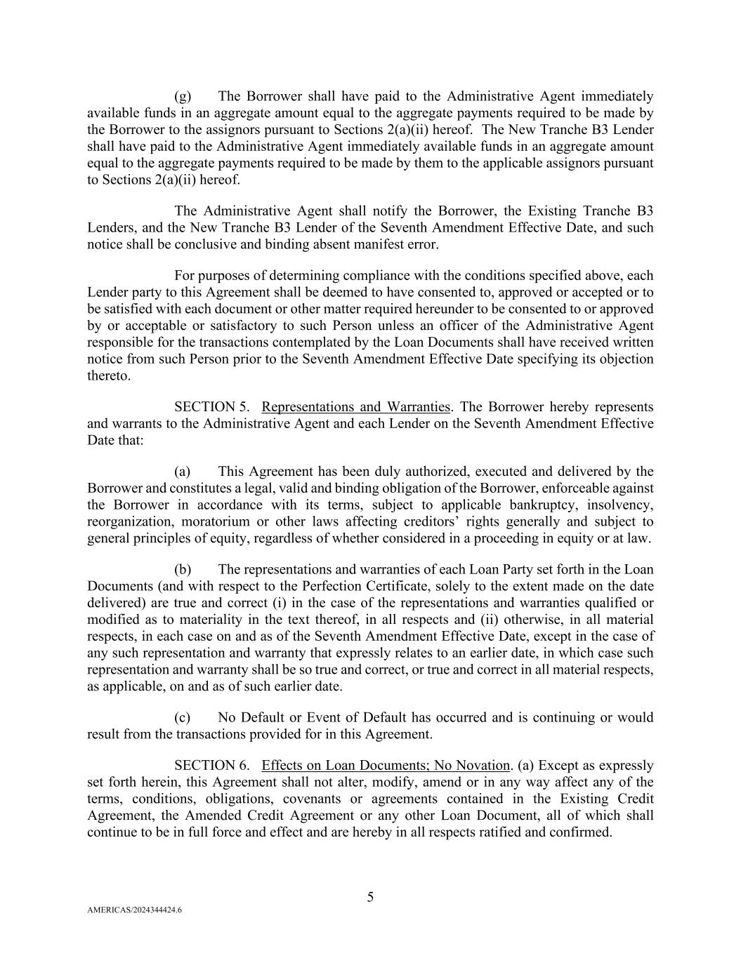 5 AMERICAS/2024344424.6 (g) The Borrower shall have paid to the Administrative Agent immediately available funds in an aggregate amount equal to the aggregate payments required to be made by the Borrower to the assignors pursuant to Sections 2(a)(ii) hereof. The New Tranche B3 Lender shall have paid to the Administrative Agent immediately available funds in an aggregate amount equal to the aggregate payments required to be made by them to the applicable assignors pursuant to Sections 2(a)(ii) hereof. The Administrative Agent shall notify the Borrower, the Existing Tranche B3 Lenders, and the New Tranche B3 Lender of the Seventh Amendment Effective Date, and such notice shall be conclusive and binding absent manifest error. For purposes of determining compliance with the conditions specified above, each Lender party to this Agreement shall be deemed to have consented to, approved or accepted or to be satisfied with each document or other matter required hereunder to be consented to or approved by or acceptable or satisfactory to such Person unless an officer of the Administrative Agent responsible for the transactions contemplated by the Loan Documents shall have received written notice from such Person prior to the Seventh Amendment Effective Date specifying its objection thereto. SECTION 5. Representations and Warranties. The Borrower hereby represents and warrants to the Administrative Agent and each Lender on the Seventh Amendment Effective Date that: (a) This Agreement has been duly authorized, executed and delivered by the Borrower and constitutes a legal, valid and binding obligation of the Borrower, enforceable against the Borrower in accordance with its terms, subject to applicable bankruptcy, insolvency, reorganization, moratorium or other laws affecting creditors’ rights generally and subject to general principles of equity, regardless of whether considered in a proceeding in equity or at law. (b) The representations and warranties of each Loan Party set forth in the Loan Documents (and with respect to the Perfection Certificate, solely to the extent made on the date delivered) are true and correct (i) in the case of the representations and warranties qualified or modified as to materiality in the text thereof, in all respects and (ii) otherwise, in all material respects, in each case on and as of the Seventh Amendment Effective Date, except in the case of any such representation and warranty that expressly relates to an earlier date, in which case such representation and warranty shall be so true and correct, or true and correct in all material respects, as applicable, on and as of such earlier date. (c) No Default or Event of Default has occurred and is continuing or would result from the transactions provided for in this Agreement. SECTION 6. Effects on Loan Documents; No Novation. (a) Except as expressly set forth herein, this Agreement shall not alter, modify, amend or in any way affect any of the terms, conditions, obligations, covenants or agreements contained in the Existing Credit Agreement, the Amended Credit Agreement or any other Loan Document, all of which shall continue to be in full force and effect and are hereby in all respects ratified and confirmed.
