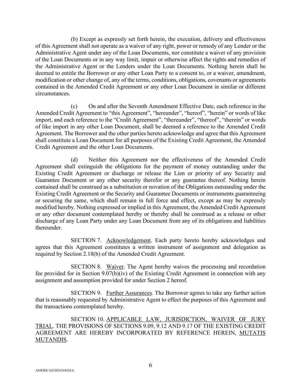 6 AMERICAS/2024344424.6 (b) Except as expressly set forth herein, the execution, delivery and effectiveness of this Agreement shall not operate as a waiver of any right, power or remedy of any Lender or the Administrative Agent under any of the Loan Documents, nor constitute a waiver of any provision of the Loan Documents or in any way limit, impair or otherwise affect the rights and remedies of the Administrative Agent or the Lenders under the Loan Documents. Nothing herein shall be deemed to entitle the Borrower or any other Loan Party to a consent to, or a waiver, amendment, modification or other change of, any of the terms, conditions, obligations, covenants or agreements contained in the Amended Credit Agreement or any other Loan Document in similar or different circumstances. (c) On and after the Seventh Amendment Effective Date, each reference in the Amended Credit Agreement to “this Agreement”, “hereunder”, “hereof”, “herein” or words of like import, and each reference to the “Credit Agreement”, “thereunder”, “thereof”, “therein” or words of like import in any other Loan Document, shall be deemed a reference to the Amended Credit Agreement. The Borrower and the other parties hereto acknowledge and agree that this Agreement shall constitute a Loan Document for all purposes of the Existing Credit Agreement, the Amended Credit Agreement and the other Loan Documents. (d) Neither this Agreement nor the effectiveness of the Amended Credit Agreement shall extinguish the obligations for the payment of money outstanding under the Existing Credit Agreement or discharge or release the Lien or priority of any Security and Guarantee Document or any other security therefor or any guarantee thereof. Nothing herein contained shall be construed as a substitution or novation of the Obligations outstanding under the Existing Credit Agreement or the Security and Guarantee Documents or instruments guaranteeing or securing the same, which shall remain in full force and effect, except as may be expressly modified hereby. Nothing expressed or implied in this Agreement, the Amended Credit Agreement or any other document contemplated hereby or thereby shall be construed as a release or other discharge of any Loan Party under any Loan Document from any of its obligations and liabilities thereunder. SECTION 7. Acknowledgement. Each party hereto hereby acknowledges and agrees that this Agreement constitutes a written instrument of assignment and delegation as required by Section 2.18(b) of the Amended Credit Agreement. SECTION 8. Waiver. The Agent hereby waives the processing and recordation fee provided for in Section 9.07(b)(iv) of the Existing Credit Agreement in connection with any assignment and assumption provided for under Section 2 hereof. SECTION 9. Further Assurances. The Borrower agrees to take any further action that is reasonably requested by Administrative Agent to effect the purposes of this Agreement and the transactions contemplated hereby. SECTION 10. APPLICABLE LAW, JURISDICTION, WAIVER OF JURY TRIAL. THE PROVISIONS OF SECTIONS 9.09, 9.12 AND 9.17 OF THE EXISTING CREDIT AGREEMENT ARE HEREBY INCORPORATED BY REFERENCE HEREIN, MUTATIS MUTANDIS.
