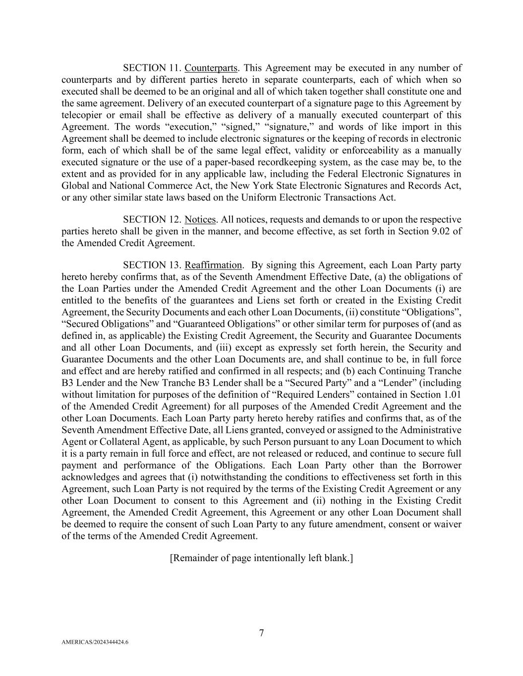 7 AMERICAS/2024344424.6 SECTION 11. Counterparts. This Agreement may be executed in any number of counterparts and by different parties hereto in separate counterparts, each of which when so executed shall be deemed to be an original and all of which taken together shall constitute one and the same agreement. Delivery of an executed counterpart of a signature page to this Agreement by telecopier or email shall be effective as delivery of a manually executed counterpart of this Agreement. The words “execution,” “signed,” “signature,” and words of like import in this Agreement shall be deemed to include electronic signatures or the keeping of records in electronic form, each of which shall be of the same legal effect, validity or enforceability as a manually executed signature or the use of a paper-based recordkeeping system, as the case may be, to the extent and as provided for in any applicable law, including the Federal Electronic Signatures in Global and National Commerce Act, the New York State Electronic Signatures and Records Act, or any other similar state laws based on the Uniform Electronic Transactions Act. SECTION 12. Notices. All notices, requests and demands to or upon the respective parties hereto shall be given in the manner, and become effective, as set forth in Section 9.02 of the Amended Credit Agreement. SECTION 13. Reaffirmation. By signing this Agreement, each Loan Party party hereto hereby confirms that, as of the Seventh Amendment Effective Date, (a) the obligations of the Loan Parties under the Amended Credit Agreement and the other Loan Documents (i) are entitled to the benefits of the guarantees and Liens set forth or created in the Existing Credit Agreement, the Security Documents and each other Loan Documents, (ii) constitute “Obligations”, “Secured Obligations” and “Guaranteed Obligations” or other similar term for purposes of (and as defined in, as applicable) the Existing Credit Agreement, the Security and Guarantee Documents and all other Loan Documents, and (iii) except as expressly set forth herein, the Security and Guarantee Documents and the other Loan Documents are, and shall continue to be, in full force and effect and are hereby ratified and confirmed in all respects; and (b) each Continuing Tranche B3 Lender and the New Tranche B3 Lender shall be a “Secured Party” and a “Lender” (including without limitation for purposes of the definition of “Required Lenders” contained in Section 1.01 of the Amended Credit Agreement) for all purposes of the Amended Credit Agreement and the other Loan Documents. Each Loan Party party hereto hereby ratifies and confirms that, as of the Seventh Amendment Effective Date, all Liens granted, conveyed or assigned to the Administrative Agent or Collateral Agent, as applicable, by such Person pursuant to any Loan Document to which it is a party remain in full force and effect, are not released or reduced, and continue to secure full payment and performance of the Obligations. Each Loan Party other than the Borrower acknowledges and agrees that (i) notwithstanding the conditions to effectiveness set forth in this Agreement, such Loan Party is not required by the terms of the Existing Credit Agreement or any other Loan Document to consent to this Agreement and (ii) nothing in the Existing Credit Agreement, the Amended Credit Agreement, this Agreement or any other Loan Document shall be deemed to require the consent of such Loan Party to any future amendment, consent or waiver of the terms of the Amended Credit Agreement. [Remainder of page intentionally left blank.]