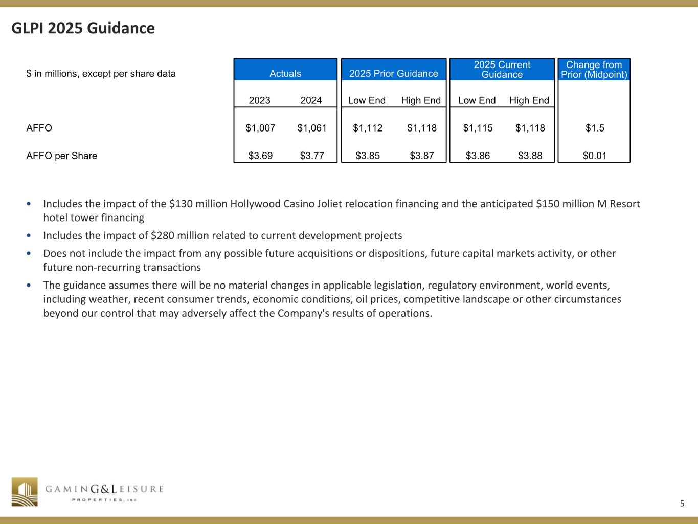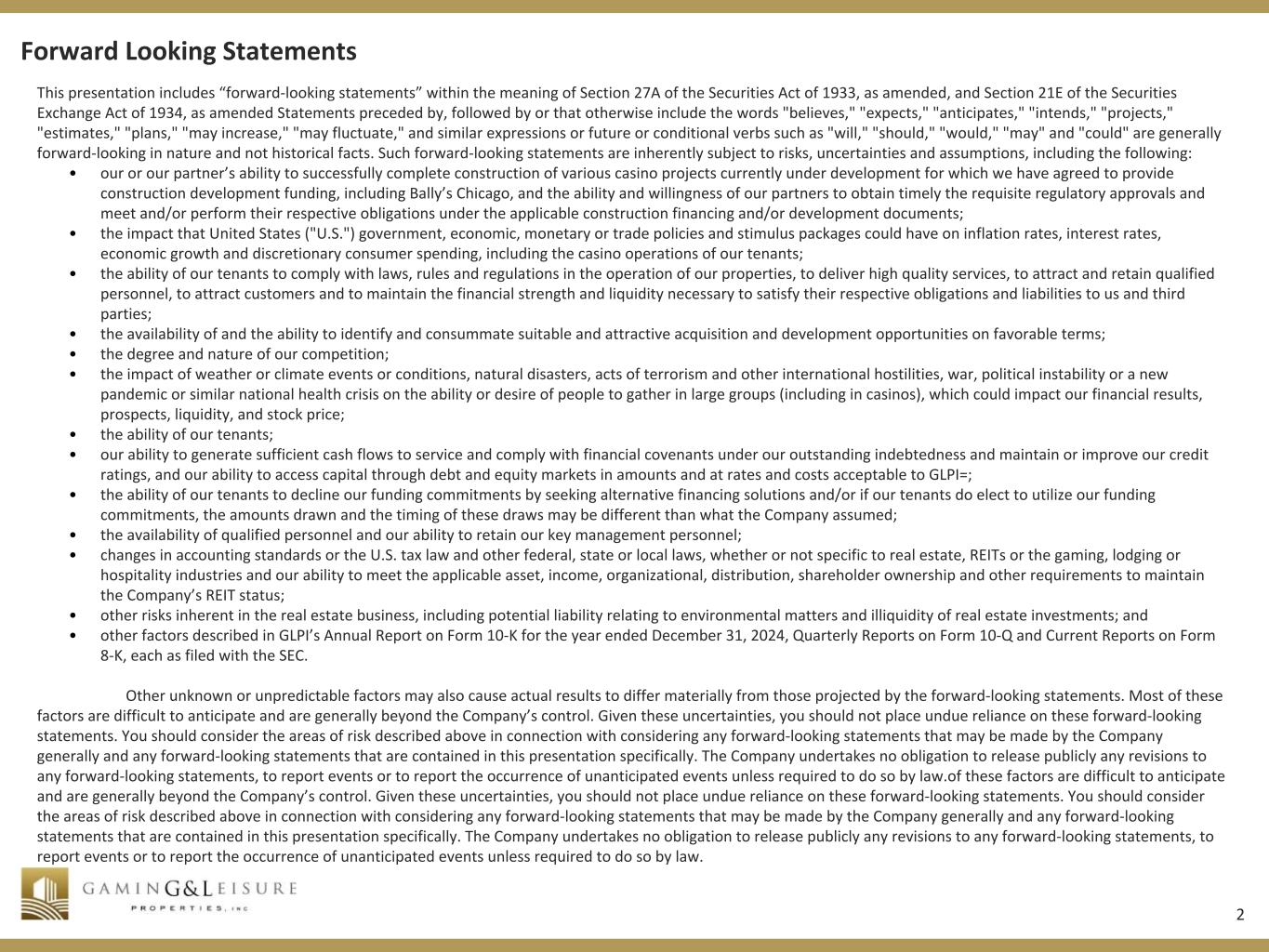 2 R 41 G 41 B 41 R 255 G 255 B 255 R 207 G 182 B 103 R 163 G 131 B 56 R 31 G 73 B 125 R 144 G 124 B 75 R 79 G 129 B 189 R 235 G 235 B 237 R 128 G 100 B 162 R 199 G 198 B 215 This presentation includes “forward-looking statements” within the meaning of Section 27A of the Securities Act of 1933, as amended, and Section 21E of the Securities Exchange Act of 1934, as amended Statements preceded by, followed by or that otherwise include the words "believes," "expects," "anticipates," "intends," "projects," "estimates," "plans," "may increase," "may fluctuate," and similar expressions or future or conditional verbs such as "will," "should," "would," "may" and "could" are generally forward-looking in nature and not historical facts. Such forward-looking statements are inherently subject to risks, uncertainties and assumptions, including the following: • our or our partner’s ability to successfully complete construction of various casino projects currently under development for which we have agreed to provide construction development funding, including Bally’s Chicago, and the ability and willingness of our partners to obtain timely the requisite regulatory approvals and meet and/or perform their respective obligations under the applicable construction financing and/or development documents; • the impact that United States ("U.S.") government, economic, monetary or trade policies and stimulus packages could have on inflation rates, interest rates, economic growth and discretionary consumer spending, including the casino operations of our tenants; • the ability of our tenants to comply with laws, rules and regulations in the operation of our properties, to deliver high quality services, to attract and retain qualified personnel, to attract customers and to maintain the financial strength and liquidity necessary to satisfy their respective obligations and liabilities to us and third parties; • the availability of and the ability to identify and consummate suitable and attractive acquisition and development opportunities on favorable terms; • the degree and nature of our competition; • the impact of weather or climate events or conditions, natural disasters, acts of terrorism and other international hostilities, war, political instability or a new pandemic or similar national health crisis on the ability or desire of people to gather in large groups (including in casinos), which could impact our financial results, prospects, liquidity, and stock price; • the ability of our tenants; • our ability to generate sufficient cash flows to service and comply with financial covenants under our outstanding indebtedness and maintain or improve our credit ratings, and our ability to access capital through debt and equity markets in amounts and at rates and costs acceptable to GLPI=; • the ability of our tenants to decline our funding commitments by seeking alternative financing solutions and/or if our tenants do elect to utilize our funding commitments, the amounts drawn and the timing of these draws may be different than what the Company assumed; • the availability of qualified personnel and our ability to retain our key management personnel; • changes in accounting standards or the U.S. tax law and other federal, state or local laws, whether or not specific to real estate, REITs or the gaming, lodging or hospitality industries and our ability to meet the applicable asset, income, organizational, distribution, shareholder ownership and other requirements to maintain the Company’s REIT status; • other risks inherent in the real estate business, including potential liability relating to environmental matters and illiquidity of real estate investments; and • other factors described in GLPI’s Annual Report on Form 10-K for the year ended December 31, 2024, Quarterly Reports on Form 10-Q and Current Reports on Form 8-K, each as filed with the SEC. Other unknown or unpredictable factors may also cause actual results to differ materially from those projected by the forward-looking statements. Most of these factors are difficult to anticipate and are generally beyond the Company’s control. Given these uncertainties, you should not place undue reliance on these forward-looking statements. You should consider the areas of risk described above in connection with considering any forward-looking statements that may be made by the Company generally and any forward-looking statements that are contained in this presentation specifically. The Company undertakes no obligation to release publicly any revisions to any forward-looking statements, to report events or to report the occurrence of unanticipated events unless required to do so by law.of these factors are difficult to anticipate and are generally beyond the Company’s control. Given these uncertainties, you should not place undue reliance on these forward-looking statements. You should consider the areas of risk described above in connection with considering any forward-looking statements that may be made by the Company generally and any forward-looking statements that are contained in this presentation specifically. The Company undertakes no obligation to release publicly any revisions to any forward-looking statements, to report events or to report the occurrence of unanticipated events unless required to do so by law. Forward Looking Statements