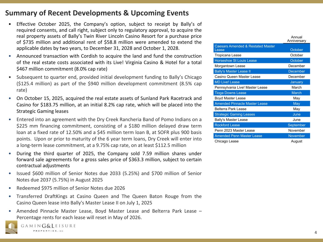 4 R 41 G 41 B 41 R 255 G 255 B 255 R 207 G 182 B 103 R 163 G 131 B 56 R 31 G 73 B 125 R 144 G 124 B 75 R 79 G 129 B 189 R 235 G 235 B 237 R 128 G 100 B 162 R 199 G 198 B 215 Summary of Recent Developments & Upcoming Events • Effective October 2025, the Company’s option, subject to receipt by Bally’s of required consents, and call right, subject only to regulatory approval, to acquire the real property assets of Bally’s Twin River Lincoln Casino Resort for a purchase price of $735 million and additional rent of $58.8 million were amended to extend the applicable dates by two years, to December 31, 2028 and October 1, 2028. • Announced transaction with Cordish to acquire the land and fund the construction of the real estate costs associated with its Live! Virginia Casino & Hotel for a total $467 million commitment (8.0% cap rate) • Subsequent to quarter end, provided initial development funding to Bally’s Chicago ($125.4 million) as part of the $940 million development commitment (8.5% cap rate) • On October 15, 2025, acquired the real estate assets of Sunland Park Racetrack and Casino for $183.75 million, at an initial 8.2% cap rate, which will be placed into the Strategic Gaming leases • Entered into an agreement with the Dry Creek Rancheria Band of Pomo Indians on a $225 mm financing commitment, consisting of a $180 million delayed draw term loan at a fixed rate of 12.50% and a $45 million term loan B, at SOFR plus 900 basis points. Upon or prior to maturity of the 6 year term loans, Dry Creek will enter into a long-term lease commitment, at a 9.75% cap rate, on at least $112.5 million • During the third quarter of 2025, the Company sold 7.59 million shares under forward sale agreements for a gross sales price of $363.3 million, subject to certain contractual adjustments • Issued $600 million of Senior Notes due 2033 (5.25%) and $700 million of Senior Notes due 2037 (5.75%) in August 2025 • Redeemed $975 million of Senior Notes due 2026 • Transferred DraftKings at Casino Queen and The Queen Baton Rouge from the Casino Queen lease into Bally's Master Lease II on July 1, 2025 • Amended Pinnacle Master Lease, Boyd Master Lease and Belterra Park Lease – Percentage rents for each lease will reset in May of 2026. Annual Anniversary Caesars Amended & Restated Master Lease October Tropicana Lease October Horseshoe St Louis Lease October Morgantown Lease December Bally's Master Lease II December Casino Queen Master Lease December MD Live! Lease January Pennsylvania Live! Master Lease March Tioga Downs Lease March Boyd Master Lease May Amended Pinnacle Master Lease May Belterra Park Lease May Strategic Gaming Leases June Bally's Master Lease June Rockford Lease September Penn 2023 Master Lease November Amended Penn Master Lease November Chicago Lease August