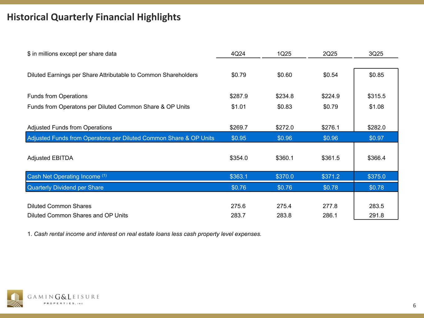 5 R 41 G 41 B 41 R 255 G 255 B 255 R 207 G 182 B 103 R 163 G 131 B 56 R 31 G 73 B 125 R 144 G 124 B 75 R 79 G 129 B 189 R 235 G 235 B 237 R 128 G 100 B 162 R 199 G 198 B 215 GLPI 2025 Guidance • Includes the impact of the $130 million Hollywood Casino Joliet relocation financing and the anticipated $150 million M Resort hotel tower financing • Includes the impact of $280 million related to current development projects • Does not include the impact from any possible future acquisitions or dispositions, future capital markets activity, or other future non-recurring transactions • The guidance assumes there will be no material changes in applicable legislation, regulatory environment, world events, including weather, recent consumer trends, economic conditions, oil prices, competitive landscape or other circumstances beyond our control that may adversely affect the Company's results of operations. $ in millions, except per share data Actuals 2025 Prior Guidance 2025 Current Guidance Change from Prior (Midpoint) 2023 2024 Low End High End Low End High End AFFO $1,007 $1,061 $1,112 $1,118 $1,115 $1,118 $1.5 AFFO per Share $3.69 $3.77 $3.85 $3.87 $3.86 $3.88 $0.01