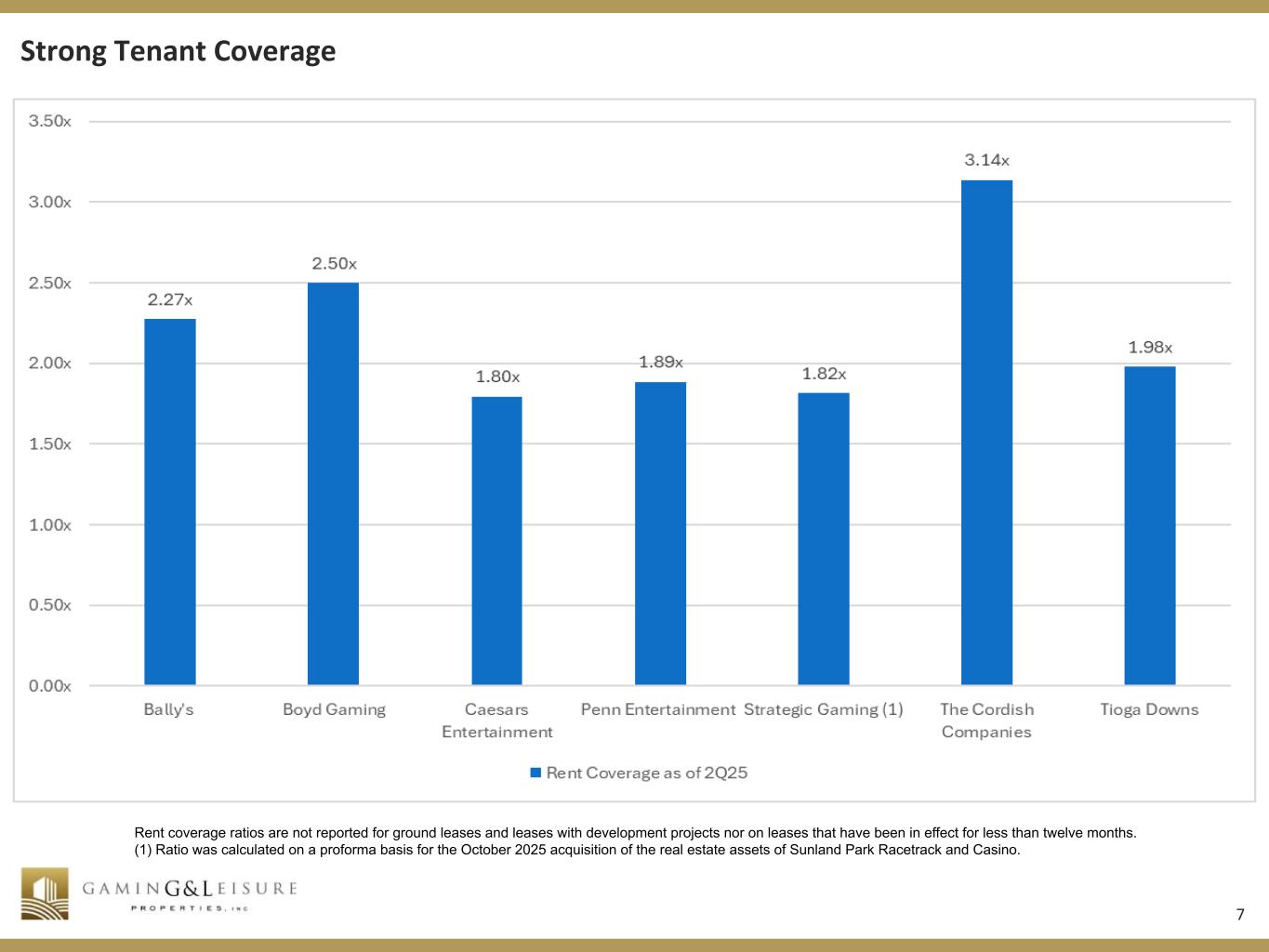 7 R 41 G 41 B 41 R 255 G 255 B 255 R 207 G 182 B 103 R 163 G 131 B 56 R 31 G 73 B 125 R 144 G 124 B 75 R 79 G 129 B 189 R 235 G 235 B 237 R 128 G 100 B 162 R 199 G 198 B 215 Strong Tenant Coverage Rent coverage ratios are not reported for ground leases and leases with development projects nor on leases that have been in effect for less than twelve months. (1) Ratio was calculated on a proforma basis for the October 2025 acquisition of the real estate assets of Sunland Park Racetrack and Casino.