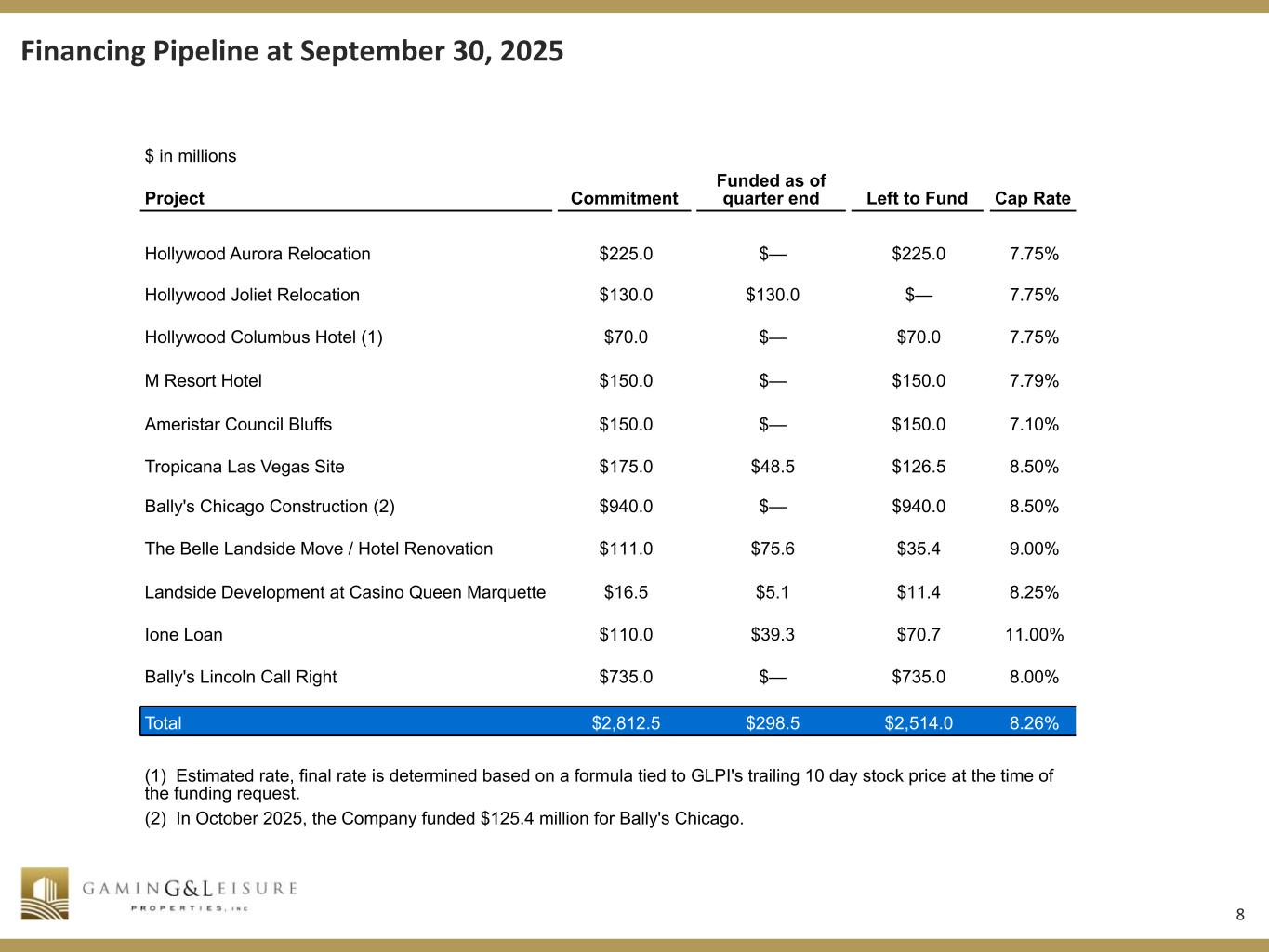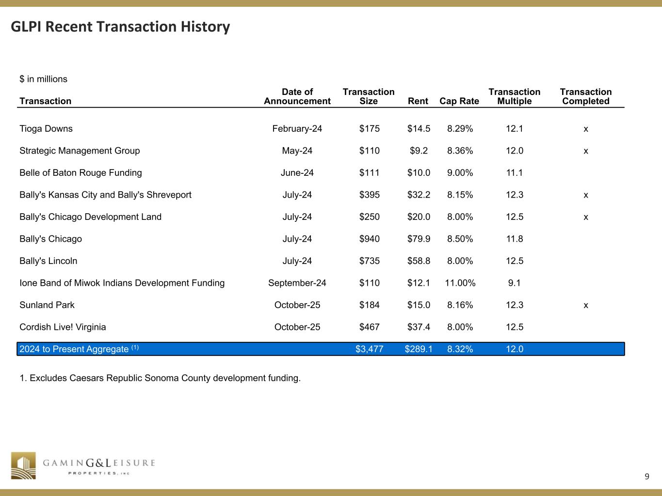 8 R 41 G 41 B 41 R 255 G 255 B 255 R 207 G 182 B 103 R 163 G 131 B 56 R 31 G 73 B 125 R 144 G 124 B 75 R 79 G 129 B 189 R 235 G 235 B 237 R 128 G 100 B 162 R 199 G 198 B 215 Financing Pipeline at September 30, 2025 $ in millions Project Commitment Funded as of quarter end Left to Fund Cap Rate Hollywood Aurora Relocation $225.0 $— $225.0 7.75% Hollywood Joliet Relocation $130.0 $130.0 $— 7.75% Hollywood Columbus Hotel (1) $70.0 $— $70.0 7.75% M Resort Hotel $150.0 $— $150.0 7.79% Ameristar Council Bluffs $150.0 $— $150.0 7.10% Tropicana Las Vegas Site $175.0 $48.5 $126.5 8.50% Bally's Chicago Construction (2) $940.0 $— $940.0 8.50% The Belle Landside Move / Hotel Renovation $111.0 $75.6 $35.4 9.00% Landside Development at Casino Queen Marquette $16.5 $5.1 $11.4 8.25% Ione Loan $110.0 $39.3 $70.7 11.00% Bally's Lincoln Call Right $735.0 $— $735.0 8.00% Total $2,812.5 $298.5 $2,514.0 8.26% (1) Estimated rate, final rate is determined based on a formula tied to GLPI's trailing 10 day stock price at the time of the funding request. (2) In October 2025, the Company funded $125.4 million for Bally's Chicago.