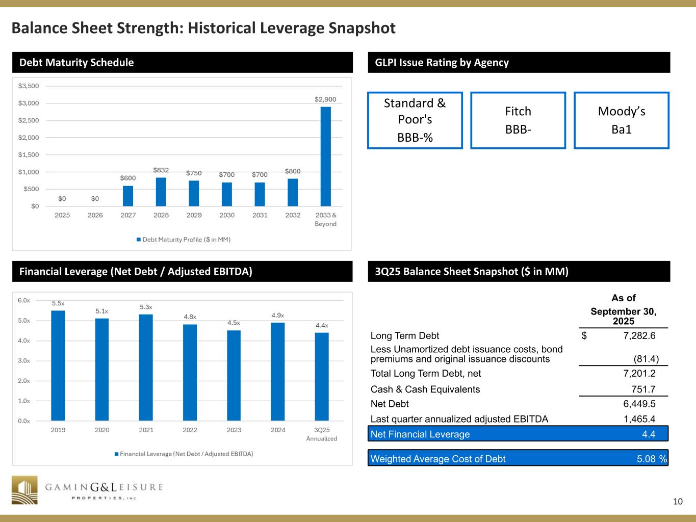 9 R 41 G 41 B 41 R 255 G 255 B 255 R 207 G 182 B 103 R 163 G 131 B 56 R 31 G 73 B 125 R 144 G 124 B 75 R 79 G 129 B 189 R 235 G 235 B 237 R 128 G 100 B 162 R 199 G 198 B 215 GLPI Recent Transaction History $ in millions Transaction Date of Announcement Transaction Size Rent Cap Rate Transaction Multiple Transaction Completed Tioga Downs February-24 $175 $14.5 8.29% 12.1 x Strategic Management Group May-24 $110 $9.2 8.36% 12.0 x Belle of Baton Rouge Funding June-24 $111 $10.0 9.00% 11.1 Bally's Kansas City and Bally's Shreveport July-24 $395 $32.2 8.15% 12.3 x Bally's Chicago Development Land July-24 $250 $20.0 8.00% 12.5 x Bally's Chicago July-24 $940 $79.9 8.50% 11.8 Bally's Lincoln July-24 $735 $58.8 8.00% 12.5 Ione Band of Miwok Indians Development Funding September-24 $110 $12.1 11.00% 9.1 Sunland Park October-25 $184 $15.0 8.16% 12.3 x Cordish Live! Virginia October-25 $467 $37.4 8.00% 12.5 2024 to Present Aggregate (1) $3,477 $289.1 8.32% 12.0 1. Excludes Caesars Republic Sonoma County development funding.