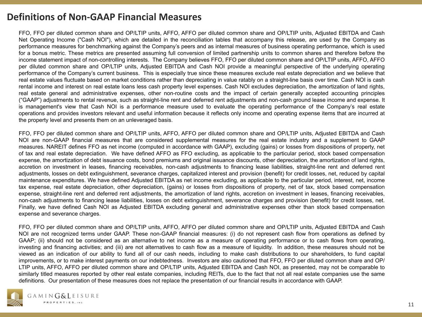 11 R 41 G 41 B 41 R 255 G 255 B 255 R 207 G 182 B 103 R 163 G 131 B 56 R 31 G 73 B 125 R 144 G 124 B 75 R 79 G 129 B 189 R 235 G 235 B 237 R 128 G 100 B 162 R 199 G 198 B 215 FFO, FFO per diluted common share and OP/LTIP units, AFFO, AFFO per diluted common share and OP/LTIP units, Adjusted EBITDA and Cash Net Operating Income ("Cash NOI"), which are detailed in the reconciliation tables that accompany this release, are used by the Company as performance measures for benchmarking against the Company’s peers and as internal measures of business operating performance, which is used for a bonus metric. These metrics are presented assuming full conversion of limited partnership units to common shares and therefore before the income statement impact of non-controlling interests. The Company believes FFO, FFO per diluted common share and OP/LTIP units, AFFO, AFFO per diluted common share and OP/LTIP units, Adjusted EBITDA and Cash NOI provide a meaningful perspective of the underlying operating performance of the Company’s current business. This is especially true since these measures exclude real estate depreciation and we believe that real estate values fluctuate based on market conditions rather than depreciating in value ratably on a straight-line basis over time. Cash NOI is cash rental income and interest on real estate loans less cash property level expenses. Cash NOI excludes depreciation, the amortization of land rights, real estate general and administrative expenses, other non-routine costs and the impact of certain generally accepted accounting principles (“GAAP”) adjustments to rental revenue, such as straight-line rent and deferred rent adjustments and non-cash ground lease income and expense. It is management's view that Cash NOI is a performance measure used to evaluate the operating performance of the Company’s real estate operations and provides investors relevant and useful information because it reflects only income and operating expense items that are incurred at the property level and presents them on an unleveraged basis. FFO, FFO per diluted common share and OP/LTIP units, AFFO, AFFO per diluted common share and OP/LTIP units, Adjusted EBITDA and Cash NOI are non-GAAP financial measures that are considered supplemental measures for the real estate industry and a supplement to GAAP measures. NAREIT defines FFO as net income (computed in accordance with GAAP), excluding (gains) or losses from dispositions of property, net of tax and real estate depreciation. We have defined AFFO as FFO excluding, as applicable to the particular period, stock based compensation expense, the amortization of debt issuance costs, bond premiums and original issuance discounts, other depreciation, the amortization of land rights, accretion on investment in leases, financing receivables, non-cash adjustments to financing lease liabilities, straight-line rent and deferred rent adjustments, losses on debt extinguishment, severance charges, capitalized interest and provision (benefit) for credit losses, net, reduced by capital maintenance expenditures. We have defined Adjusted EBITDA as net income excluding, as applicable to the particular period, interest, net, income tax expense, real estate depreciation, other depreciation, (gains) or losses from dispositions of property, net of tax, stock based compensation expense, straight-line rent and deferred rent adjustments, the amortization of land rights, accretion on investment in leases, financing receivables, non-cash adjustments to financing lease liabilities, losses on debt extinguishment, severance charges and provision (benefit) for credit losses, net. Finally, we have defined Cash NOI as Adjusted EBITDA excluding general and administrative expenses other than stock based compensation expense and severance charges. FFO, FFO per diluted common share and OP/LTIP units, AFFO, AFFO per diluted common share and OP/LTIP units, Adjusted EBITDA and Cash NOI are not recognized terms under GAAP. These non-GAAP financial measures: (i) do not represent cash flow from operations as defined by GAAP; (ii) should not be considered as an alternative to net income as a measure of operating performance or to cash flows from operating, investing and financing activities; and (iii) are not alternatives to cash flow as a measure of liquidity. In addition, these measures should not be viewed as an indication of our ability to fund all of our cash needs, including to make cash distributions to our shareholders, to fund capital improvements, or to make interest payments on our indebtedness. Investors are also cautioned that FFO, FFO per diluted common share and OP/ LTIP units, AFFO, AFFO per diluted common share and OP/LTIP units, Adjusted EBITDA and Cash NOI, as presented, may not be comparable to similarly titled measures reported by other real estate companies, including REITs, due to the fact that not all real estate companies use the same definitions. Our presentation of these measures does not replace the presentation of our financial results in accordance with GAAP. Definitions of Non-GAAP Financial Measures