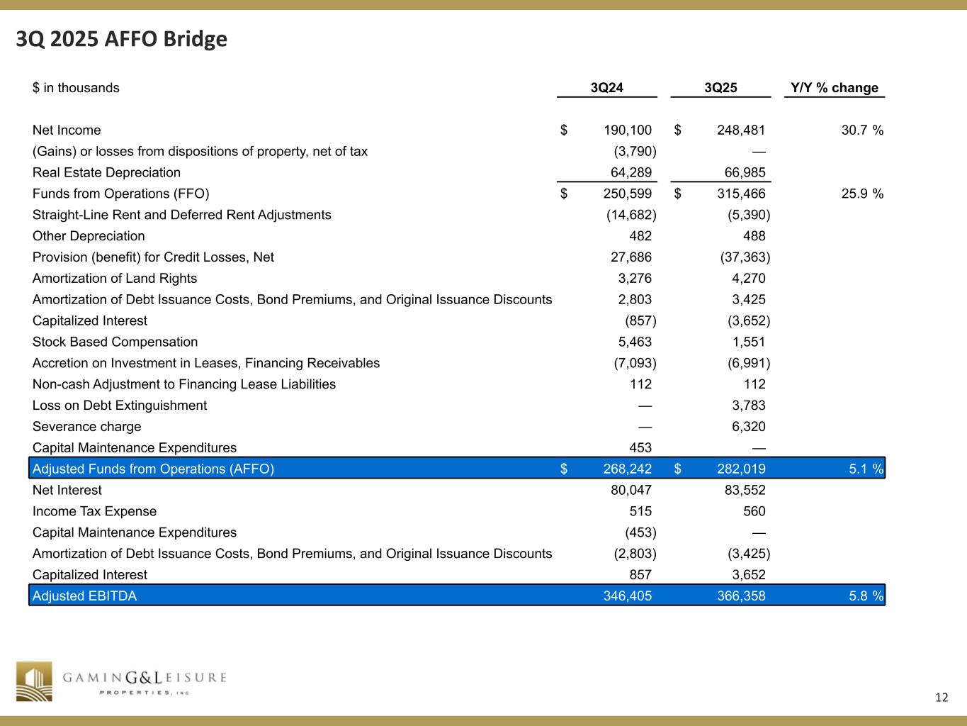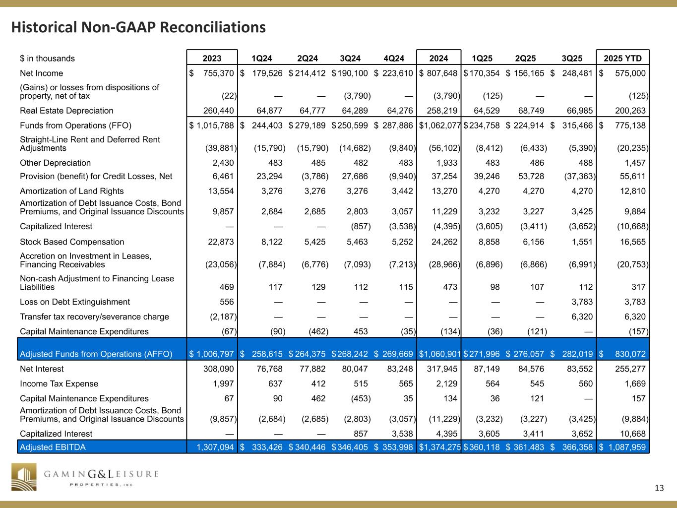 12 R 41 G 41 B 41 R 255 G 255 B 255 R 207 G 182 B 103 R 163 G 131 B 56 R 31 G 73 B 125 R 144 G 124 B 75 R 79 G 129 B 189 R 235 G 235 B 237 R 128 G 100 B 162 R 199 G 198 B 215 3Q 2025 AFFO Bridge $ in thousands 3Q24 3Q25 Y/Y % change Net Income $ 190,100 $ 248,481 30.7 % (Gains) or losses from dispositions of property, net of tax (3,790) — Real Estate Depreciation 64,289 66,985 Funds from Operations (FFO) $ 250,599 $ 315,466 25.9 % Straight-Line Rent and Deferred Rent Adjustments (14,682) (5,390) Other Depreciation 482 488 Provision (benefit) for Credit Losses, Net 27,686 (37,363) Amortization of Land Rights 3,276 4,270 Amortization of Debt Issuance Costs, Bond Premiums, and Original Issuance Discounts 2,803 3,425 Capitalized Interest (857) (3,652) Stock Based Compensation 5,463 1,551 Accretion on Investment in Leases, Financing Receivables (7,093) (6,991) Non-cash Adjustment to Financing Lease Liabilities 112 112 Loss on Debt Extinguishment — 3,783 Severance charge — 6,320 Capital Maintenance Expenditures 453 — Adjusted Funds from Operations (AFFO) $ 268,242 $ 282,019 5.1 % Net Interest 80,047 83,552 Income Tax Expense 515 560 Capital Maintenance Expenditures (453) — Amortization of Debt Issuance Costs, Bond Premiums, and Original Issuance Discounts (2,803) (3,425) Capitalized Interest 857 3,652 Adjusted EBITDA 346,405 366,358 5.8 %