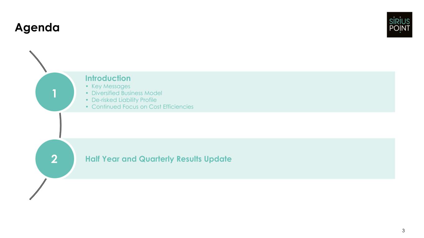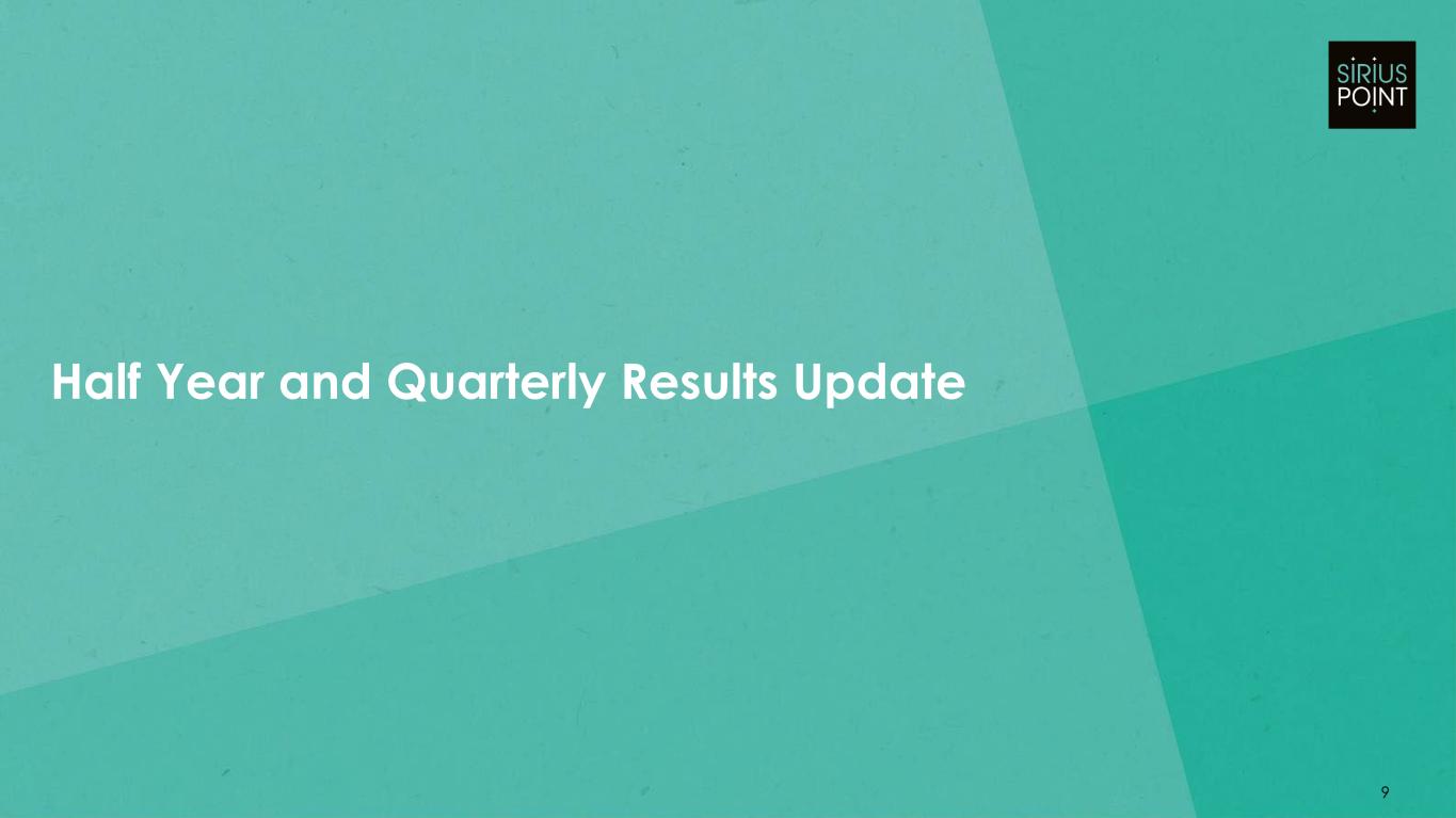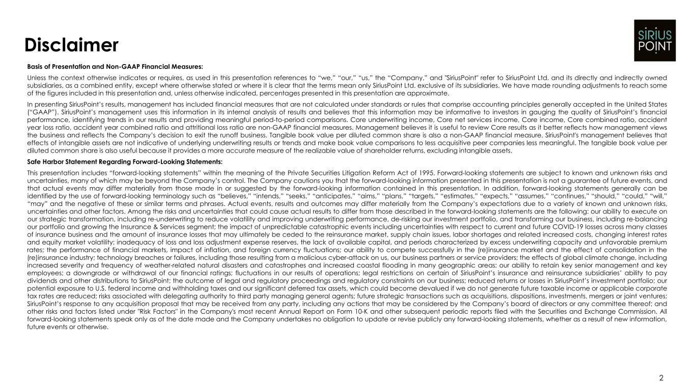 Basis of Presentation and Non-GAAP Financial Measures: Unless the context otherwise indicates or requires, as used in this presentation references to “we,” “our,” “us,” the “Company,” and "SiriusPoint" refer to SiriusPoint Ltd. and its directly and indirectly owned subsidiaries, as a combined entity, except where otherwise stated or where it is clear that the terms mean only SiriusPoint Ltd. exclusive of its subsidiaries. We have made rounding adjustments to reach some of the figures included in this presentation and, unless otherwise indicated, percentages presented in this presentation are approximate. In presenting SiriusPoint’s results, management has included financial measures that are not calculated under standards or rules that comprise accounting principles generally accepted in the United States (“GAAP”). SiriusPoint’s management uses this information in its internal analysis of results and believes that this information may be informative to investors in gauging the quality of SiriusPoint’s financial performance, identifying trends in our results and providing meaningful period-to-period comparisons. Core underwriting income, Core net services income, Core income, Core combined ratio, accident year loss ratio, accident year combined ratio and attritional loss ratio are non-GAAP financial measures. Management believes it is useful to review Core results as it better reflects how management views the business and reflects the Company’s decision to exit the runoff business. Tangible book value per diluted common share is also a non-GAAP financial measure. SiriusPoint's management believes that effects of intangible assets are not indicative of underlying underwriting results or trends and make book value comparisons to less acquisitive peer companies less meaningful. The tangible book value per diluted common share is also useful because it provides a more accurate measure of the realizable value of shareholder returns, excluding intangible assets. Safe Harbor Statement Regarding Forward-Looking Statements: This presentation includes “forward-looking statements” within the meaning of the Private Securities Litigation Reform Act of 1995. Forward-looking statements are subject to known and unknown risks and uncertainties, many of which may be beyond the Company’s control. The Company cautions you that the forward-looking information presented in this presentation is not a guarantee of future events, and that actual events may differ materially from those made in or suggested by the forward-looking information contained in this presentation. In addition, forward-looking statements generally can be identified by the use of forward-looking terminology such as “believes,” “intends,” “seeks,” “anticipates,” “aims,” “plans,” “targets,” “estimates,” “expects,” “assumes,” “continues,” “should,” “could,” “will,” “may” and the negative of these or similar terms and phrases. Actual events, results and outcomes may differ materially from the Company’s expectations due to a variety of known and unknown risks, uncertainties and other factors. Among the risks and uncertainties that could cause actual results to differ from those described in the forward-looking statements are the following: our ability to execute on our strategic transformation, including re-underwriting to reduce volatility and improving underwriting performance, de-risking our investment portfolio, and transforming our business, including re-balancing our portfolio and growing the Insurance & Services segment; the impact of unpredictable catastrophic events including uncertainties with respect to current and future COVID-19 losses across many classes of insurance business and the amount of insurance losses that may ultimately be ceded to the reinsurance market, supply chain issues, labor shortages and related increased costs, changing interest rates and equity market volatility; inadequacy of loss and loss adjustment expense reserves, the lack of available capital, and periods characterized by excess underwriting capacity and unfavorable premium rates; the performance of financial markets, impact of inflation, and foreign currency fluctuations; our ability to compete successfully in the (re)insurance market and the effect of consolidation in the (re)insurance industry; technology breaches or failures, including those resulting from a malicious cyber-attack on us, our business partners or service providers; the effects of global climate change, including increased severity and frequency of weather-related natural disasters and catastrophes and increased coastal flooding in many geographic areas; our ability to retain key senior management and key employees; a downgrade or withdrawal of our financial ratings; fluctuations in our results of operations; legal restrictions on certain of SiriusPoint’s insurance and reinsurance subsidiaries’ ability to pay dividends and other distributions to SiriusPoint; the outcome of legal and regulatory proceedings and regulatory constraints on our business; reduced returns or losses in SiriusPoint’s investment portfolio; our potential exposure to U.S. federal income and withholding taxes and our significant deferred tax assets, which could become devalued if we do not generate future taxable income or applicable corporate tax rates are reduced; risks associated with delegating authority to third party managing general agents; future strategic transactions such as acquisitions, dispositions, investments, mergers or joint ventures; SiriusPoint’s response to any acquisition proposal that may be received from any party, including any actions that may be considered by the Company’s board of directors or any committee thereof; and other risks and factors listed under "Risk Factors" in the Company's most recent Annual Report on Form 10-K and other subsequent periodic reports filed with the Securitie