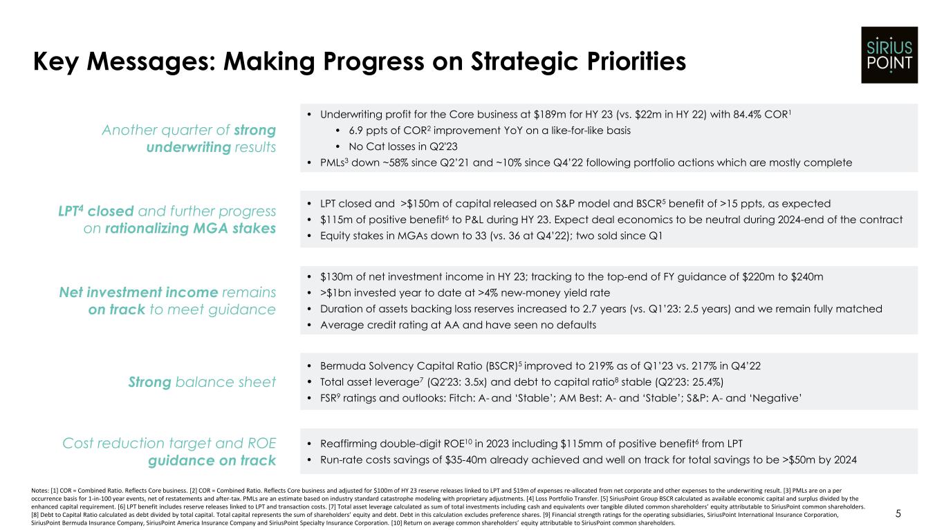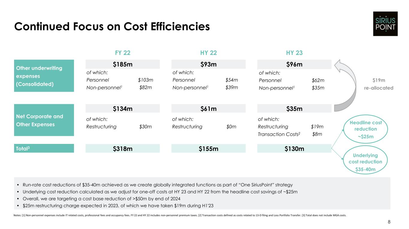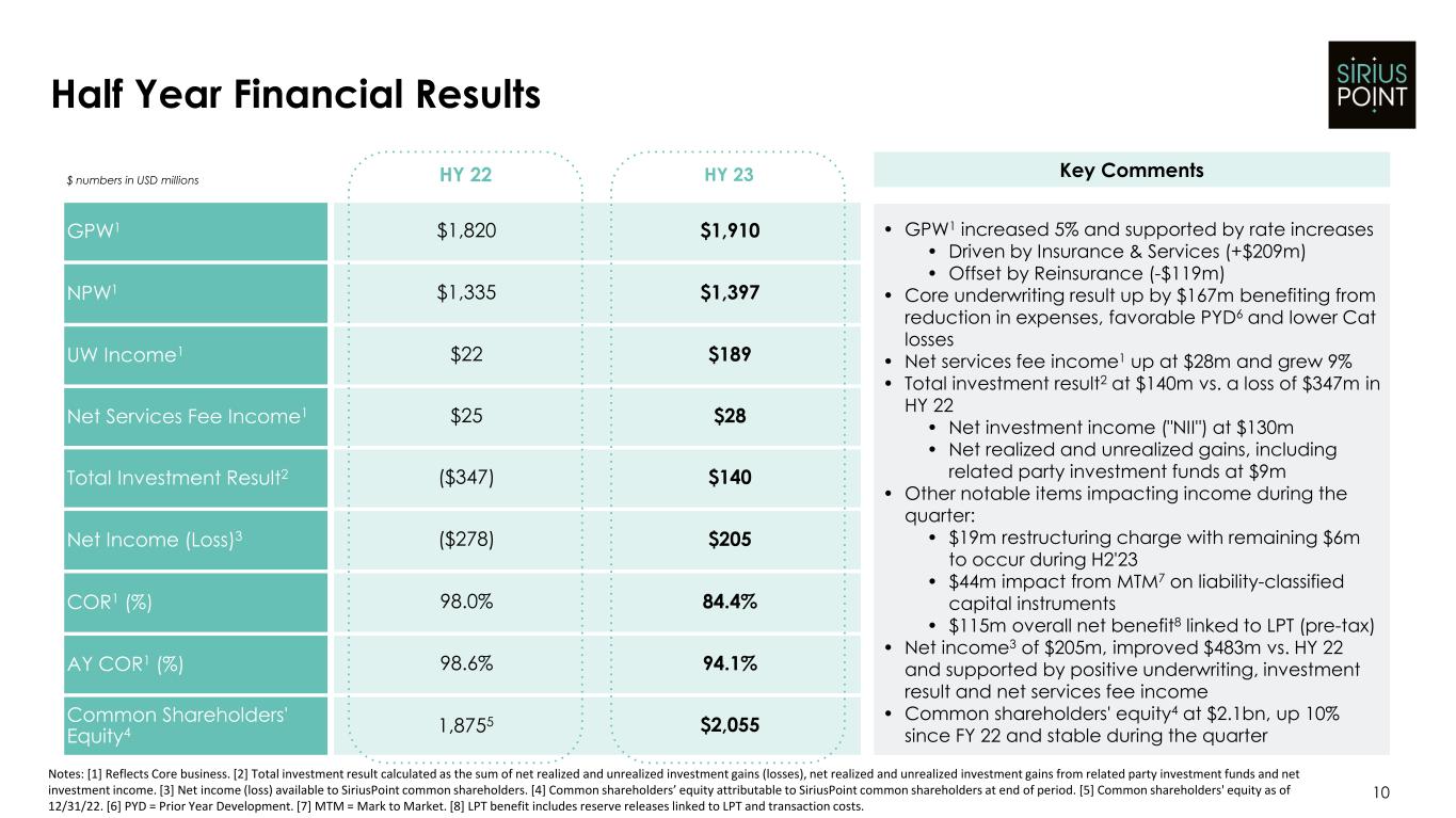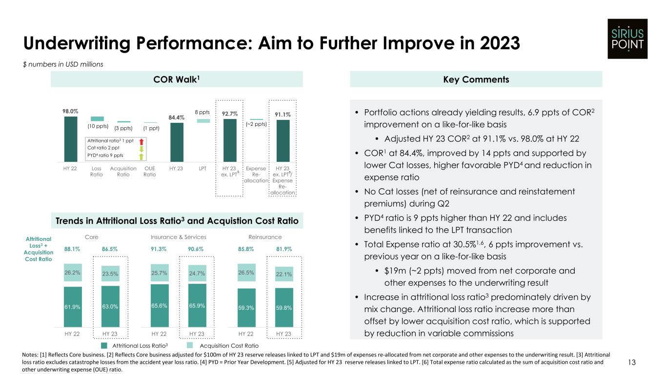 Basis of Presentation and Non-GAAP Financial Measures: Unless the context otherwise indicates or requires, as used in this presentation references to “we,” “our,” “us,” the “Company,” and "SiriusPoint" refer to SiriusPoint Ltd. and its directly and indirectly owned subsidiaries, as a combined entity, except where otherwise stated or where it is clear that the terms mean only SiriusPoint Ltd. exclusive of its subsidiaries. We have made rounding adjustments to reach some of the figures included in this presentation and, unless otherwise indicated, percentages presented in this presentation are approximate. In presenting SiriusPoint’s results, management has included financial measures that are not calculated under standards or rules that comprise accounting principles generally accepted in the United States (“GAAP”). SiriusPoint’s management uses this information in its internal analysis of results and believes that this information may be informative to investors in gauging the quality of SiriusPoint’s financial performance, identifying trends in our results and providing meaningful period-to-period comparisons. Core underwriting income, Core net services income, Core income, Core combined ratio, accident year loss ratio, accident year combined ratio and attritional loss ratio are non-GAAP financial measures. Management believes it is useful to review Core results as it better reflects how management views the business and reflects the Company’s decision to exit the runoff business. Tangible book value per diluted common share is also a non-GAAP financial measure. SiriusPoint's management believes that effects of intangible assets are not indicative of underlying underwriting results or trends and make book value comparisons to less acquisitive peer companies less meaningful. The tangible book value per diluted common share is also useful because it provides a more accurate measure of the realizable value of shareholder returns, excluding intangible assets. Safe Harbor Statement Regarding Forward-Looking Statements: This presentation includes “forward-looking statements” within the meaning of the Private Securities Litigation Reform Act of 1995. Forward-looking statements are subject to known and unknown risks and uncertainties, many of which may be beyond the Company’s control. The Company cautions you that the forward-looking information presented in this presentation is not a guarantee of future events, and that actual events may differ materially from those made in or suggested by the forward-looking information contained in this presentation. In addition, forward-looking statements generally can be identified by the use of forward-looking terminology such as “believes,” “intends,” “seeks,” “anticipates,” “aims,” “plans,” “targets,” “estimates,” “expects,” “assumes,” “continues,” “should,” “could,” “will,” “may” and the negative of these or similar terms and phrases. Actual events, results and outcomes may differ materially from the Company’s expectations due to a variety of known and unknown risks, uncertainties and other factors. Among the risks and uncertainties that could cause actual results to differ from those described in the forward-looking statements are the following: our ability to execute on our strategic transformation, including re-underwriting to reduce volatility and improving underwriting performance, de-risking our investment portfolio, and transforming our business, including re-balancing our portfolio and growing the Insurance & Services segment; the impact of unpredictable catastrophic events including uncertainties with respect to current and future COVID-19 losses across many classes of insurance business and the amount of insurance losses that may ultimately be ceded to the reinsurance market, supply chain issues, labor shortages and related increased costs, changing interest rates and equity market volatility; inadequacy of loss and loss adjustment expense reserves, the lack of available capital, and periods characterized by excess underwriting capacity and unfavorable premium rates; the performance of financial markets, impact of inflation, and foreign currency fluctuations; our ability to compete successfully in the (re)insurance market and the effect of consolidation in the (re)insurance industry; technology breaches or failures, including those resulting from a malicious cyber-attack on us, our business partners or service providers; the effects of global climate change, including increased severity and frequency of weather-related natural disasters and catastrophes and increased coastal flooding in many geographic areas; our ability to retain key senior management and key employees; a downgrade or withdrawal of our financial ratings; fluctuations in our results of operations; legal restrictions on certain of SiriusPoint’s insurance and reinsurance subsidiaries’ ability to pay dividends and other distributions to SiriusPoint; the outcome of legal and regulatory proceedings and regulatory constraints on our business; reduced returns or losses in SiriusPoint’s investment portfolio; our potential exposure to U.S. federal income and withholding taxes and our significant deferred tax assets, which could become devalued if we do not generate future taxable income or applicable corporate tax rates are reduced; risks associated with delegating authority to third party managing general agents; future strategic transactions such as acquisitions, dispositions, investments, mergers or joint ventures; SiriusPoint’s response to any acquisition proposal that may be received from any party, including any actions that may be considered by the Company’s board of directors or any committee thereof; and other risks and factors listed under "Risk Factors" in the Company's most recent Annual Report on Form 10-K and other subsequent periodic reports filed with the Securitie