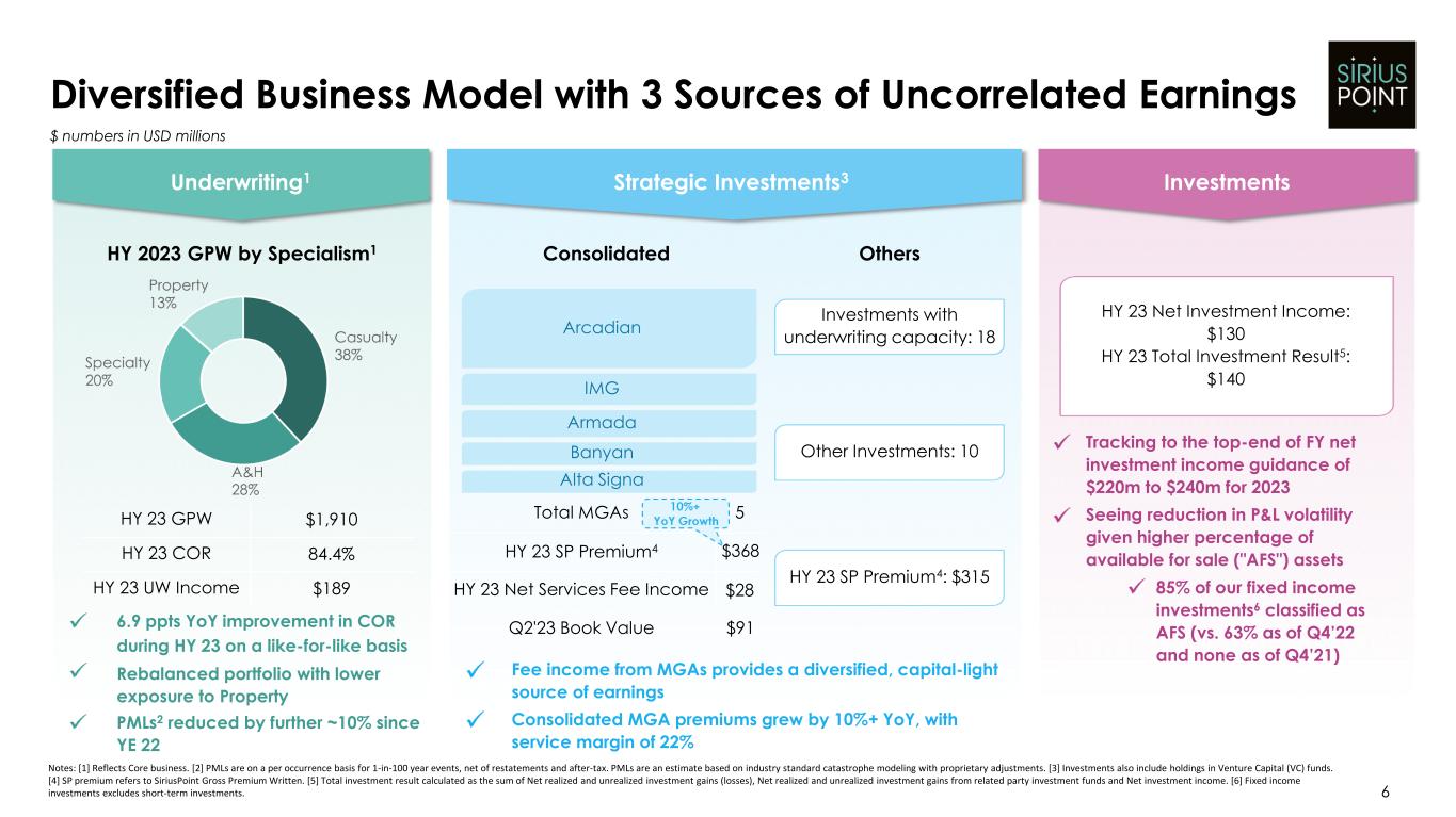 5 Key Messages: Making Progress on Strategic Priorities Notes: [1] COR = Combined Ratio. Reflects Core business. [2] COR = Combined Ratio. Reflects Core business and adjusted for $100m of HY 23 reserve releases linked to LPT and $19m of expenses re-allocated from net corporate and other expenses to the underwriting result. [3] PMLs are on a per occurrence basis for 1-in-100 year events, net of restatements and after-tax. PMLs are an estimate based on industry standard catastrophe modeling with proprietary adjustments. [4] Loss Portfolio Transfer. [5] SiriusPoint Group BSCR calculated as available economic capital and surplus divided by the enhanced capital requirement. [6] LPT benefit includes reserve releases linked to LPT and transaction costs. [7] Total asset leverage calculated as sum of total investments including cash and equivalents over tangible diluted common shareholders’ equity attributable to SiriusPoint common shareholders. [8] Debt to Capital Ratio calculated as debt divided by total capital. Total capital represents the sum of shareholders’ equity and debt. Debt in this calculation excludes preference shares. [9] Financial strength ratings for the operating subsidiaries, SiriusPoint International Insurance Corporation, SiriusPoint Bermuda Insurance Company, SiriusPoint America Insurance Company and SiriusPoint Specialty Insurance Corporation. [10] Return on average common shareholders’ equity attributable to SiriusPoint common shareholders. • LPT closed and >$150m of capital released on S&P model and BSCR5 benefit of >15 ppts, as expected • $115m of positive benefit6 to P&L during HY 23. Expect deal economics to be neutral during 2024-end of the contract • Equity stakes in MGAs down to 33 (vs. 36 at Q4’22); two sold since Q1 LPT4 closed and further progress on rationalizing MGA stakes Cost reduction target and ROE guidance on track Net investment income remains on track to meet guidance Another quarter of strong underwriting results Strong balance sheet • Underwriting profit for the Core business at $189m for HY 23 (vs. $22m in HY 22) with 84.4% COR1 • 6.9 ppts of COR2 improvement YoY on a like-for-like basis • No Cat losses in Q2'23 • PMLs3 down ~58% since Q2’21 and ~10% since Q4’22 following portfolio actions which are mostly complete • $130m of net investment income in HY 23; tracking to the top-end of FY guidance of $220m to $240m • >$1bn invested year to date at >4% new-money yield rate • Duration of assets backing loss reserves increased to 2.7 years (vs. Q1’23: 2.5 years) and we remain fully matched • Average credit rating at AA and have seen no defaults • Reaffirming double-digit ROE10 in 2023 including $115mm of positive benefit6 from LPT • Run-rate costs savings of $35-40m already achieved and well on track for total savings to be >$50m by 2024 • Bermuda Solvency Capital Ratio (BSCR)5 improved to 219% as of Q1’23 vs. 217% in Q4’22 • Total asset leverage7 (Q2'23: 3.5x) and debt to capital ratio8 stable (Q2'23: 25.4%) • FSR9 ratings and outlooks: Fitch: A- and ‘Stable’; AM Best: A- and ‘Stable’; S&P: A- and ‘Negative’
