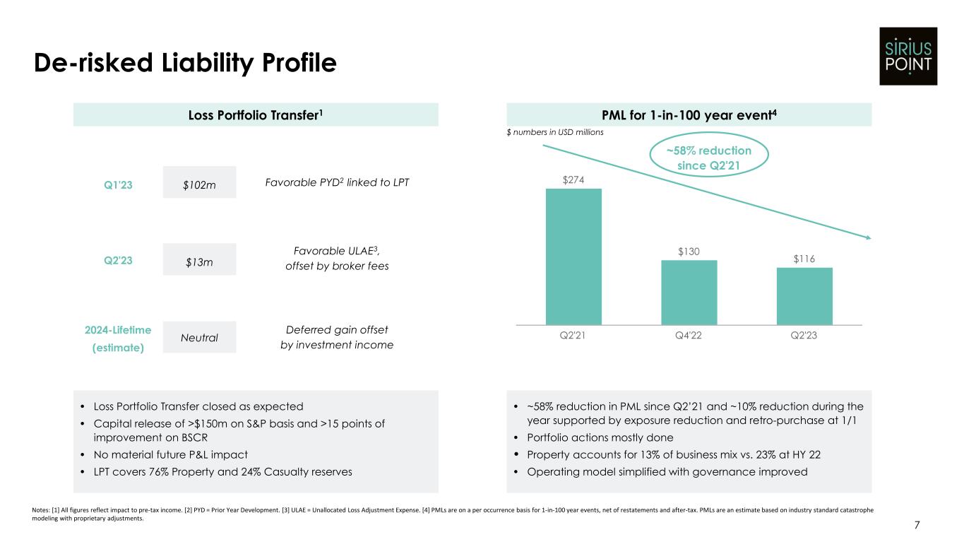 6 Diversified Business Model with 3 Sources of Uncorrelated Earnings Notes: [1] Reflects Core business. [2] PMLs are on a per occurrence basis for 1-in-100 year events, net of restatements and after-tax. PMLs are an estimate based on industry standard catastrophe modeling with proprietary adjustments. [3] Investments also include holdings in Venture Capital (VC) funds. [4] SP premium refers to SiriusPoint Gross Premium Written. [5] Total investment result calculated as the sum of Net realized and unrealized investment gains (losses), Net realized and unrealized investment gains from related party investment funds and Net investment income. [6] Fixed income investments excludes short-term investments. Underwriting1 InvestmentsStrategic Investments3 HY 2023 GPW by Specialism1 HY 23 GPW $1,910 HY 23 COR 84.4% HY 23 UW Income $189 6.9 ppts YoY improvement in COR during HY 23 on a like-for-like basis Rebalanced portfolio with lower exposure to Property PMLs2 reduced by further ~10% since YE 22 Total MGAs 5 HY 23 SP Premium4 $368 HY 23 Net Services Fee Income $28 Q2'23 Book Value $91 Consolidated Others HY 23 Net Investment Income: $130 HY 23 Total Investment Result5: $140 Arcadian IMG Armada Banyan Alta Signa Investments with underwriting capacity: 18 Other Investments: 10 Fee income from MGAs provides a diversified, capital-light source of earnings Consolidated MGA premiums grew by 10%+ YoY, with service margin of 22% Tracking to the top-end of FY net investment income guidance of $220m to $240m for 2023 Seeing reduction in P&L volatility given higher percentage of available for sale ("AFS") assets 85% of our fixed income investments6 classified as AFS (vs. 63% as of Q4’22 and none as of Q4’21) HY 23 SP Premium4: $315 $ numbers in USD millions