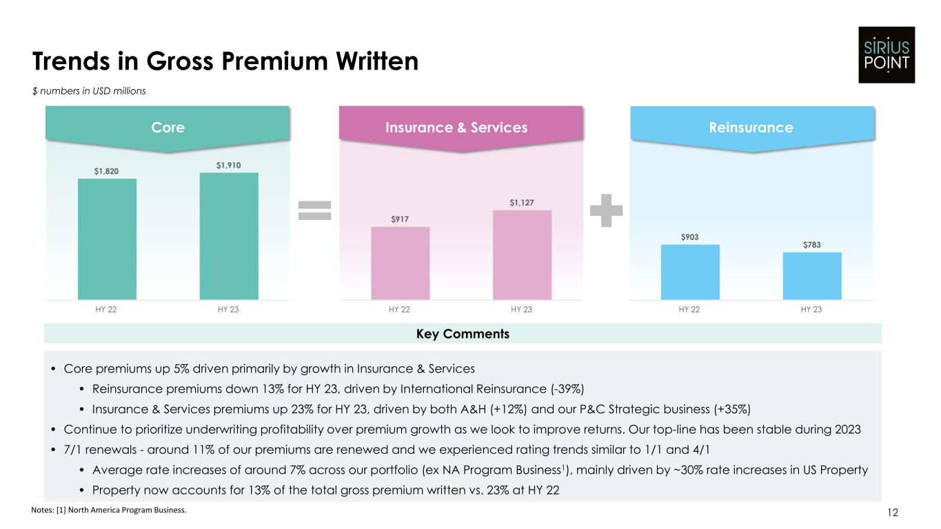 $ numbers in USD millions Q2'22 Q2'23 GPW1 $812 $850 NPW1 $623 $633 UW Income1 $10 $82 Net Services Fee Income1 $12 $9 Total Investment Result2 ($142) $66 Net Income (Loss)3 ($61) $66 COR1 (%) 98.3% 87.7% AY COR1 (%) 98.6% 91.4% Q2 2023 Financial Results 11 Notes: [1] Reflects Core business. [2] Total investment result calculated as the sum of net realized and unrealized investment gains (losses), net realized and unrealized investment gains from related party investment funds and net investment income. [3] Net income (loss) available to SiriusPoint common shareholders. [4] PYD = Prior Year Development. [5] MTM = Mark to Market. [6] LPT benefit includes reserve releases and transaction costs. • GPW1 increased 5% • Driven by Insurance & Services (+$29m) and Reinsurance (+$9m) • Core underwriting result up by $72m and benefited from lower Cat losses, favorable PYD4 and lower expenses • Net services fee income1 lower at $9m and impacted by one off items. Underlying trends stable with 5% revenue growth and service margin ~20% • Total investment result2 at $66m vs. a loss of $142m in Q2'22 • NII at $69m vs. $17m in Q2'22 • Other notable items impacting income during the quarter: • $12m restructuring charge and expect the remaining $6m to occur during H2'23 • $19m impact from MTM5 on liability-classified capital instruments • $13m overall net benefit6 linked to LPT (pre-tax) • Net income3 of $66m supported by positive underwriting, investment result and net services fee income • Book Value stable and impacted by MTM5 losses on fixed income portfolio Key Comments