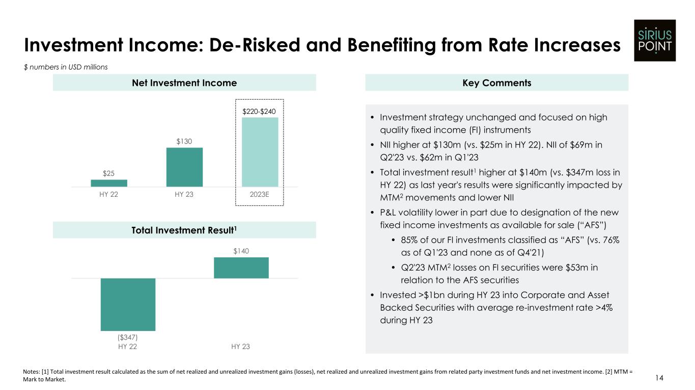 Attritional ratio3 1 ppt Cat ratio 2 ppt PYD4 ratio 9 ppts Underwriting Performance: Aim to Further Improve in 2023 13 COR Walk1 $ numbers in USD millions Trends in Attritional Loss Ratio3 and Acquistion Cost Ratio Attritional Loss Ratio3 Acquisition Cost Ratio Key Comments (10 ppts) (3 ppts) Notes: [1] Reflects Core business. [2] Reflects Core business adjusted for $100m of HY 23 reserve releases linked to LPT and $19m of expenses re-allocated from net corporate and other expenses to the underwriting result. [3] Attritional loss ratio excludes catastrophe losses from the accident year loss ratio. [4] PYD = Prior Year Development. [5] Adjusted for HY 23 reserve releases linked to LPT. [6] Total expense ratio calculated as the sum of acquisition cost ratio and other underwriting expense (OUE) ratio. (1 ppt) 8 ppts (~2 ppts) • Portfolio actions already yielding results, 6.9 ppts of COR2 improvement on a like-for-like basis • Adjusted HY 23 COR2 at 91.1% vs. 98.0% at HY 22 • COR1 at 84.4%, improved by 14 ppts and supported by lower Cat losses, higher favorable PYD4 and reduction in expense ratio • No Cat losses (net of reinsurance and reinstatement premiums) during Q2 • PYD4 ratio is 9 ppts higher than HY 22 and includes benefits linked to the LPT transaction • Total Expense ratio at 30.5%1,6, 6 ppts improvement vs. previous year on a like-for-like basis • $19m (~2 ppts) moved from net corporate and other expenses to the underwriting result • Increase in attritional loss ratio3 predominately driven by mix change. Attritional loss ratio increase more than offset by lower acquisition cost ratio, which is supported by reduction in variable commissions 5 88.1% 86.5% 91.3% 90.6% 85.8% 81.9% Attritional Loss3 + Acquisition Cost Ratio 5
