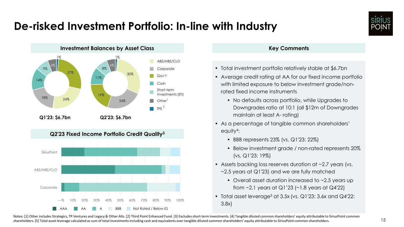Investment Income: De-Risked and Benefiting from Rate Increases 14 $ numbers in USD millions Key Comments Notes: [1] Total investment result calculated as the sum of net realized and unrealized investment gains (losses), net realized and unrealized investment gains from related party investment funds and net investment income. [2] MTM = Mark to Market. $220-$240 Net Investment Income Total Investment Result1 • Investment strategy unchanged and focused on high quality fixed income (FI) instruments • NII higher at $130m (vs. $25m in HY 22). NII of $69m in Q2'23 vs. $62m in Q1'23 • Total investment result1 higher at $140m (vs. $347m loss in HY 22) as last year's results were significantly impacted by MTM2 movements and lower NII • P&L volatility lower in part due to designation of the new fixed income investments as available for sale (“AFS”) • 85% of our FI investments classified as “AFS” (vs. 76% as of Q1'23 and none as of Q4'21) • Q2'23 MTM2 losses on FI securities were $53m in relation to the AFS securities • Invested >$1bn during HY 23 into Corporate and Asset Backed Securities with average re-investment rate >4% during HY 23