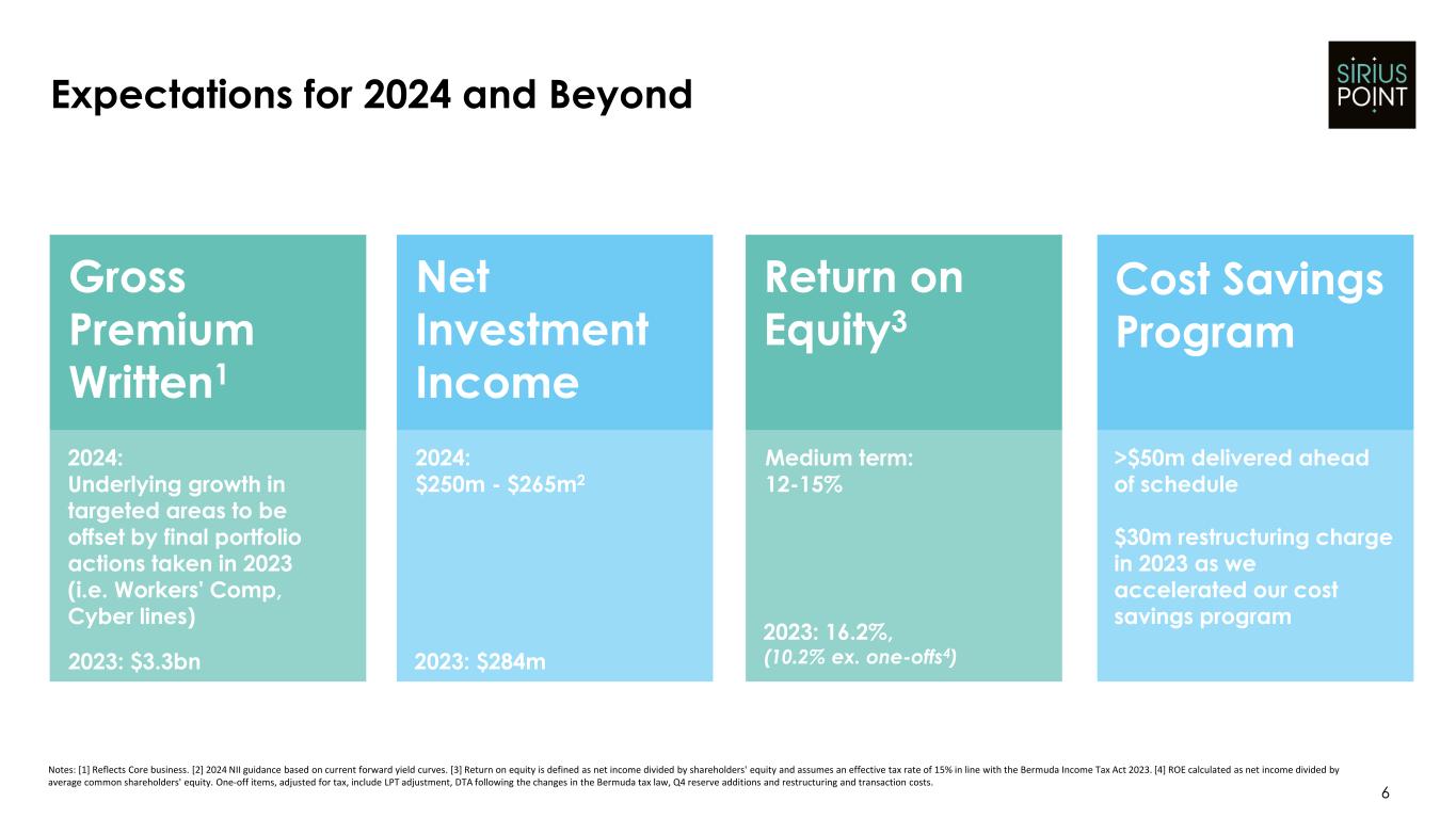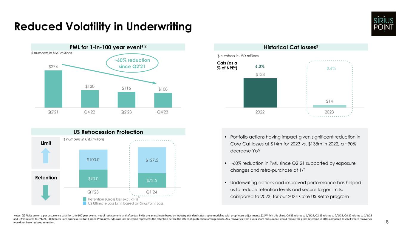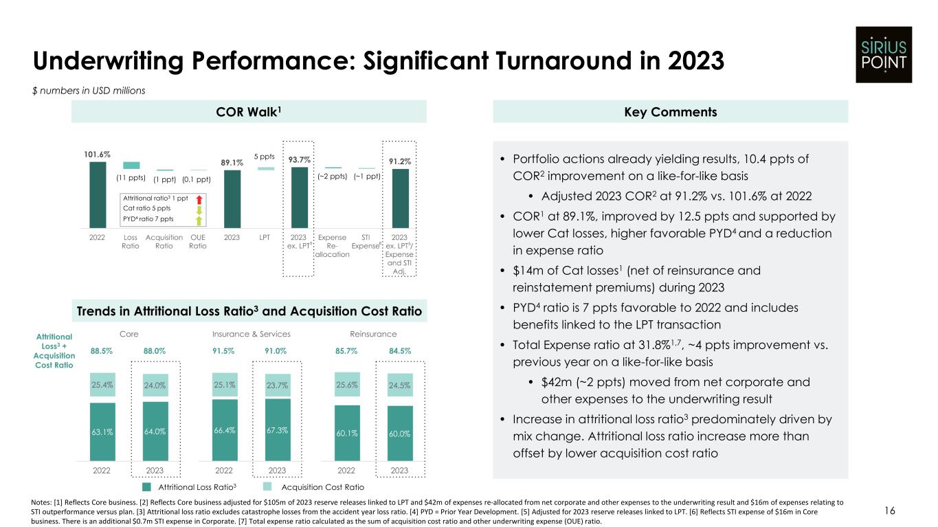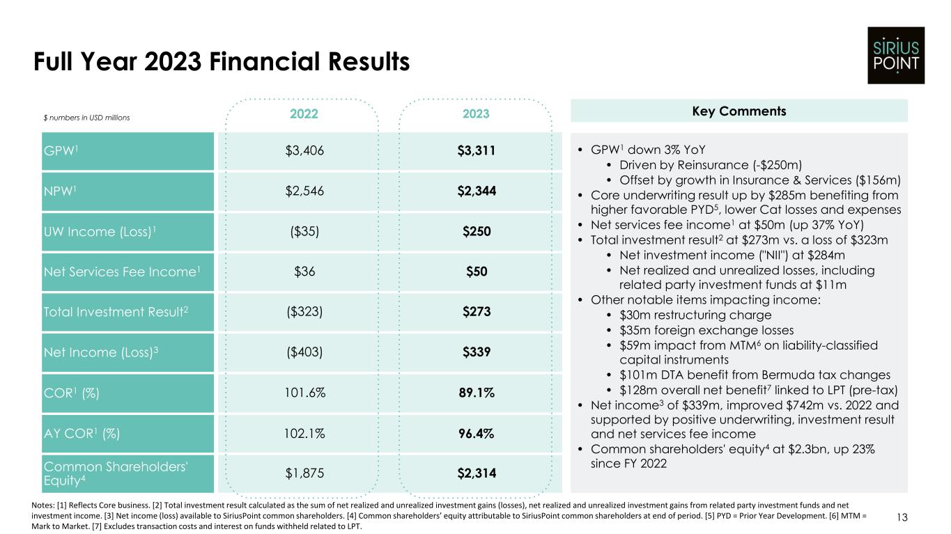 Basis of Presentation and Non-GAAP Financial Measures: Unless the context otherwise indicates or requires, as used in this presentation references to “we,” “our,” “us,” the “Company,” and "SiriusPoint" refer to SiriusPoint Ltd. and its directly and indirectly owned subsidiaries, as a combined entity, except where otherwise stated or where it is clear that the terms mean only SiriusPoint Ltd. exclusive of its subsidiaries. We have made rounding adjustments to reach some of the figures included in this presentation and, unless otherwise indicated, percentages presented in this presentation are approximate. In presenting SiriusPoint’s results, management has included financial measures that are not calculated under standards or rules that comprise accounting principles generally accepted in the United States (“GAAP”). SiriusPoint’s management uses this information in its internal analysis of results and believes that this information may be informative to investors in gauging the quality of SiriusPoint’s financial performance, identifying trends in our results and providing meaningful period-to-period comparisons. Core underwriting income, Core net services income, Core income, Core combined ratio, accident year loss ratio, accident year combined ratio and attritional loss ratio are non-GAAP financial measures. Management believes it is useful to review Core results as it better reflects how management views the business and reflects the Company’s decision to exit the runoff business. Tangible book value per diluted common share is also a non-GAAP financial measure. SiriusPoint's management believes that effects of intangible assets are not indicative of underlying underwriting results or trends and make book value comparisons to less acquisitive peer companies less meaningful. The tangible book value per diluted common share is also useful because it provides a more accurate measure of the realizable value of shareholder returns, excluding intangible assets. A reconciliation of these non-GAAP financial measures to the most directly comparable GAAP measure is contained in our earnings release and our Form 10-K for the fiscal year ended December 31, 2023. Safe Harbor Statement Regarding Forward-Looking Statements: This presentation includes “forward-looking statements” within the meaning of the Private Securities Litigation Reform Act of 1995. Forward-looking statements are subject to known and unknown risks and uncertainties, many of which may be beyond the Company’s control. The Company cautions you that the forward-looking information presented in this presentation is not a guarantee of future events, and that actual events may differ materially from those made in or suggested by the forward-looking information contained in this presentation. In addition, forward-looking statements generally can be identified by the use of forward-looking terminology such as “believes,” “intends,” “seeks,” “anticipates,” “aims,” “plans,” “targets,” “estimates,” “expects,” “assumes,” “continues,” “should,” “could,” “will,” “may” and the negative of these or similar terms and phrases. Actual events, results and outcomes may differ materially from the Company’s expectations due to a variety of known and unknown risks, uncertainties and other factors. Among the risks and uncertainties that could cause actual results to differ from those described in the forward-looking statements are the following: our ability to execute on our strategic transformation, including re-underwriting to reduce volatility and improving underwriting performance, de-risking our investment portfolio, and transforming our business; the impact of unpredictable catastrophic events including uncertainties with respect to current and future COVID-19 losses across many classes of insurance business and the amount of insurance losses that may ultimately be ceded to the reinsurance market, supply chain issues, labor shortages and related increased costs, changing interest rates and equity market volatility; inadequacy of loss and loss adjustment expense reserves, the lack of available capital, and periods characterized by excess underwriting capacity and unfavorable premium rates; the performance of financial markets, impact of inflation and interest rates, and foreign currency fluctuations; our ability to compete successfully in the (re)insurance market and the effect of consolidation in the (re)insurance industry; technology breaches or failures, including those resulting from a malicious cyber-attack on us, our business partners or service providers; the effects of global climate change, including increased severity and frequency of weather-related natural disasters and catastrophes and increased coastal flooding in many geographic areas; geopolitical uncertainty, including the ongoing conflicts in Europe and the Middle East; our ability to retain key senior management and key employees; a downgrade or withdrawal of our financial ratings; fluctuations in our results of operations; legal restrictions on certain of SiriusPoint’s insurance and reinsurance subsidiaries’ ability to pay dividends and other distributions to SiriusPoint; the outcome of legal and regulatory proceedings and regulatory constraints on our business; reduced returns or losses in SiriusPoint’s investment portfolio; our exposure or potential exposure to corporate income tax in Bermuda and the E.U., U.S. federal income and withholding taxes and our significant deferred tax assets, which could become devalued if we do not generate future taxable income or applicable corporate tax rates are reduced; risks associated with delegating authority to third party managing general agents; future strategic transactions such as acquisitions, dispositions, investments, mergers or joint ventures; SiriusPoint’s response to any acquisition proposal that may be received from any party, i
