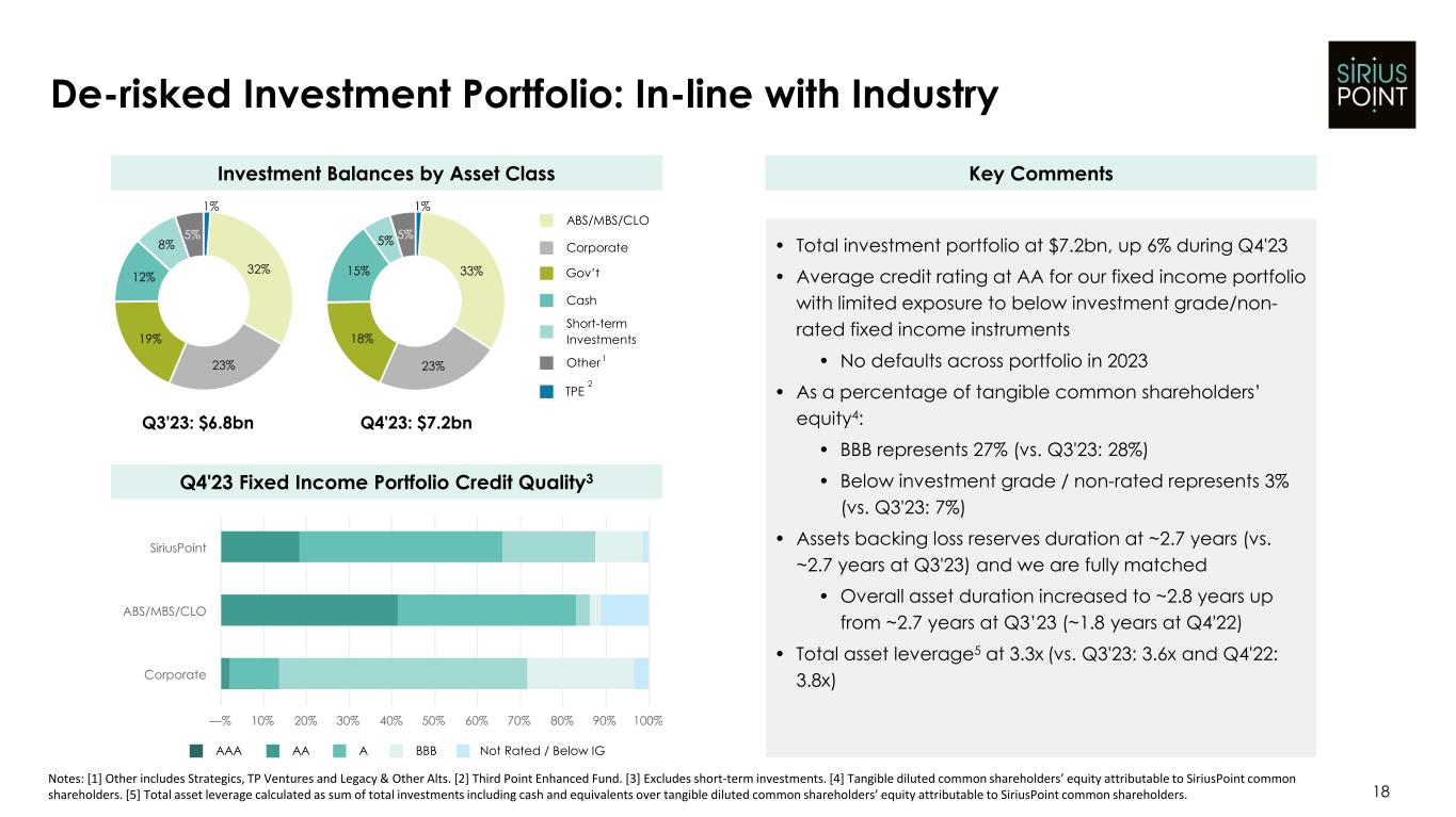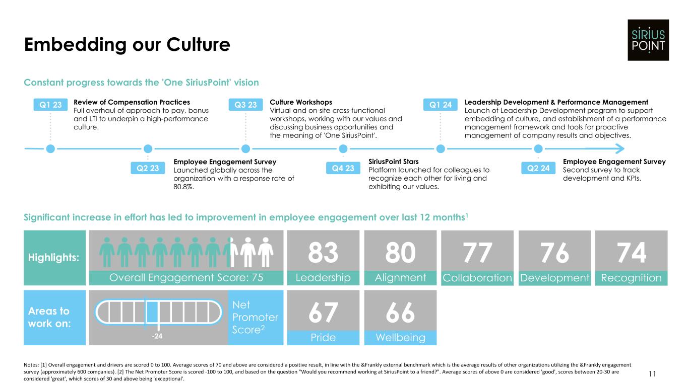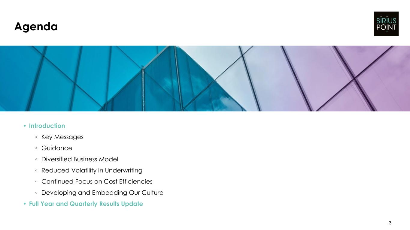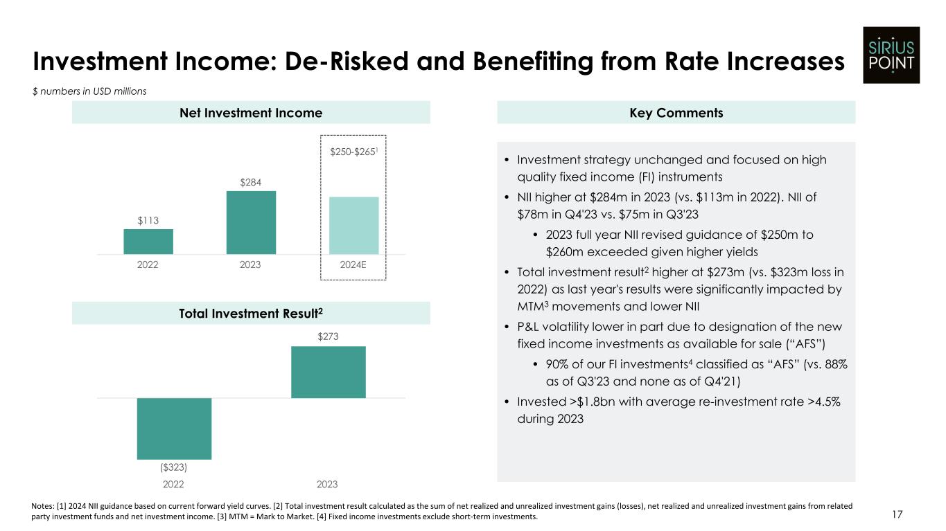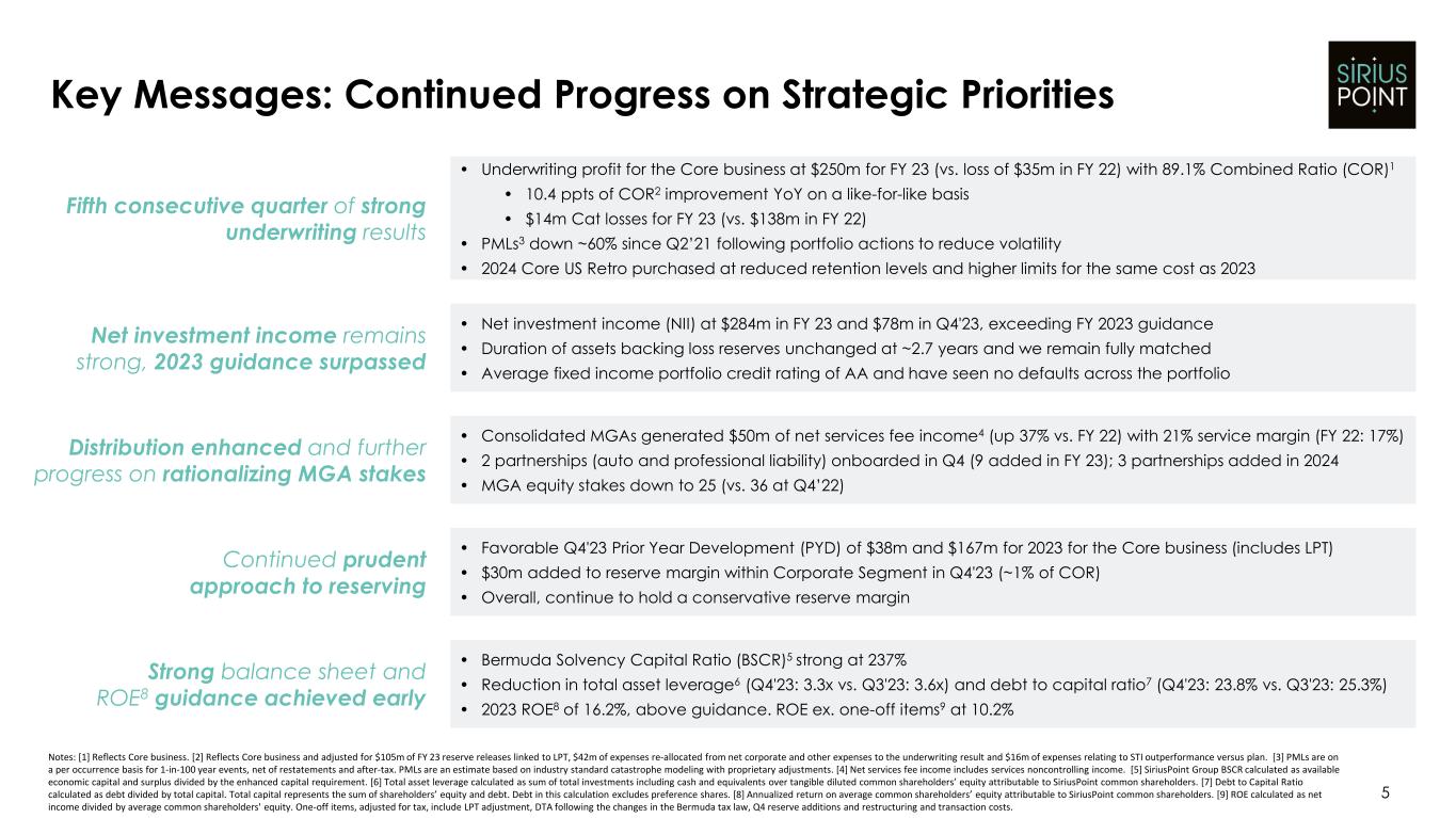 Basis of Presentation and Non-GAAP Financial Measures: Unless the context otherwise indicates or requires, as used in this presentation references to “we,” “our,” “us,” the “Company,” and "SiriusPoint" refer to SiriusPoint Ltd. and its directly and indirectly owned subsidiaries, as a combined entity, except where otherwise stated or where it is clear that the terms mean only SiriusPoint Ltd. exclusive of its subsidiaries. We have made rounding adjustments to reach some of the figures included in this presentation and, unless otherwise indicated, percentages presented in this presentation are approximate. In presenting SiriusPoint’s results, management has included financial measures that are not calculated under standards or rules that comprise accounting principles generally accepted in the United States (“GAAP”). SiriusPoint’s management uses this information in its internal analysis of results and believes that this information may be informative to investors in gauging the quality of SiriusPoint’s financial performance, identifying trends in our results and providing meaningful period-to-period comparisons. Core underwriting income, Core net services income, Core income, Core combined ratio, accident year loss ratio, accident year combined ratio and attritional loss ratio are non-GAAP financial measures. Management believes it is useful to review Core results as it better reflects how management views the business and reflects the Company’s decision to exit the runoff business. Tangible book value per diluted common share is also a non-GAAP financial measure. SiriusPoint's management believes that effects of intangible assets are not indicative of underlying underwriting results or trends and make book value comparisons to less acquisitive peer companies less meaningful. The tangible book value per diluted common share is also useful because it provides a more accurate measure of the realizable value of shareholder returns, excluding intangible assets. A reconciliation of these non-GAAP financial measures to the most directly comparable GAAP measure is contained in our earnings release and our Form 10-K for the fiscal year ended December 31, 2023. Safe Harbor Statement Regarding Forward-Looking Statements: This presentation includes “forward-looking statements” within the meaning of the Private Securities Litigation Reform Act of 1995. Forward-looking statements are subject to known and unknown risks and uncertainties, many of which may be beyond the Company’s control. The Company cautions you that the forward-looking information presented in this presentation is not a guarantee of future events, and that actual events may differ materially from those made in or suggested by the forward-looking information contained in this presentation. In addition, forward-looking statements generally can be identified by the use of forward-looking terminology such as “believes,” “intends,” “seeks,” “anticipates,” “aims,” “plans,” “targets,” “estimates,” “expects,” “assumes,” “continues,” “should,” “could,” “will,” “may” and the negative of these or similar terms and phrases. Actual events, results and outcomes may differ materially from the Company’s expectations due to a variety of known and unknown risks, uncertainties and other factors. Among the risks and uncertainties that could cause actual results to differ from those described in the forward-looking statements are the following: our ability to execute on our strategic transformation, including re-underwriting to reduce volatility and improving underwriting performance, de-risking our investment portfolio, and transforming our business; the impact of unpredictable catastrophic events including uncertainties with respect to current and future COVID-19 losses across many classes of insurance business and the amount of insurance losses that may ultimately be ceded to the reinsurance market, supply chain issues, labor shortages and related increased costs, changing interest rates and equity market volatility; inadequacy of loss and loss adjustment expense reserves, the lack of available capital, and periods characterized by excess underwriting capacity and unfavorable premium rates; the performance of financial markets, impact of inflation and interest rates, and foreign currency fluctuations; our ability to compete successfully in the (re)insurance market and the effect of consolidation in the (re)insurance industry; technology breaches or failures, including those resulting from a malicious cyber-attack on us, our business partners or service providers; the effects of global climate change, including increased severity and frequency of weather-related natural disasters and catastrophes and increased coastal flooding in many geographic areas; geopolitical uncertainty, including the ongoing conflicts in Europe and the Middle East; our ability to retain key senior management and key employees; a downgrade or withdrawal of our financial ratings; fluctuations in our results of operations; legal restrictions on certain of SiriusPoint’s insurance and reinsurance subsidiaries’ ability to pay dividends and other distributions to SiriusPoint; the outcome of legal and regulatory proceedings and regulatory constraints on our business; reduced returns or losses in SiriusPoint’s investment portfolio; our exposure or potential exposure to corporate income tax in Bermuda and the E.U., U.S. federal income and withholding taxes and our significant deferred tax assets, which could become devalued if we do not generate future taxable income or applicable corporate tax rates are reduced; risks associated with delegating authority to third party managing general agents; future strategic transactions such as acquisitions, dispositions, investments, mergers or joint ventures; SiriusPoint’s response to any acquisition proposal that may be received from any party, i