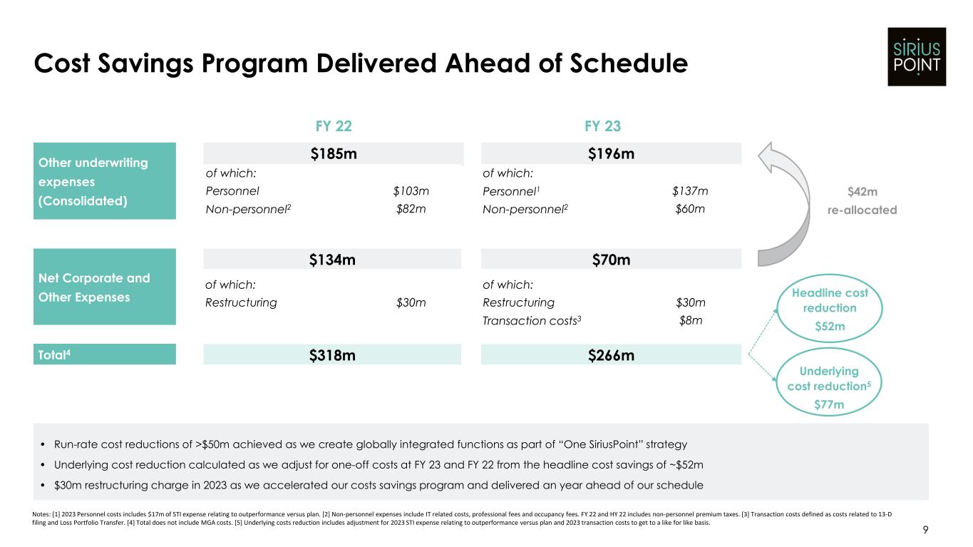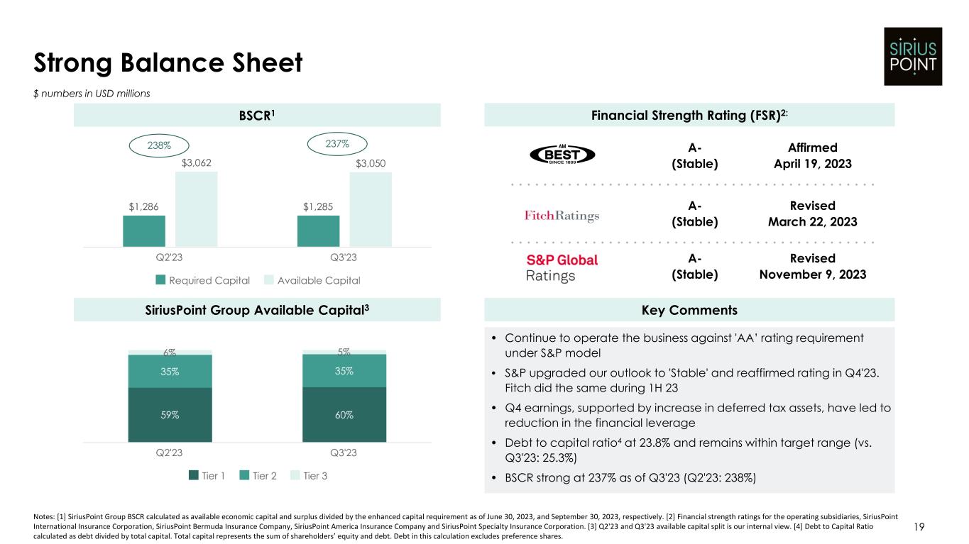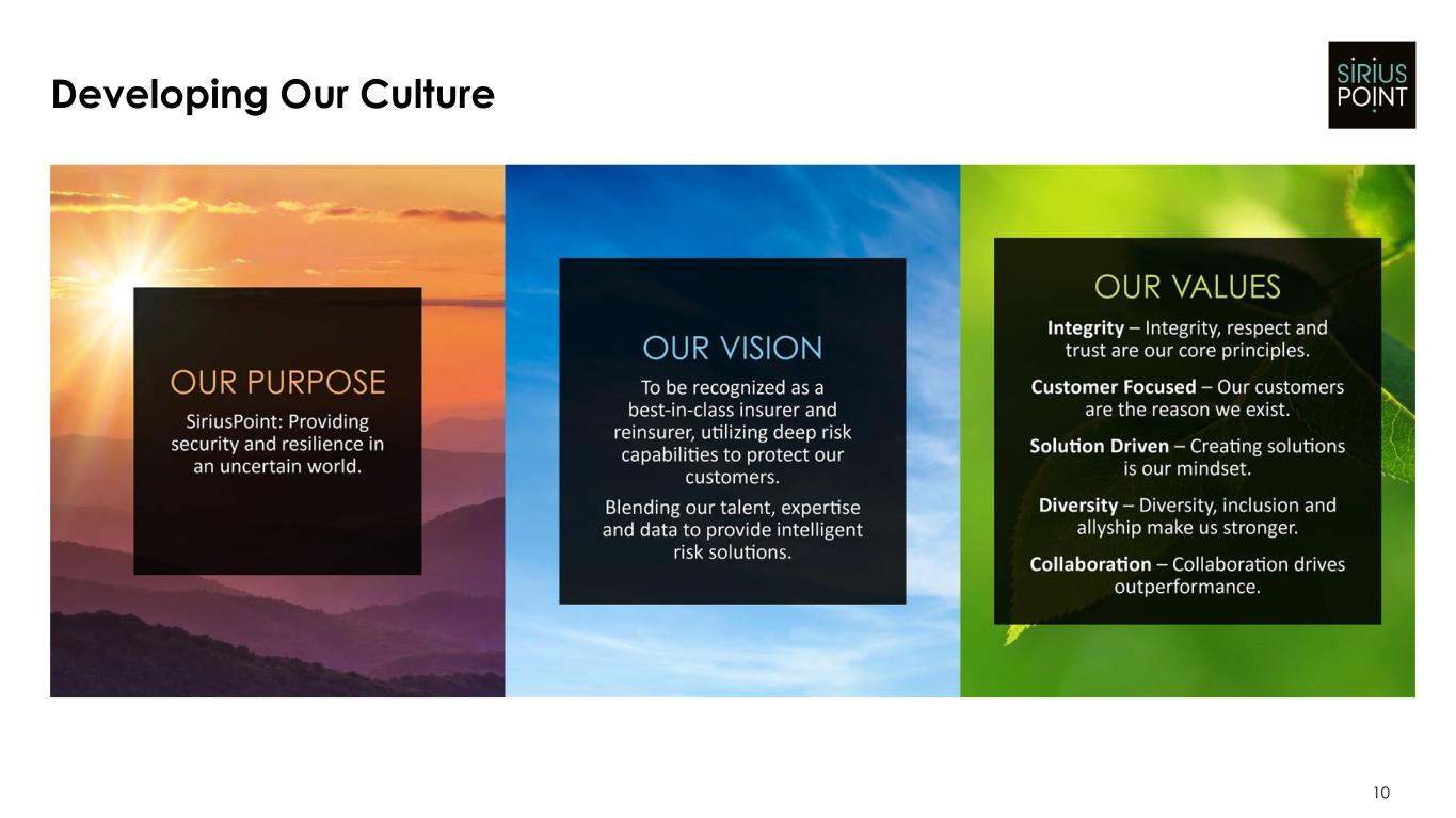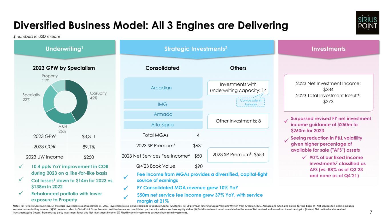 Basis of Presentation and Non-GAAP Financial Measures: Unless the context otherwise indicates or requires, as used in this presentation references to “we,” “our,” “us,” the “Company,” and "SiriusPoint" refer to SiriusPoint Ltd. and its directly and indirectly owned subsidiaries, as a combined entity, except where otherwise stated or where it is clear that the terms mean only SiriusPoint Ltd. exclusive of its subsidiaries. We have made rounding adjustments to reach some of the figures included in this presentation and, unless otherwise indicated, percentages presented in this presentation are approximate. In presenting SiriusPoint’s results, management has included financial measures that are not calculated under standards or rules that comprise accounting principles generally accepted in the United States (“GAAP”). SiriusPoint’s management uses this information in its internal analysis of results and believes that this information may be informative to investors in gauging the quality of SiriusPoint’s financial performance, identifying trends in our results and providing meaningful period-to-period comparisons. Core underwriting income, Core net services income, Core income, Core combined ratio, accident year loss ratio, accident year combined ratio and attritional loss ratio are non-GAAP financial measures. Management believes it is useful to review Core results as it better reflects how management views the business and reflects the Company’s decision to exit the runoff business. Tangible book value per diluted common share is also a non-GAAP financial measure. SiriusPoint's management believes that effects of intangible assets are not indicative of underlying underwriting results or trends and make book value comparisons to less acquisitive peer companies less meaningful. The tangible book value per diluted common share is also useful because it provides a more accurate measure of the realizable value of shareholder returns, excluding intangible assets. A reconciliation of these non-GAAP financial measures to the most directly comparable GAAP measure is contained in our earnings release and our Form 10-K for the fiscal year ended December 31, 2023. Safe Harbor Statement Regarding Forward-Looking Statements: This presentation includes “forward-looking statements” within the meaning of the Private Securities Litigation Reform Act of 1995. Forward-looking statements are subject to known and unknown risks and uncertainties, many of which may be beyond the Company’s control. The Company cautions you that the forward-looking information presented in this presentation is not a guarantee of future events, and that actual events may differ materially from those made in or suggested by the forward-looking information contained in this presentation. In addition, forward-looking statements generally can be identified by the use of forward-looking terminology such as “believes,” “intends,” “seeks,” “anticipates,” “aims,” “plans,” “targets,” “estimates,” “expects,” “assumes,” “continues,” “should,” “could,” “will,” “may” and the negative of these or similar terms and phrases. Actual events, results and outcomes may differ materially from the Company’s expectations due to a variety of known and unknown risks, uncertainties and other factors. Among the risks and uncertainties that could cause actual results to differ from those described in the forward-looking statements are the following: our ability to execute on our strategic transformation, including re-underwriting to reduce volatility and improving underwriting performance, de-risking our investment portfolio, and transforming our business; the impact of unpredictable catastrophic events including uncertainties with respect to current and future COVID-19 losses across many classes of insurance business and the amount of insurance losses that may ultimately be ceded to the reinsurance market, supply chain issues, labor shortages and related increased costs, changing interest rates and equity market volatility; inadequacy of loss and loss adjustment expense reserves, the lack of available capital, and periods characterized by excess underwriting capacity and unfavorable premium rates; the performance of financial markets, impact of inflation and interest rates, and foreign currency fluctuations; our ability to compete successfully in the (re)insurance market and the effect of consolidation in the (re)insurance industry; technology breaches or failures, including those resulting from a malicious cyber-attack on us, our business partners or service providers; the effects of global climate change, including increased severity and frequency of weather-related natural disasters and catastrophes and increased coastal flooding in many geographic areas; geopolitical uncertainty, including the ongoing conflicts in Europe and the Middle East; our ability to retain key senior management and key employees; a downgrade or withdrawal of our financial ratings; fluctuations in our results of operations; legal restrictions on certain of SiriusPoint’s insurance and reinsurance subsidiaries’ ability to pay dividends and other distributions to SiriusPoint; the outcome of legal and regulatory proceedings and regulatory constraints on our business; reduced returns or losses in SiriusPoint’s investment portfolio; our exposure or potential exposure to corporate income tax in Bermuda and the E.U., U.S. federal income and withholding taxes and our significant deferred tax assets, which could become devalued if we do not generate future taxable income or applicable corporate tax rates are reduced; risks associated with delegating authority to third party managing general agents; future strategic transactions such as acquisitions, dispositions, investments, mergers or joint ventures; SiriusPoint’s response to any acquisition proposal that may be received from any party, i