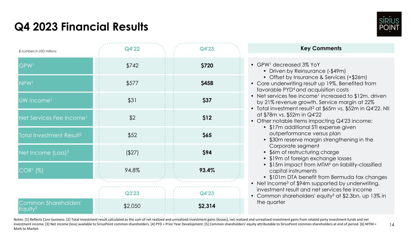$ numbers in USD millions 2022 2023 GPW1 $3,406 $3,311 NPW1 $2,546 $2,344 UW Income (Loss)1 ($35) $250 Net Services Fee Income1 $36 $50 Total Investment Result2 ($323) $273 Net Income (Loss)3 ($403) $339 COR1 (%) 101.6% 89.1% AY COR1 (%) 102.1% 96.4% Common Shareholders' Equity4 $1,875 $2,314 Full Year 2023 Financial Results 13 Notes: [1] Reflects Core business. [2] Total investment result calculated as the sum of net realized and unrealized investment gains (losses), net realized and unrealized investment gains from related party investment funds and net investment income. [3] Net income (loss) available to SiriusPoint common shareholders. [4] Common shareholders’ equity attributable to SiriusPoint common shareholders at end of period. [5] PYD = Prior Year Development. [6] MTM = Mark to Market. [7] Excludes transaction costs and interest on funds withheld related to LPT. • GPW1 down 3% YoY • Driven by Reinsurance (-$250m) • Offset by growth in Insurance & Services ($156m) • Core underwriting result up by $285m benefiting from higher favorable PYD5, lower Cat losses and expenses • Net services fee income1 at $50m (up 37% YoY) • Total investment result2 at $273m vs. a loss of $323m • Net investment income ("NII") at $284m • Net realized and unrealized losses, including related party investment funds at $11m • Other notable items impacting income: • $30m restructuring charge • $35m foreign exchange losses • $59m impact from MTM6 on liability-classified capital instruments • $101m DTA benefit from Bermuda tax changes • $128m overall net benefit7 linked to LPT (pre-tax) • Net income3 of $339m, improved $742m vs. 2022 and supported by positive underwriting, investment result and net services fee income • Common shareholders' equity4 at $2.3bn, up 23% since FY 2022 Key Comments