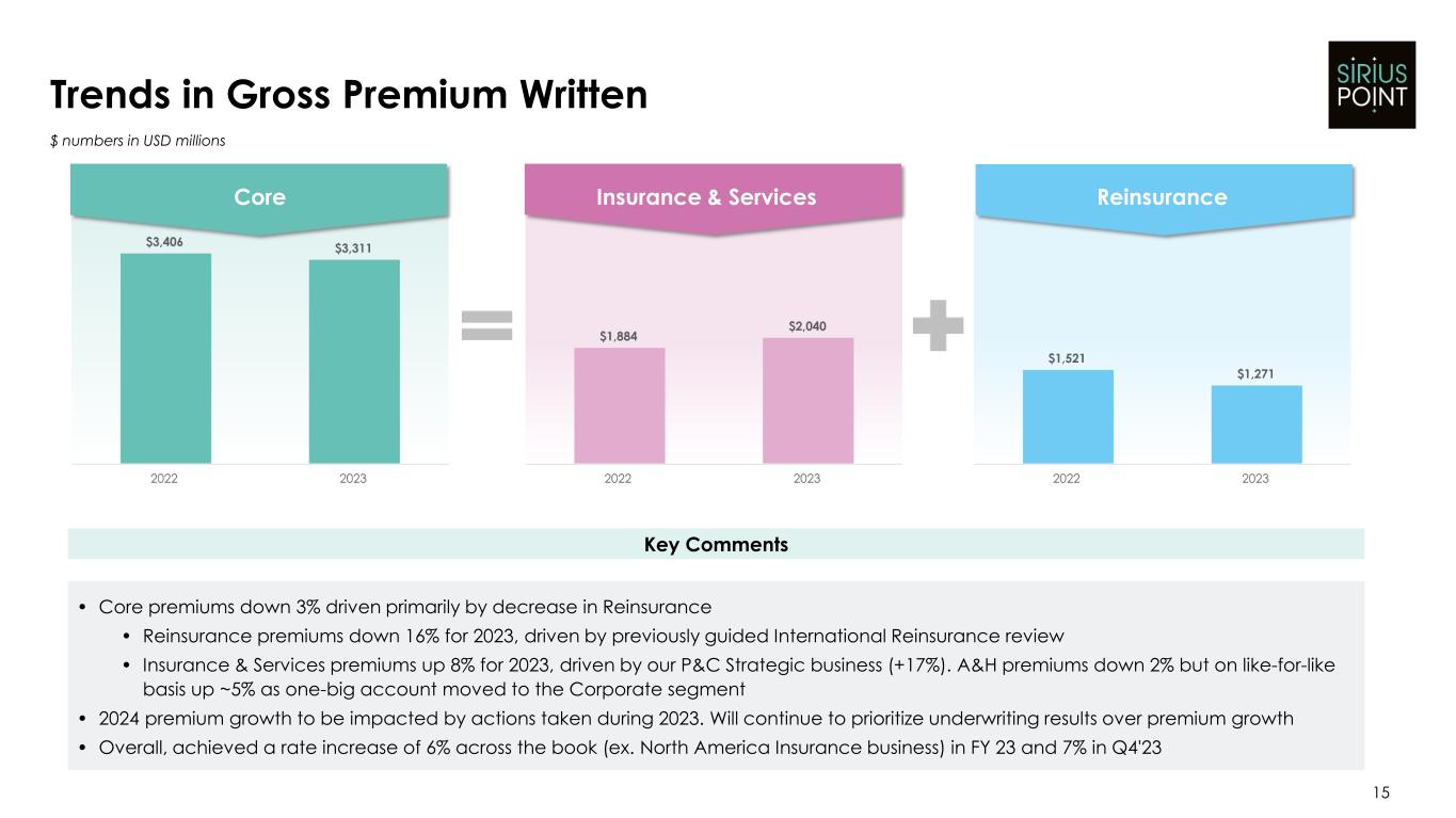 $ numbers in USD millions Q4'22 Q4'23 GPW1 $742 $720 NPW1 $577 $458 UW Income1 $31 $37 Net Services Fee Income1 $2 $12 Total Investment Result2 $52 $65 Net Income (Loss)3 ($27) $94 COR1 (%) 94.8% 93.4% Q3'23 Q4'23 Common Shareholders' Equity5 $2,050 $2,314 Q4 2023 Financial Results 14 Notes: [1] Reflects Core business. [2] Total investment result calculated as the sum of net realized and unrealized investment gains (losses), net realized and unrealized investment gains from related party investment funds and net investment income. [3] Net income (loss) available to SiriusPoint common shareholders. [4] PYD = Prior Year Development. [5] Common shareholders’ equity attributable to SiriusPoint common shareholders at end of period. [6] MTM = Mark to Market. • GPW1 decreased 3% YoY • Driven by Reinsurance (-$49m) • Offset by Insurance & Services (+$26m) • Core underwriting result up 19%. Benefited from favorable PYD4 and acquisition costs • Net services fee income1 increased to $12m, driven by 21% revenue growth. Service margin at 22% • Total investment result2 at $65m vs. $52m in Q4'22. NII at $78m vs. $52m in Q4'22 • Other notable items impacting Q4'23 income: • $17m additional STI expense given outperformance versus plan • $30m reserve margin strengthening in the Corporate segment • $6m of restructuring charge • $19m of foreign exchange losses • $15m impact from MTM6 on liability-classified capital instruments • $101m DTA benefit from Bermuda tax changes • Net income3 of $94m supported by underwriting, investment result and net services fee income • Common shareholders' equity5 at $2.3bn, up 13% in the quarter Key Comments