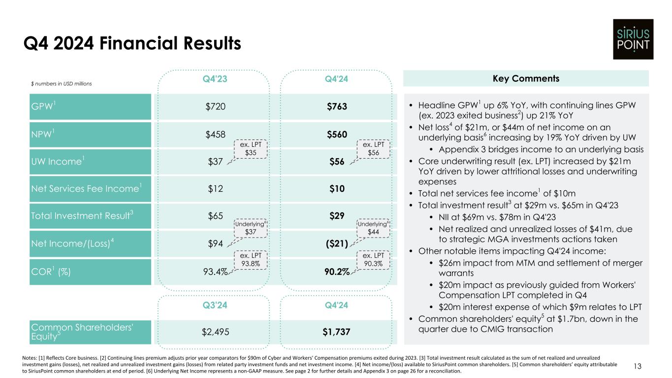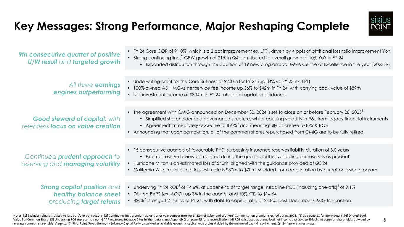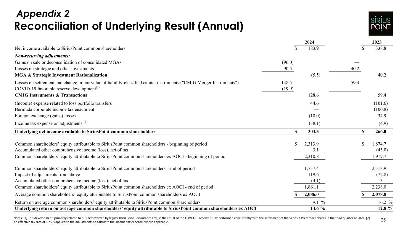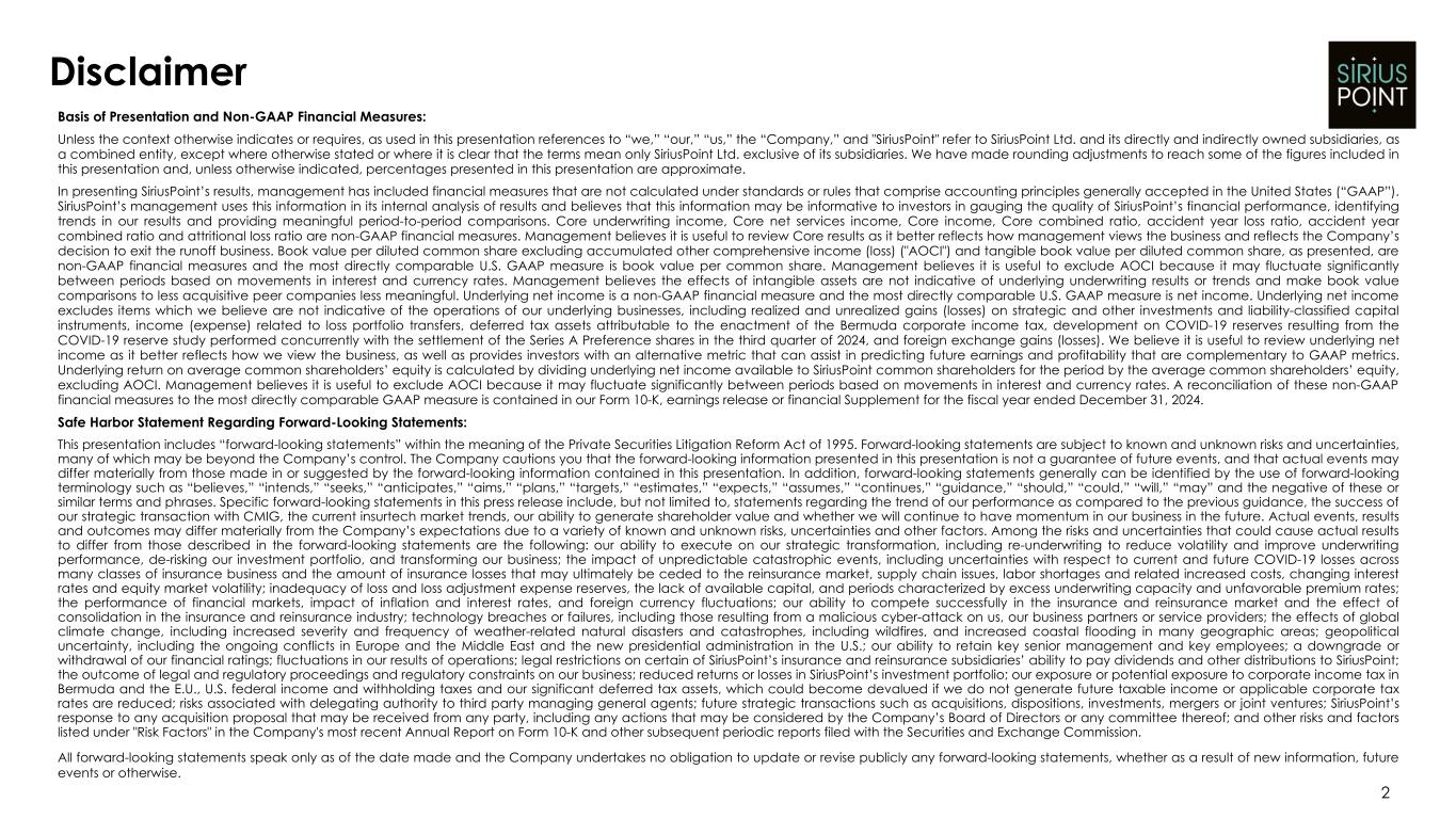 Basis of Presentation and Non-GAAP Financial Measures: Unless the context otherwise indicates or requires, as used in this presentation references to “we,” “our,” “us,” the “Company,” and "SiriusPoint" refer to SiriusPoint Ltd. and its directly and indirectly owned subsidiaries, as a combined entity, except where otherwise stated or where it is clear that the terms mean only SiriusPoint Ltd. exclusive of its subsidiaries. We have made rounding adjustments to reach some of the figures included in this presentation and, unless otherwise indicated, percentages presented in this presentation are approximate. In presenting SiriusPoint’s results, management has included financial measures that are not calculated under standards or rules that comprise accounting principles generally accepted in the United States (“GAAP”). SiriusPoint’s management uses this information in its internal analysis of results and believes that this information may be informative to investors in gauging the quality of SiriusPoint’s financial performance, identifying trends in our results and providing meaningful period-to-period comparisons. Core underwriting income, Core net services income, Core income, Core combined ratio, accident year loss ratio, accident year combined ratio and attritional loss ratio are non-GAAP financial measures. Management believes it is useful to review Core results as it better reflects how management views the business and reflects the Company’s decision to exit the runoff business. Book value per diluted common share excluding accumulated other comprehensive income (loss) ("AOCI") and tangible book value per diluted common share, as presented, are non-GAAP financial measures and the most directly comparable U.S. GAAP measure is book value per common share. Management believes it is useful to exclude AOCI because it may fluctuate significantly between periods based on movements in interest and currency rates. Management believes the effects of intangible assets are not indicative of underlying underwriting results or trends and make book value comparisons to less acquisitive peer companies less meaningful. Underlying net income is a non-GAAP financial measure and the most directly comparable U.S. GAAP measure is net income. Underlying net income excludes items which we believe are not indicative of the operations of our underlying businesses, including realized and unrealized gains (losses) on strategic and other investments and liability-classified capital instruments, income (expense) related to loss portfolio transfers, deferred tax assets attributable to the enactment of the Bermuda corporate income tax, development on COVID-19 reserves resulting from the COVID-19 reserve study performed concurrently with the settlement of the Series A Preference shares in the third quarter of 2024, and foreign exchange gains (losses). We believe it is useful to review underlying net income as it better reflects how we view the business, as well as provides investors with an alternative metric that can assist in predicting future earnings and profitability that are complementary to GAAP metrics. Underlying return on average common shareholders’ equity is calculated by dividing underlying net income available to SiriusPoint common shareholders for the period by the average common shareholders’ equity, excluding AOCI. Management believes it is useful to exclude AOCI because it may fluctuate significantly between periods based on movements in interest and currency rates. A reconciliation of these non-GAAP financial measures to the most directly comparable GAAP measure is contained in our Form 10-K, earnings release or financial Supplement for the fiscal year ended December 31, 2024. Safe Harbor Statement Regarding Forward-Looking Statements: This presentation includes “forward-looking statements” within the meaning of the Private Securities Litigation Reform Act of 1995. Forward-looking statements are subject to known and unknown risks and uncertainties, many of which may be beyond the Company’s control. The Company cautions you that the forward-looking information presented in this presentation is not a guarantee of future events, and that actual events may differ materially from those made in or suggested by the forward-looking information contained in this presentation. In addition, forward-looking statements generally can be identified by the use of forward-looking terminology such as “believes,” “intends,” “seeks,” “anticipates,” “aims,” “plans,” “targets,” “estimates,” “expects,” “assumes,” “continues,” “guidance,” “should,” “could,” “will,” “may” and the negative of these or similar terms and phrases. Specific forward-looking statements in this press release include, but not limited to, statements regarding the trend of our performance as compared to the previous guidance, the success of our strategic transaction with CMIG, the current insurtech market trends, our ability to generate shareholder value and whether we will continue to have momentum in our business in the future. Actual events, results and outcomes may differ materially from the Company’s expectations due to a variety of known and unknown risks, uncertainties and other factors. Among the risks and uncertainties that could cause actual results to differ from those described in the forward-looking statements are the following: our ability to execute on our strategic transformation, including re-underwriting to reduce volatility and improve underwriting performance, de-risking our investment portfolio, and transforming our business; the impact of unpredictable catastrophic events, including uncertainties with respect to current and future COVID-19 losses across many classes of insurance business and the amount of insurance losses that may ultimately be ceded to the reinsurance market, supply chain issues, labor shortages and related i