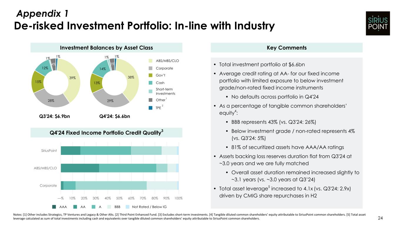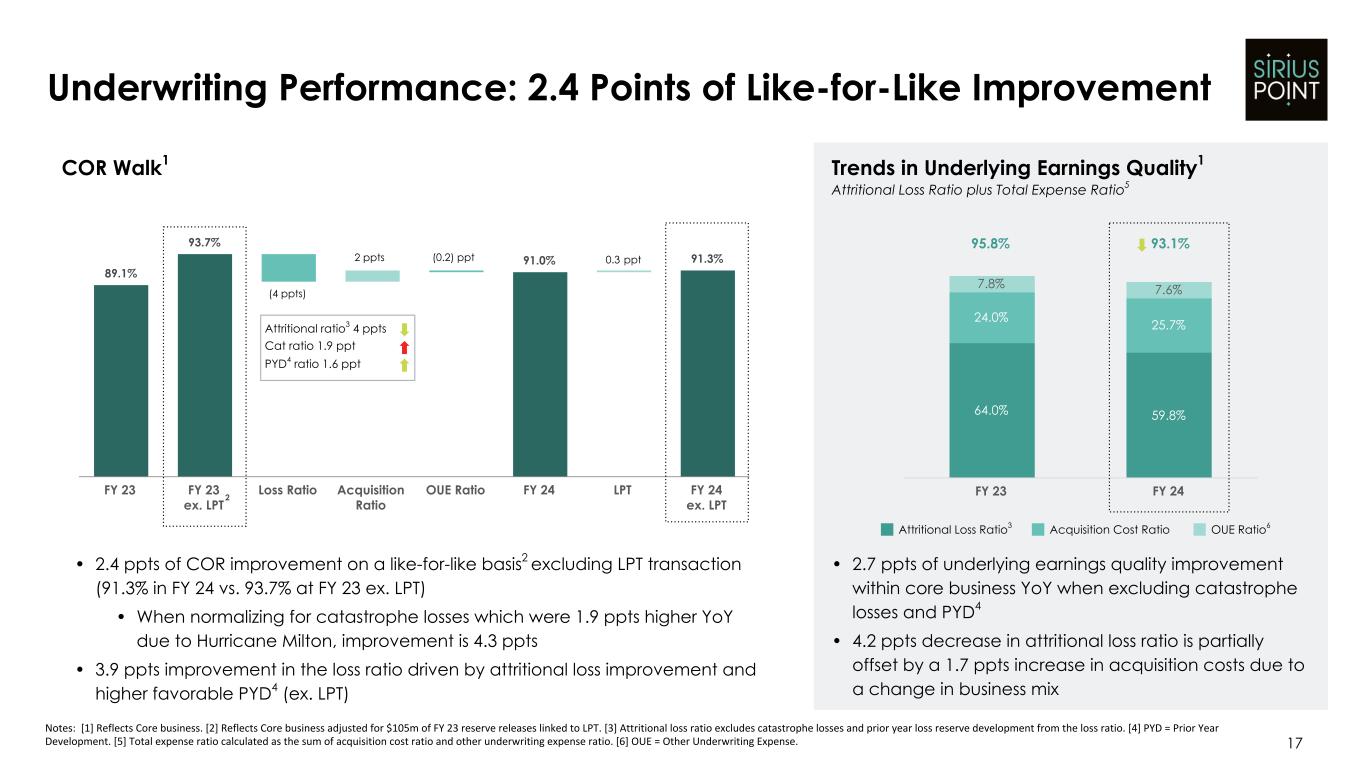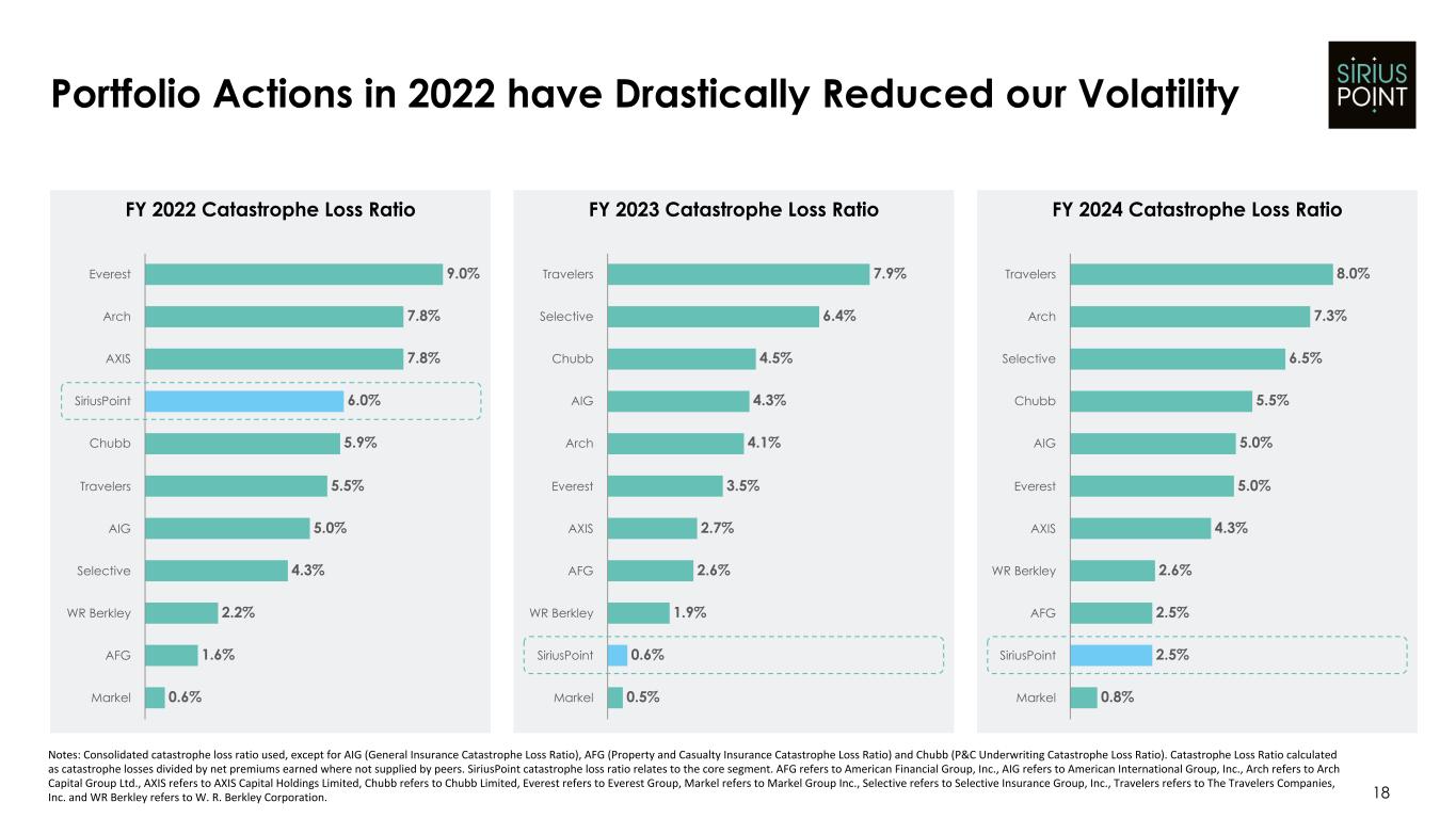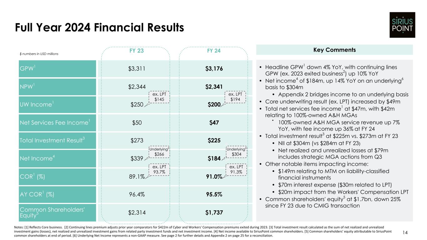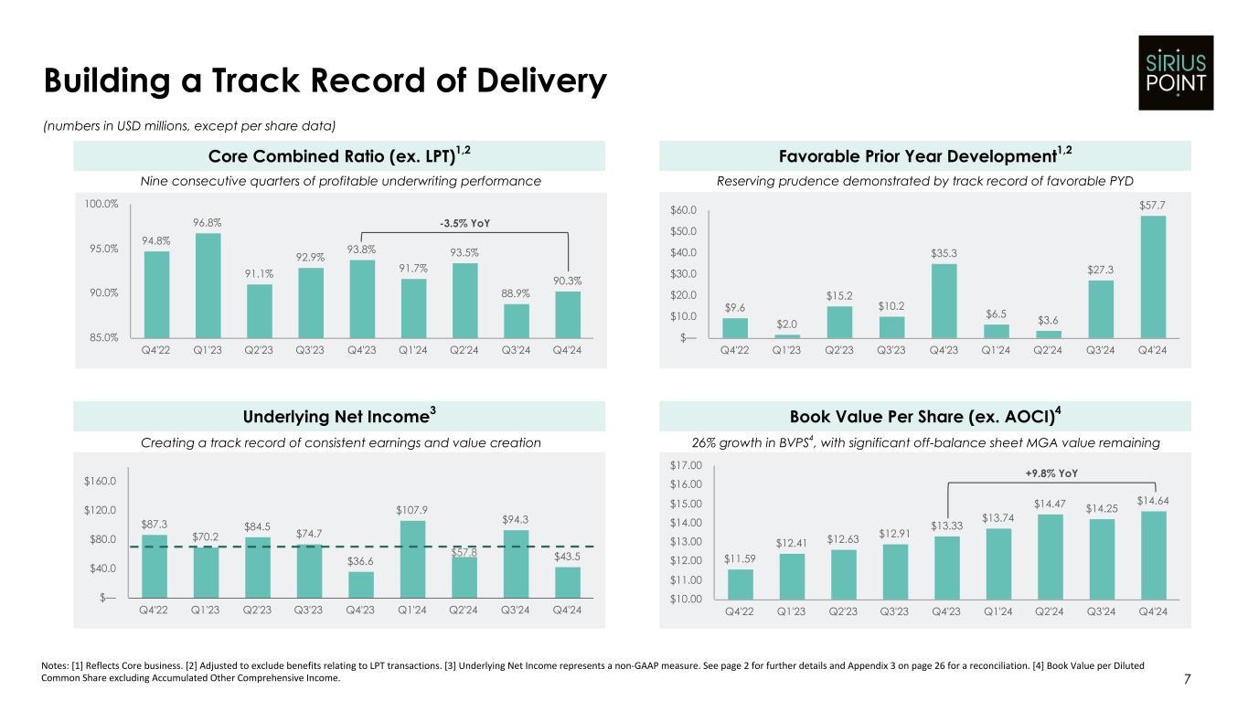 Basis of Presentation and Non-GAAP Financial Measures: Unless the context otherwise indicates or requires, as used in this presentation references to “we,” “our,” “us,” the “Company,” and "SiriusPoint" refer to SiriusPoint Ltd. and its directly and indirectly owned subsidiaries, as a combined entity, except where otherwise stated or where it is clear that the terms mean only SiriusPoint Ltd. exclusive of its subsidiaries. We have made rounding adjustments to reach some of the figures included in this presentation and, unless otherwise indicated, percentages presented in this presentation are approximate. In presenting SiriusPoint’s results, management has included financial measures that are not calculated under standards or rules that comprise accounting principles generally accepted in the United States (“GAAP”). SiriusPoint’s management uses this information in its internal analysis of results and believes that this information may be informative to investors in gauging the quality of SiriusPoint’s financial performance, identifying trends in our results and providing meaningful period-to-period comparisons. Core underwriting income, Core net services income, Core income, Core combined ratio, accident year loss ratio, accident year combined ratio and attritional loss ratio are non-GAAP financial measures. Management believes it is useful to review Core results as it better reflects how management views the business and reflects the Company’s decision to exit the runoff business. Book value per diluted common share excluding accumulated other comprehensive income (loss) ("AOCI") and tangible book value per diluted common share, as presented, are non-GAAP financial measures and the most directly comparable U.S. GAAP measure is book value per common share. Management believes it is useful to exclude AOCI because it may fluctuate significantly between periods based on movements in interest and currency rates. Management believes the effects of intangible assets are not indicative of underlying underwriting results or trends and make book value comparisons to less acquisitive peer companies less meaningful. Underlying net income is a non-GAAP financial measure and the most directly comparable U.S. GAAP measure is net income. Underlying net income excludes items which we believe are not indicative of the operations of our underlying businesses, including realized and unrealized gains (losses) on strategic and other investments and liability-classified capital instruments, income (expense) related to loss portfolio transfers, deferred tax assets attributable to the enactment of the Bermuda corporate income tax, development on COVID-19 reserves resulting from the COVID-19 reserve study performed concurrently with the settlement of the Series A Preference shares in the third quarter of 2024, and foreign exchange gains (losses). We believe it is useful to review underlying net income as it better reflects how we view the business, as well as provides investors with an alternative metric that can assist in predicting future earnings and profitability that are complementary to GAAP metrics. Underlying return on average common shareholders’ equity is calculated by dividing underlying net income available to SiriusPoint common shareholders for the period by the average common shareholders’ equity, excluding AOCI. Management believes it is useful to exclude AOCI because it may fluctuate significantly between periods based on movements in interest and currency rates. A reconciliation of these non-GAAP financial measures to the most directly comparable GAAP measure is contained in our Form 10-K, earnings release or financial Supplement for the fiscal year ended December 31, 2024. Safe Harbor Statement Regarding Forward-Looking Statements: This presentation includes “forward-looking statements” within the meaning of the Private Securities Litigation Reform Act of 1995. Forward-looking statements are subject to known and unknown risks and uncertainties, many of which may be beyond the Company’s control. The Company cautions you that the forward-looking information presented in this presentation is not a guarantee of future events, and that actual events may differ materially from those made in or suggested by the forward-looking information contained in this presentation. In addition, forward-looking statements generally can be identified by the use of forward-looking terminology such as “believes,” “intends,” “seeks,” “anticipates,” “aims,” “plans,” “targets,” “estimates,” “expects,” “assumes,” “continues,” “guidance,” “should,” “could,” “will,” “may” and the negative of these or similar terms and phrases. Specific forward-looking statements in this press release include, but not limited to, statements regarding the trend of our performance as compared to the previous guidance, the success of our strategic transaction with CMIG, the current insurtech market trends, our ability to generate shareholder value and whether we will continue to have momentum in our business in the future. Actual events, results and outcomes may differ materially from the Company’s expectations due to a variety of known and unknown risks, uncertainties and other factors. Among the risks and uncertainties that could cause actual results to differ from those described in the forward-looking statements are the following: our ability to execute on our strategic transformation, including re-underwriting to reduce volatility and improve underwriting performance, de-risking our investment portfolio, and transforming our business; the impact of unpredictable catastrophic events, including uncertainties with respect to current and future COVID-19 losses across many classes of insurance business and the amount of insurance losses that may ultimately be ceded to the reinsurance market, supply chain issues, labor shortages and related i