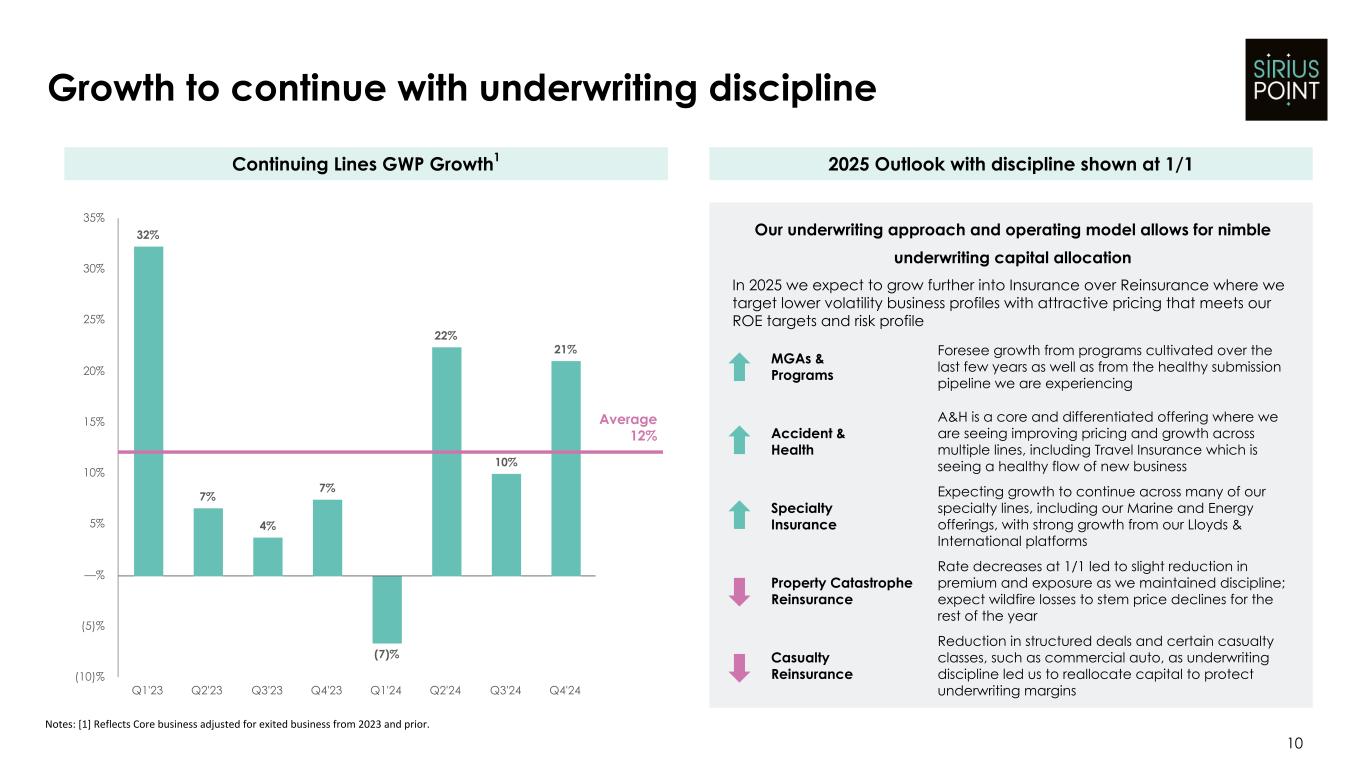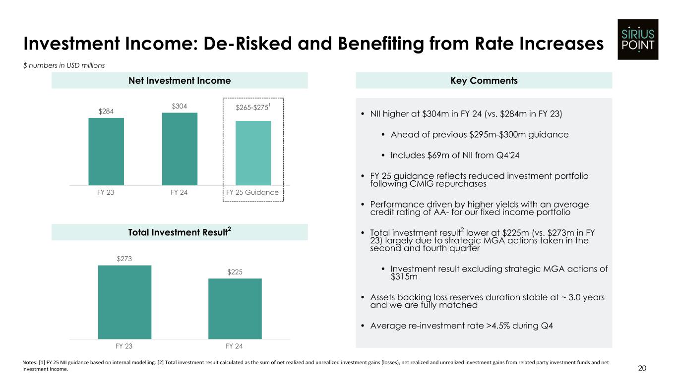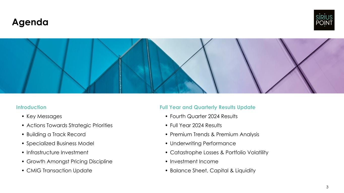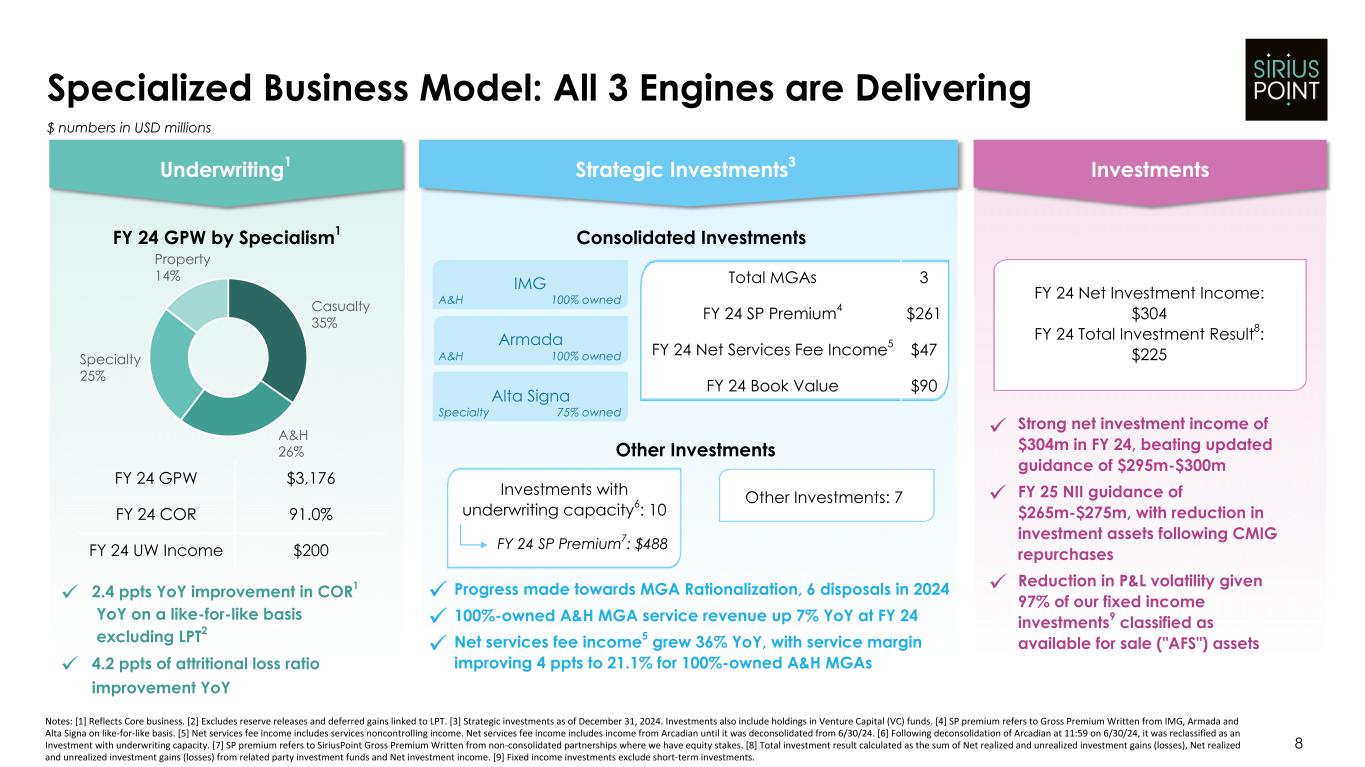 Basis of Presentation and Non-GAAP Financial Measures: Unless the context otherwise indicates or requires, as used in this presentation references to “we,” “our,” “us,” the “Company,” and "SiriusPoint" refer to SiriusPoint Ltd. and its directly and indirectly owned subsidiaries, as a combined entity, except where otherwise stated or where it is clear that the terms mean only SiriusPoint Ltd. exclusive of its subsidiaries. We have made rounding adjustments to reach some of the figures included in this presentation and, unless otherwise indicated, percentages presented in this presentation are approximate. In presenting SiriusPoint’s results, management has included financial measures that are not calculated under standards or rules that comprise accounting principles generally accepted in the United States (“GAAP”). SiriusPoint’s management uses this information in its internal analysis of results and believes that this information may be informative to investors in gauging the quality of SiriusPoint’s financial performance, identifying trends in our results and providing meaningful period-to-period comparisons. Core underwriting income, Core net services income, Core income, Core combined ratio, accident year loss ratio, accident year combined ratio and attritional loss ratio are non-GAAP financial measures. Management believes it is useful to review Core results as it better reflects how management views the business and reflects the Company’s decision to exit the runoff business. Book value per diluted common share excluding accumulated other comprehensive income (loss) ("AOCI") and tangible book value per diluted common share, as presented, are non-GAAP financial measures and the most directly comparable U.S. GAAP measure is book value per common share. Management believes it is useful to exclude AOCI because it may fluctuate significantly between periods based on movements in interest and currency rates. Management believes the effects of intangible assets are not indicative of underlying underwriting results or trends and make book value comparisons to less acquisitive peer companies less meaningful. Underlying net income is a non-GAAP financial measure and the most directly comparable U.S. GAAP measure is net income. Underlying net income excludes items which we believe are not indicative of the operations of our underlying businesses, including realized and unrealized gains (losses) on strategic and other investments and liability-classified capital instruments, income (expense) related to loss portfolio transfers, deferred tax assets attributable to the enactment of the Bermuda corporate income tax, development on COVID-19 reserves resulting from the COVID-19 reserve study performed concurrently with the settlement of the Series A Preference shares in the third quarter of 2024, and foreign exchange gains (losses). We believe it is useful to review underlying net income as it better reflects how we view the business, as well as provides investors with an alternative metric that can assist in predicting future earnings and profitability that are complementary to GAAP metrics. Underlying return on average common shareholders’ equity is calculated by dividing underlying net income available to SiriusPoint common shareholders for the period by the average common shareholders’ equity, excluding AOCI. Management believes it is useful to exclude AOCI because it may fluctuate significantly between periods based on movements in interest and currency rates. A reconciliation of these non-GAAP financial measures to the most directly comparable GAAP measure is contained in our Form 10-K, earnings release or financial Supplement for the fiscal year ended December 31, 2024. Safe Harbor Statement Regarding Forward-Looking Statements: This presentation includes “forward-looking statements” within the meaning of the Private Securities Litigation Reform Act of 1995. Forward-looking statements are subject to known and unknown risks and uncertainties, many of which may be beyond the Company’s control. The Company cautions you that the forward-looking information presented in this presentation is not a guarantee of future events, and that actual events may differ materially from those made in or suggested by the forward-looking information contained in this presentation. In addition, forward-looking statements generally can be identified by the use of forward-looking terminology such as “believes,” “intends,” “seeks,” “anticipates,” “aims,” “plans,” “targets,” “estimates,” “expects,” “assumes,” “continues,” “guidance,” “should,” “could,” “will,” “may” and the negative of these or similar terms and phrases. Specific forward-looking statements in this press release include, but not limited to, statements regarding the trend of our performance as compared to the previous guidance, the success of our strategic transaction with CMIG, the current insurtech market trends, our ability to generate shareholder value and whether we will continue to have momentum in our business in the future. Actual events, results and outcomes may differ materially from the Company’s expectations due to a variety of known and unknown risks, uncertainties and other factors. Among the risks and uncertainties that could cause actual results to differ from those described in the forward-looking statements are the following: our ability to execute on our strategic transformation, including re-underwriting to reduce volatility and improve underwriting performance, de-risking our investment portfolio, and transforming our business; the impact of unpredictable catastrophic events, including uncertainties with respect to current and future COVID-19 losses across many classes of insurance business and the amount of insurance losses that may ultimately be ceded to the reinsurance market, supply chain issues, labor shortages and related i