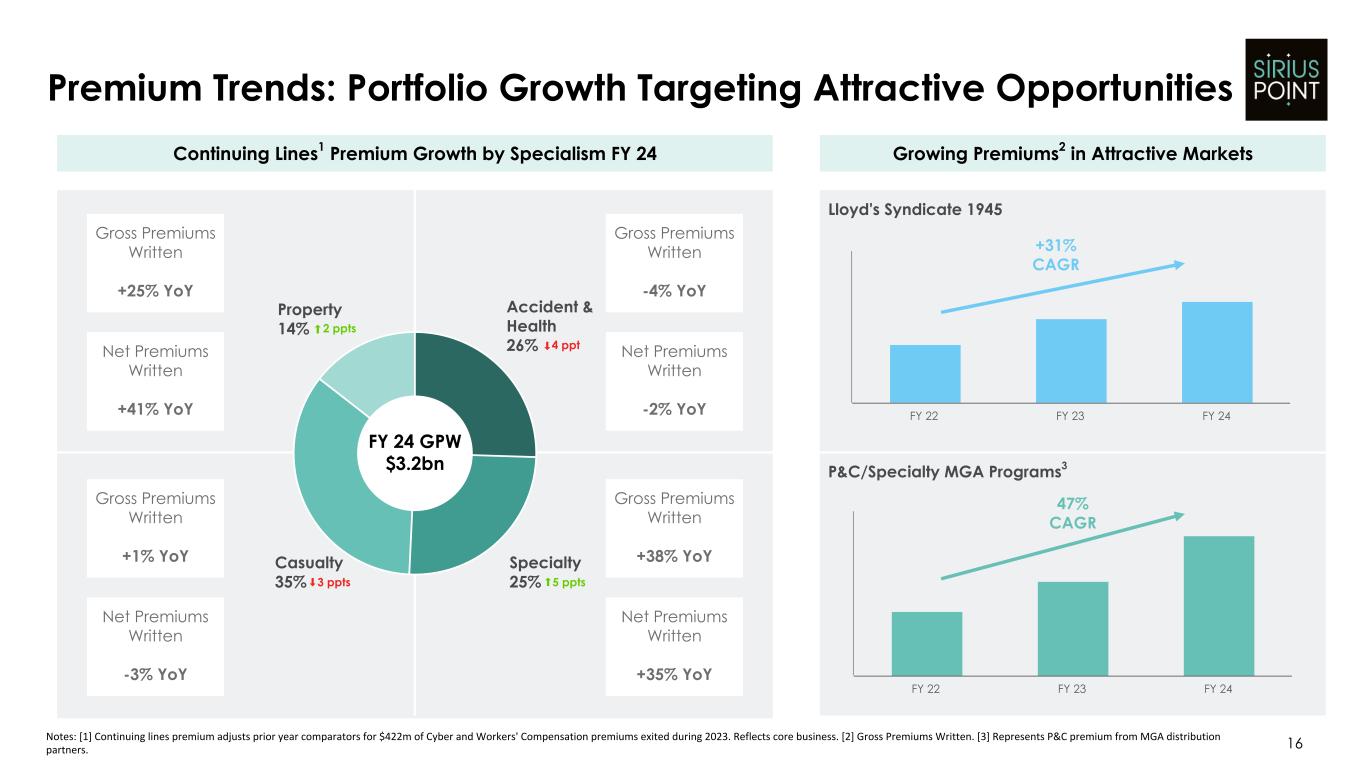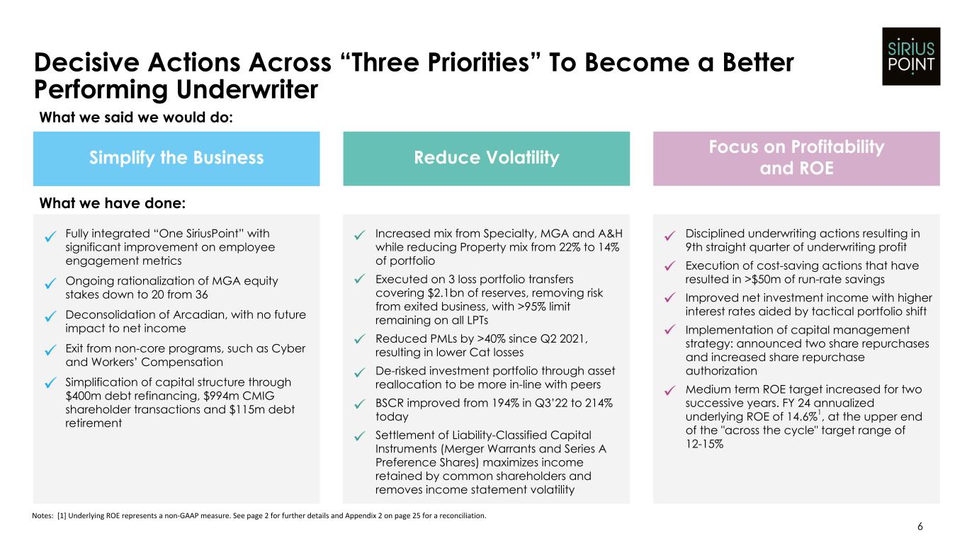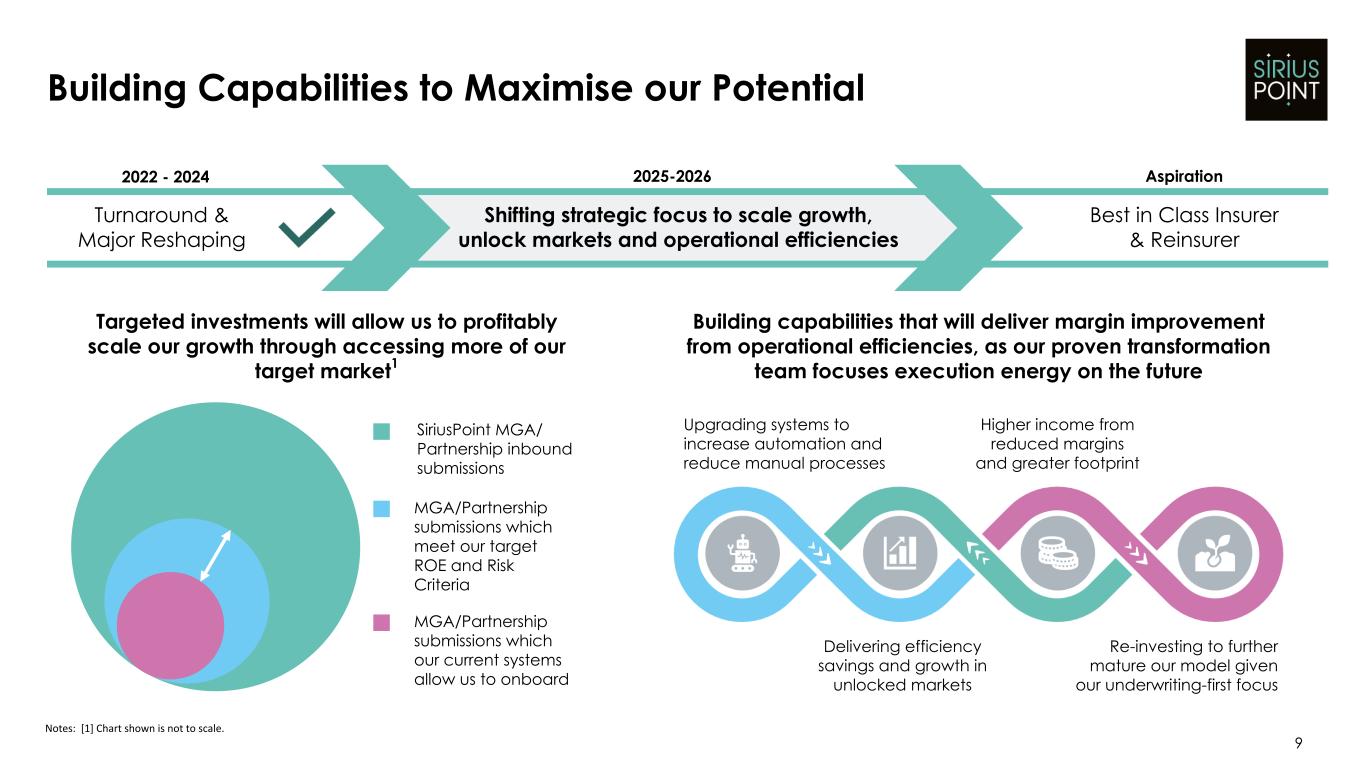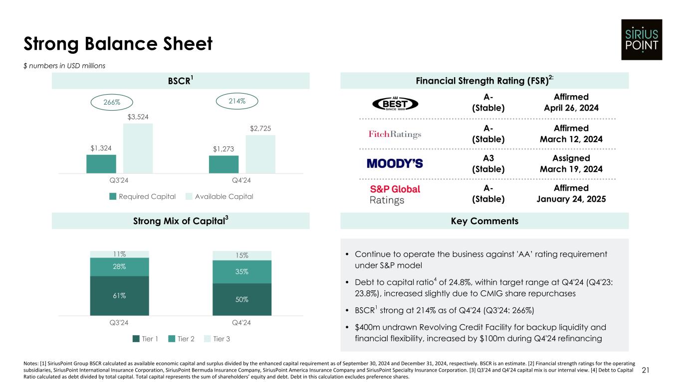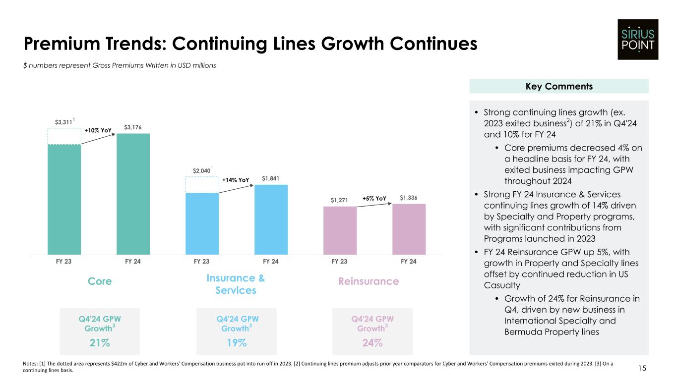 Basis of Presentation and Non-GAAP Financial Measures: Unless the context otherwise indicates or requires, as used in this presentation references to “we,” “our,” “us,” the “Company,” and "SiriusPoint" refer to SiriusPoint Ltd. and its directly and indirectly owned subsidiaries, as a combined entity, except where otherwise stated or where it is clear that the terms mean only SiriusPoint Ltd. exclusive of its subsidiaries. We have made rounding adjustments to reach some of the figures included in this presentation and, unless otherwise indicated, percentages presented in this presentation are approximate. In presenting SiriusPoint’s results, management has included financial measures that are not calculated under standards or rules that comprise accounting principles generally accepted in the United States (“GAAP”). SiriusPoint’s management uses this information in its internal analysis of results and believes that this information may be informative to investors in gauging the quality of SiriusPoint’s financial performance, identifying trends in our results and providing meaningful period-to-period comparisons. Core underwriting income, Core net services income, Core income, Core combined ratio, accident year loss ratio, accident year combined ratio and attritional loss ratio are non-GAAP financial measures. Management believes it is useful to review Core results as it better reflects how management views the business and reflects the Company’s decision to exit the runoff business. Book value per diluted common share excluding accumulated other comprehensive income (loss) ("AOCI") and tangible book value per diluted common share, as presented, are non-GAAP financial measures and the most directly comparable U.S. GAAP measure is book value per common share. Management believes it is useful to exclude AOCI because it may fluctuate significantly between periods based on movements in interest and currency rates. Management believes the effects of intangible assets are not indicative of underlying underwriting results or trends and make book value comparisons to less acquisitive peer companies less meaningful. Underlying net income is a non-GAAP financial measure and the most directly comparable U.S. GAAP measure is net income. Underlying net income excludes items which we believe are not indicative of the operations of our underlying businesses, including realized and unrealized gains (losses) on strategic and other investments and liability-classified capital instruments, income (expense) related to loss portfolio transfers, deferred tax assets attributable to the enactment of the Bermuda corporate income tax, development on COVID-19 reserves resulting from the COVID-19 reserve study performed concurrently with the settlement of the Series A Preference shares in the third quarter of 2024, and foreign exchange gains (losses). We believe it is useful to review underlying net income as it better reflects how we view the business, as well as provides investors with an alternative metric that can assist in predicting future earnings and profitability that are complementary to GAAP metrics. Underlying return on average common shareholders’ equity is calculated by dividing underlying net income available to SiriusPoint common shareholders for the period by the average common shareholders’ equity, excluding AOCI. Management believes it is useful to exclude AOCI because it may fluctuate significantly between periods based on movements in interest and currency rates. A reconciliation of these non-GAAP financial measures to the most directly comparable GAAP measure is contained in our Form 10-K, earnings release or financial Supplement for the fiscal year ended December 31, 2024. Safe Harbor Statement Regarding Forward-Looking Statements: This presentation includes “forward-looking statements” within the meaning of the Private Securities Litigation Reform Act of 1995. Forward-looking statements are subject to known and unknown risks and uncertainties, many of which may be beyond the Company’s control. The Company cautions you that the forward-looking information presented in this presentation is not a guarantee of future events, and that actual events may differ materially from those made in or suggested by the forward-looking information contained in this presentation. In addition, forward-looking statements generally can be identified by the use of forward-looking terminology such as “believes,” “intends,” “seeks,” “anticipates,” “aims,” “plans,” “targets,” “estimates,” “expects,” “assumes,” “continues,” “guidance,” “should,” “could,” “will,” “may” and the negative of these or similar terms and phrases. Specific forward-looking statements in this press release include, but not limited to, statements regarding the trend of our performance as compared to the previous guidance, the success of our strategic transaction with CMIG, the current insurtech market trends, our ability to generate shareholder value and whether we will continue to have momentum in our business in the future. Actual events, results and outcomes may differ materially from the Company’s expectations due to a variety of known and unknown risks, uncertainties and other factors. Among the risks and uncertainties that could cause actual results to differ from those described in the forward-looking statements are the following: our ability to execute on our strategic transformation, including re-underwriting to reduce volatility and improve underwriting performance, de-risking our investment portfolio, and transforming our business; the impact of unpredictable catastrophic events, including uncertainties with respect to current and future COVID-19 losses across many classes of insurance business and the amount of insurance losses that may ultimately be ceded to the reinsurance market, supply chain issues, labor shortages and related i