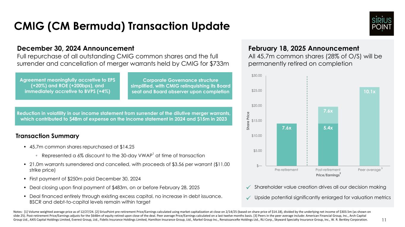 CMIG (CM Bermuda) Transaction Update Notes: [1] Volume weighted average price as of 12/27/24. [2] SiriusPoint pre-retirement Price/Earnings calculated using market capitalization at close on 2/14/25 (based on share price of $14.18), divided by the underlying net income of $303.5m (as shown on slide 25). Post-retirement Price/Earnings adjusts for the $648m of equity retired upon close of the deal. Peer average Price/Earnings calculated on a last twelve months basis. [3] Peers in the peer average include: American Financial Group, Inc., Arch Capital Group Ltd., AXIS Capital Holdings Limited, Everest Group, Ltd., Fidelis Insurance Holdings Limited, Hamilton Insurance Group, Ltd., Markel Group Inc., RenaissanceRe Holdings Ltd., RLI Corp., Skyward Specialty Insurance Group, Inc., W. R. Berkley Corporation. • 45.7m common shares repurchased at $14.25 ◦ Represented a 6% discount to the 30-day VWAP1 at time of transaction • 21.0m warrants surrendered and cancelled, with proceeds of $3.56 per warrant ($11.00 strike price) • First payment of $250m paid December 30, 2024 • Deal closing upon final payment of $483m, on or before February 28, 2025 • Deal financed entirely through existing excess capital, no increase in debt issuance. BSCR and debt-to-capital levels remain within target December 30, 2024 Announcement Full repurchase of all outstanding CMIG common shares and the full surrender and cancellation of merger warrants held by CMIG for $733m 11 February 18, 2025 Announcement All 45.7m common shares (28% of O/S) will be permanently retired on completion Shareholder value creation drives all our decision making Upside potential significantly enlarged for valuation metrics Price/Earnings Sh a re P ric e Pre-retirement Post-retirement Peer average $— $5.00 $10.00 $15.00 $20.00 $25.00 $30.00 7.6x 5.4x 7.6x 10.1x Transaction Summary Agreement meaningfully accretive to EPS (+20%) and ROE (+200bps), and immediately accretive to BVPS (+4%) Corporate Governance structure simplified, with CMIG relinquishing its Board seat and Board observer upon completion Reduction in volatility in our income statement from surrender of the dilutive merger warrants, which contributed to $48m of expense on the income statement in 2024 and $15m in 2023 2 3