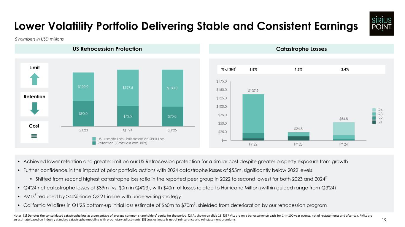 18 Portfolio Actions in 2022 have Drastically Reduced our Volatility Notes: Consolidated catastrophe loss ratio used, except for AIG (General Insurance Catastrophe Loss Ratio), AFG (Property and Casualty Insurance Catastrophe Loss Ratio) and Chubb (P&C Underwriting Catastrophe Loss Ratio). Catastrophe Loss Ratio calculated as catastrophe losses divided by net premiums earned where not supplied by peers. SiriusPoint catastrophe loss ratio relates to the core segment. AFG refers to American Financial Group, Inc., AIG refers to American International Group, Inc., Arch refers to Arch Capital Group Ltd., AXIS refers to AXIS Capital Holdings Limited, Chubb refers to Chubb Limited, Everest refers to Everest Group, Markel refers to Markel Group Inc., Selective refers to Selective Insurance Group, Inc., Travelers refers to The Travelers Companies, Inc. and WR Berkley refers to W. R. Berkley Corporation. 9.0% 7.8% 7.8% 6.0% 5.9% 5.5% 5.0% 4.3% 2.2% 1.6% 0.6% Everest Arch AXIS SiriusPoint Chubb Travelers AIG Selective WR Berkley AFG Markel 7.9% 6.4% 4.5% 4.3% 4.1% 3.5% 2.7% 2.6% 1.9% 0.6% 0.5% Travelers Selective Chubb AIG Arch Everest AXIS AFG WR Berkley SiriusPoint Markel 8.0% 7.3% 6.5% 5.5% 5.0% 5.0% 4.3% 2.6% 2.5% 2.5% 0.8% Travelers Arch Selective Chubb AIG Everest AXIS WR Berkley AFG SiriusPoint Markel FY 2022 Catastrophe Loss Ratio FY 2023 Catastrophe Loss Ratio FY 2024 Catastrophe Loss Ratio