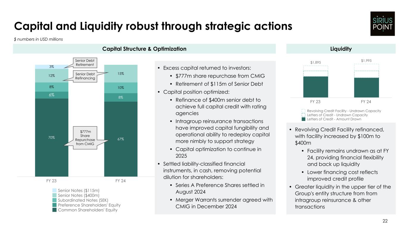 $1,324 $1,273 $3,524 $2,725 Required Capital Available Capital Q3'24 Q4'24 21 Notes: [1] SiriusPoint Group BSCR calculated as available economic capital and surplus divided by the enhanced capital requirement as of September 30, 2024 and December 31, 2024, respectively. BSCR is an estimate. [2] Financial strength ratings for the operating subsidiaries, SiriusPoint International Insurance Corporation, SiriusPoint Bermuda Insurance Company, SiriusPoint America Insurance Company and SiriusPoint Specialty Insurance Corporation. [3] Q3'24 and Q4'24 capital mix is our internal view. [4] Debt to Capital Ratio calculated as debt divided by total capital. Total capital represents the sum of shareholders’ equity and debt. Debt in this calculation excludes preference shares. Strong Balance Sheet 266% 214% • Continue to operate the business against 'AA’ rating requirement under S&P model • Debt to capital ratio4 of 24.8%, within target range at Q4'24 (Q4'23: 23.8%), increased slightly due to CMIG share repurchases • BSCR1 strong at 214% as of Q4'24 (Q3'24: 266%) • $400m undrawn Revolving Credit Facility for backup liquidity and financial flexibility, increased by $100m during Q4'24 refinancing Financial Strength Rating (FSR)2: Key Comments A- (Stable) A- (Stable) A- (Stable) 61% 50% 28% 35% 11% 15% Tier 1 Tier 2 Tier 3 Q3'24 Q4'24 Affirmed March 12, 2024 Affirmed January 24, 2025 Affirmed April 26, 2024 Strong Mix of Capital3 BSCR1 $ numbers in USD millions A3 (Stable) Assigned March 19, 2024
