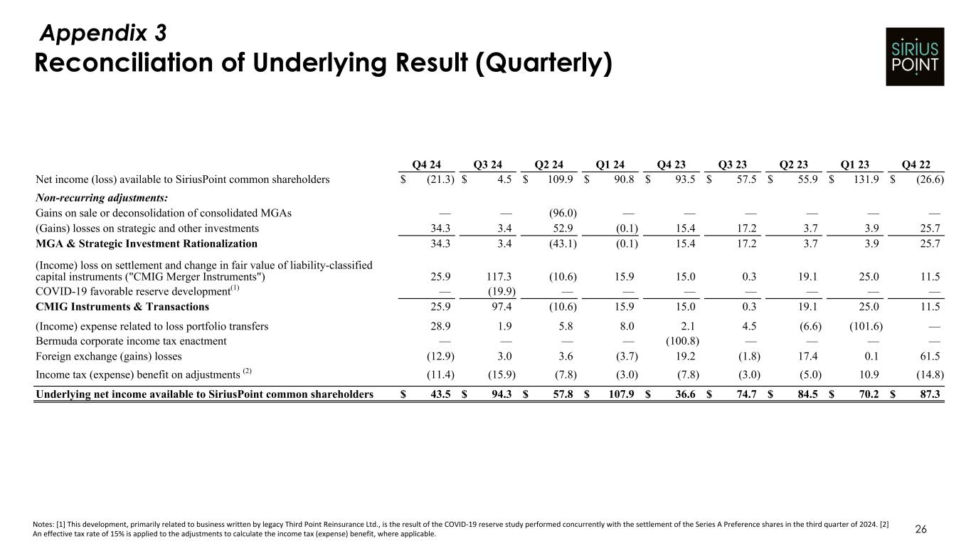 25 Appendix 2 Reconciliation of Underlying Result (Annual) 2024 2023 Net income available to SiriusPoint common shareholders $ 183.9 $ 338.8 Non-recurring adjustments: Gains on sale or deconsolidation of consolidated MGAs (96.0) — Losses on strategic and other investments 90.5 40.2 MGA & Strategic Investment Rationalization (5.5) 40.2 Losses on settlement and change in fair value of liability-classified capital instruments ("CMIG Merger Instruments") 148.5 59.4 COVID-19 favorable reserve development(1) (19.9) — CMIG Instruments & Transactions 128.6 59.4 (Income) expense related to loss portfolio transfers 44.6 (101.6) Bermuda corporate income tax enactment — (100.8) Foreign exchange (gains) losses (10.0) 34.9 Income tax expense on adjustments (2) (38.1) (4.9) Underlying net income available to SiriusPoint common shareholders $ 303.5 $ 266.0 Common shareholders’ equity attributable to SiriusPoint common shareholders - beginning of period $ 2,313.9 $ 1,874.7 Accumulated other comprehensive income (loss), net of tax 3.1 (45.0) Common shareholders’ equity attributable to SiriusPoint common shareholders ex AOCI - beginning of period 2,310.8 1,919.7 Common shareholders’ equity attributable to SiriusPoint common shareholders - end of period 1,737.4 2,313.9 Impact of adjustments from above 119.6 (72.8) Accumulated other comprehensive income (loss), net of tax (4.1) 3.1 Common shareholders’ equity attributable to SiriusPoint common shareholders ex AOCI - end of period 1,861.1 2,238.0 Average common shareholders’ equity attributable to SiriusPoint common shareholders ex AOCI $ 2,086.0 $ 2,078.8 Return on average common shareholders’ equity attributable to SiriusPoint common shareholders 9.1 % 16.2 % Underlying return on average common shareholders’ equity attributable to SiriusPoint common shareholders ex AOCI 14.6 % 12.8 % Notes: [1] This development, primarily related to business written by legacy Third Point Reinsurance Ltd., is the result of the COVID-19 reserve study performed concurrently with the settlement of the Series A Preference shares in the third quarter of 2024. [2] An effective tax rate of 15% is applied to the adjustments to calculate the income tax expense, where applicable.
