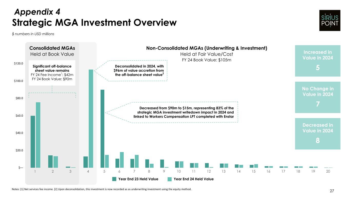 26 Appendix 3 Reconciliation of Underlying Result (Quarterly) Q4 24 Q3 24 Q2 24 Q1 24 Q4 23 Q3 23 Q2 23 Q1 23 Q4 22 Net income (loss) available to SiriusPoint common shareholders $ (21.3) $ 4.5 $ 109.9 $ 90.8 $ 93.5 $ 57.5 $ 55.9 $ 131.9 $ (26.6) Non-recurring adjustments: Gains on sale or deconsolidation of consolidated MGAs — — (96.0) — — — — — — (Gains) losses on strategic and other investments 34.3 3.4 52.9 (0.1) 15.4 17.2 3.7 3.9 25.7 MGA & Strategic Investment Rationalization 34.3 3.4 (43.1) (0.1) 15.4 17.2 3.7 3.9 25.7 (Income) loss on settlement and change in fair value of liability-classified capital instruments ("CMIG Merger Instruments") 25.9 117.3 (10.6) 15.9 15.0 0.3 19.1 25.0 11.5 COVID-19 favorable reserve development(1) — (19.9) — — — — — — — CMIG Instruments & Transactions 25.9 97.4 (10.6) 15.9 15.0 0.3 19.1 25.0 11.5 (Income) expense related to loss portfolio transfers 28.9 1.9 5.8 8.0 2.1 4.5 (6.6) (101.6) — Bermuda corporate income tax enactment — — — — (100.8) — — — — Foreign exchange (gains) losses (12.9) 3.0 3.6 (3.7) 19.2 (1.8) 17.4 0.1 61.5 Income tax (expense) benefit on adjustments (2) (11.4) (15.9) (7.8) (3.0) (7.8) (3.0) (5.0) 10.9 (14.8) Underlying net income available to SiriusPoint common shareholders $ 43.5 $ 94.3 $ 57.8 $ 107.9 $ 36.6 $ 74.7 $ 84.5 $ 70.2 $ 87.3 Notes: [1] This development, primarily related to business written by legacy Third Point Reinsurance Ltd., is the result of the COVID-19 reserve study performed concurrently with the settlement of the Series A Preference shares in the third quarter of 2024. [2] An effective tax rate of 15% is applied to the adjustments to calculate the income tax (expense) benefit, where applicable.