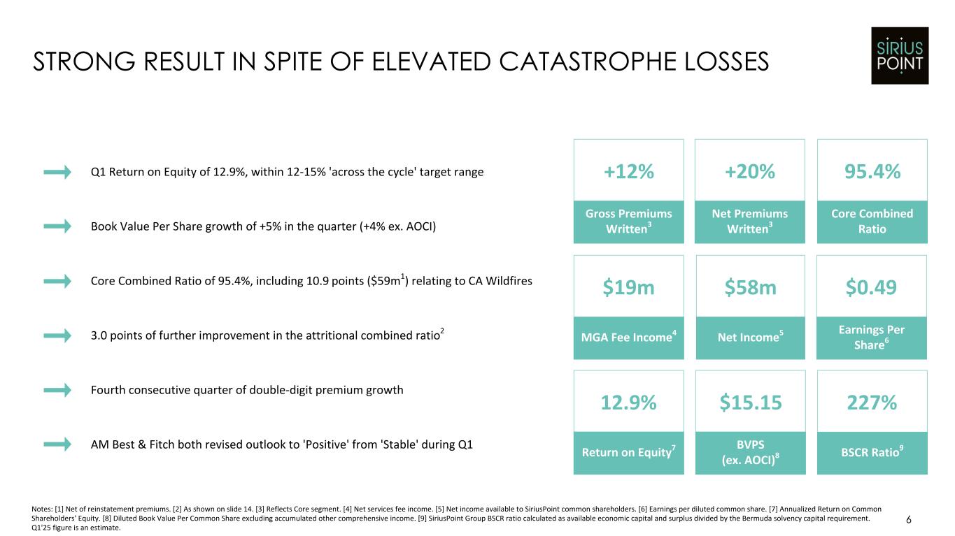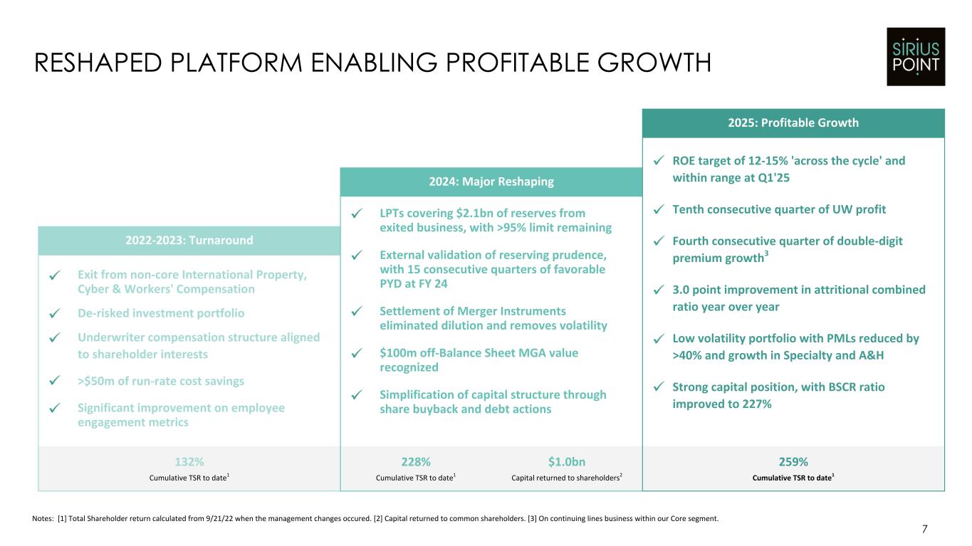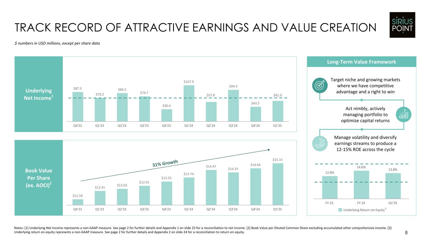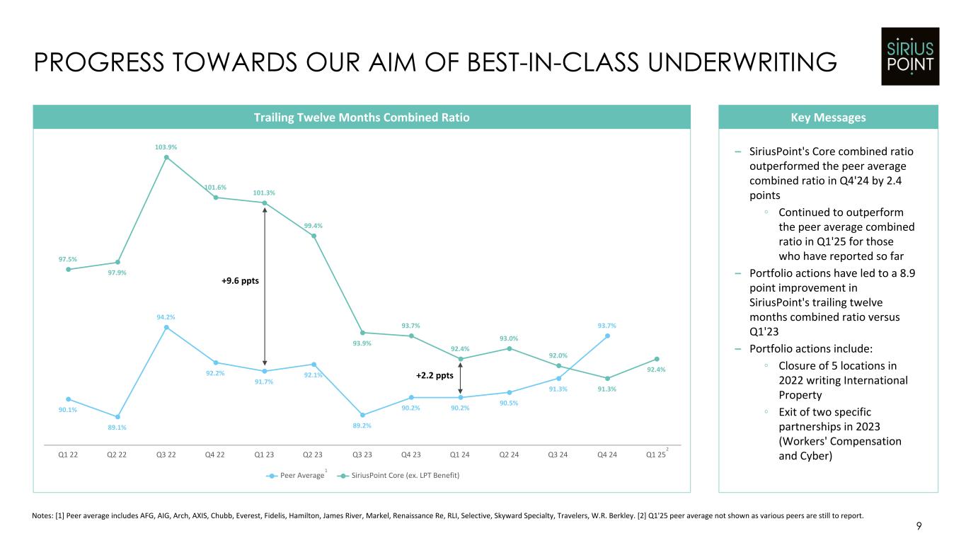 Basis of Presentation and Non-GAAP Financial Measures: Unless the context otherwise indicates or requires, as used in this presentation references to “we,” “our,” “us,” the “Company,” and "SiriusPoint" refer to SiriusPoint Ltd. and its directly and indirectly owned subsidiaries, as a combined entity, except where otherwise stated or where it is clear that the terms mean only SiriusPoint Ltd. exclusive of its subsidiaries. We have made rounding adjustments to reach some of the figures included in this presentation and, unless otherwise indicated, percentages presented in this presentation are approximate. In presenting SiriusPoint’s results, management has included financial measures that are not calculated under standards or rules that comprise accounting principles generally accepted in the United States (“GAAP”). SiriusPoint’s management uses this information in its internal analysis of results and believes that this information may be informative to investors in gauging the quality of SiriusPoint’s financial performance, identifying trends in our results and providing meaningful period-to-period comparisons. Core underwriting income, Core net services income, Core income, Core combined ratio, accident year loss ratio, accident year combined ratio, attritional loss ratio and attritional combined ratio are non-GAAP financial measures. Management believes it is useful to review Core results as it better reflects how management views the business and reflects the Company’s decision to exit the runoff business. Book value per diluted common share excluding accumulated other comprehensive income (loss) ("AOCI") and tangible book value per diluted common share, as presented, are non-GAAP financial measures and the most directly comparable U.S. GAAP measure is book value per common share. Management believes it is useful to exclude AOCI because it may fluctuate significantly between periods based on movements in interest and currency rates. Management believes the effects of intangible assets are not indicative of underlying underwriting results or trends and make book value comparisons to less acquisitive peer companies less meaningful. Underlying net income is a non-GAAP financial measure and the most directly comparable U.S. GAAP measure is net income. Underlying net income excludes items which we believe are not indicative of the operations of our underlying businesses, including realized and unrealized gains (losses) on strategic and other investments and liability-classified capital instruments, income (expense) related to loss portfolio transfers, deferred tax assets attributable to the enactment of the Bermuda corporate income tax, development on COVID-19 reserves resulting from the COVID-19 reserve study performed concurrently with the settlement of the Series A Preference shares in the third quarter of 2024, and foreign exchange gains (losses). We believe it is useful to review underlying net income as it better reflects how we view the business, as well as provides investors with an alternative metric that can assist in predicting future earnings and profitability that are complementary to GAAP metrics. Underlying return on average common shareholders’ equity is calculated by dividing underlying net income available to SiriusPoint common shareholders for the period by the average common shareholders’ equity, excluding AOCI. Management believes it is useful to exclude AOCI because it may fluctuate significantly between periods based on movements in interest and currency rates. A reconciliation of these non-GAAP financial measures to the most directly comparable GAAP measure is contained in our Form 10-Q, earnings release or financial Supplement for the quarter ended March 31, 2025. Safe Harbor Statement Regarding Forward-Looking Statements: This presentation includes “forward-looking statements” within the meaning of the Private Securities Litigation Reform Act of 1995. Forward-looking statements are subject to known and unknown risks and uncertainties, many of which may be beyond the Company’s control. The Company cautions you that the forward-looking information presented in this presentation is not a guarantee of future events, and that actual events may differ materially from those made in or suggested by the forward-looking information contained in this presentation. In addition, forward-looking statements generally can be identified by the use of forward-looking terminology such as “believes,” “intends,” “seeks,” “anticipates,” “aims,” “plans,” “targets,” “estimates,” “expects,” “assumes,” “continues,” “guidance,” “should,” “could,” “will,” “may” and the negative of these or similar terms and phrases. Specific forward-looking statements in this presentation include, but not limited to, statements regarding the trend of our performance as compared to the previous guidance, the future success from our strategic transaction with CMIG, the current insurtech market trends, our ability to generate shareholder value and whether we will continue to have momentum in our business in the future. Actual events, results and outcomes may differ materially from the Company’s expectations due to a variety of known and unknown risks, uncertainties and other factors. Among the risks and uncertainties that could cause actual results to differ from those described in the forward-looking statements are the following: our ability to execute on our strategic transformation, including re-underwriting to reduce volatility and improve underwriting performance, de-risking our investment portfolio, and transforming our business; the impact of unpredictable catastrophic events, including uncertainties with respect to current and future COVID-19 losses across many classes of insurance business and the amount of insurance losses that may ultimately be ceded to the reinsurance market, supply chain issues, 