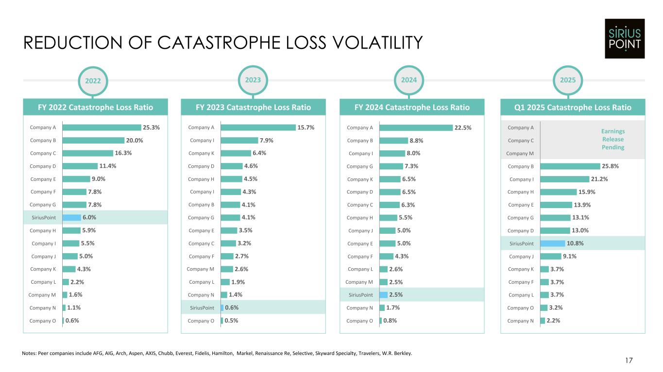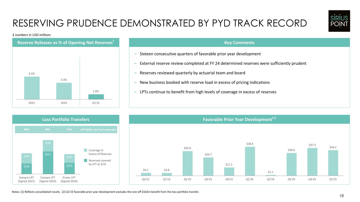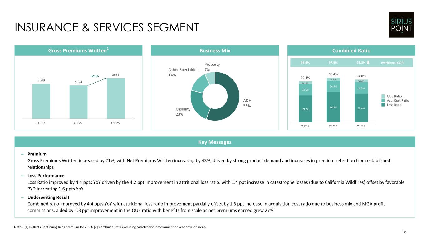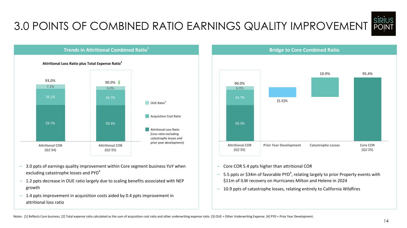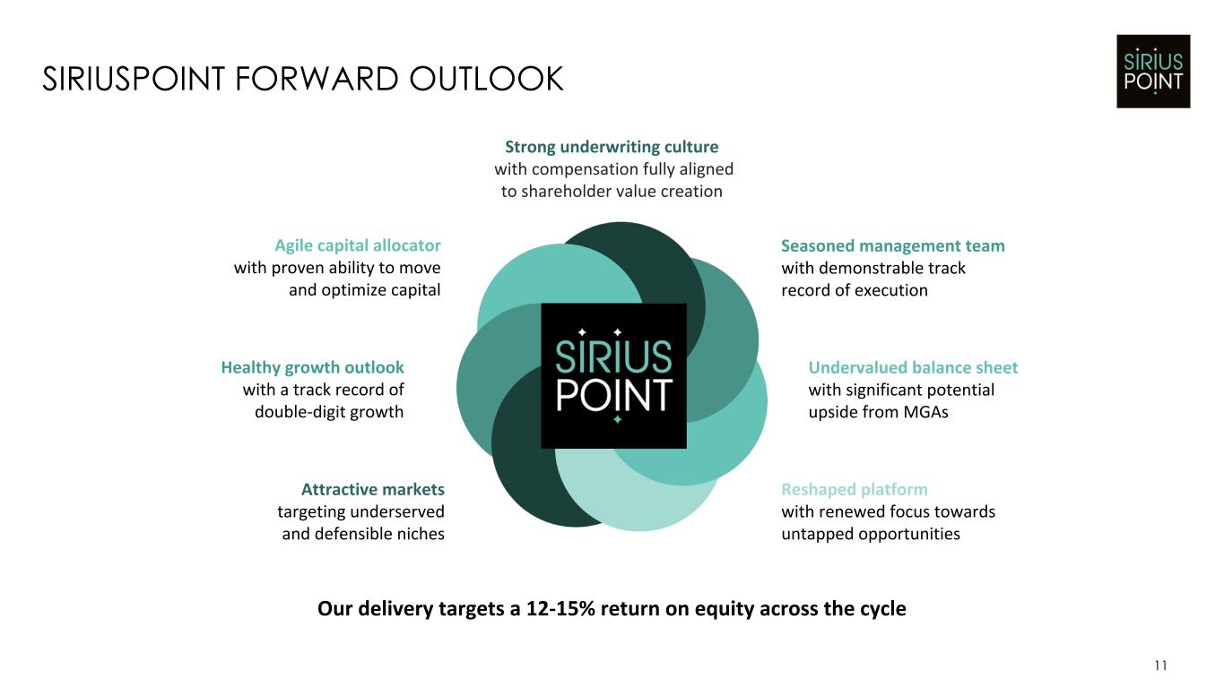 Basis of Presentation and Non-GAAP Financial Measures: Unless the context otherwise indicates or requires, as used in this presentation references to “we,” “our,” “us,” the “Company,” and "SiriusPoint" refer to SiriusPoint Ltd. and its directly and indirectly owned subsidiaries, as a combined entity, except where otherwise stated or where it is clear that the terms mean only SiriusPoint Ltd. exclusive of its subsidiaries. We have made rounding adjustments to reach some of the figures included in this presentation and, unless otherwise indicated, percentages presented in this presentation are approximate. In presenting SiriusPoint’s results, management has included financial measures that are not calculated under standards or rules that comprise accounting principles generally accepted in the United States (“GAAP”). SiriusPoint’s management uses this information in its internal analysis of results and believes that this information may be informative to investors in gauging the quality of SiriusPoint’s financial performance, identifying trends in our results and providing meaningful period-to-period comparisons. Core underwriting income, Core net services income, Core income, Core combined ratio, accident year loss ratio, accident year combined ratio, attritional loss ratio and attritional combined ratio are non-GAAP financial measures. Management believes it is useful to review Core results as it better reflects how management views the business and reflects the Company’s decision to exit the runoff business. Book value per diluted common share excluding accumulated other comprehensive income (loss) ("AOCI") and tangible book value per diluted common share, as presented, are non-GAAP financial measures and the most directly comparable U.S. GAAP measure is book value per common share. Management believes it is useful to exclude AOCI because it may fluctuate significantly between periods based on movements in interest and currency rates. Management believes the effects of intangible assets are not indicative of underlying underwriting results or trends and make book value comparisons to less acquisitive peer companies less meaningful. Underlying net income is a non-GAAP financial measure and the most directly comparable U.S. GAAP measure is net income. Underlying net income excludes items which we believe are not indicative of the operations of our underlying businesses, including realized and unrealized gains (losses) on strategic and other investments and liability-classified capital instruments, income (expense) related to loss portfolio transfers, deferred tax assets attributable to the enactment of the Bermuda corporate income tax, development on COVID-19 reserves resulting from the COVID-19 reserve study performed concurrently with the settlement of the Series A Preference shares in the third quarter of 2024, and foreign exchange gains (losses). We believe it is useful to review underlying net income as it better reflects how we view the business, as well as provides investors with an alternative metric that can assist in predicting future earnings and profitability that are complementary to GAAP metrics. Underlying return on average common shareholders’ equity is calculated by dividing underlying net income available to SiriusPoint common shareholders for the period by the average common shareholders’ equity, excluding AOCI. Management believes it is useful to exclude AOCI because it may fluctuate significantly between periods based on movements in interest and currency rates. A reconciliation of these non-GAAP financial measures to the most directly comparable GAAP measure is contained in our Form 10-Q, earnings release or financial Supplement for the quarter ended March 31, 2025. Safe Harbor Statement Regarding Forward-Looking Statements: This presentation includes “forward-looking statements” within the meaning of the Private Securities Litigation Reform Act of 1995. Forward-looking statements are subject to known and unknown risks and uncertainties, many of which may be beyond the Company’s control. The Company cautions you that the forward-looking information presented in this presentation is not a guarantee of future events, and that actual events may differ materially from those made in or suggested by the forward-looking information contained in this presentation. In addition, forward-looking statements generally can be identified by the use of forward-looking terminology such as “believes,” “intends,” “seeks,” “anticipates,” “aims,” “plans,” “targets,” “estimates,” “expects,” “assumes,” “continues,” “guidance,” “should,” “could,” “will,” “may” and the negative of these or similar terms and phrases. Specific forward-looking statements in this presentation include, but not limited to, statements regarding the trend of our performance as compared to the previous guidance, the future success from our strategic transaction with CMIG, the current insurtech market trends, our ability to generate shareholder value and whether we will continue to have momentum in our business in the future. Actual events, results and outcomes may differ materially from the Company’s expectations due to a variety of known and unknown risks, uncertainties and other factors. Among the risks and uncertainties that could cause actual results to differ from those described in the forward-looking statements are the following: our ability to execute on our strategic transformation, including re-underwriting to reduce volatility and improve underwriting performance, de-risking our investment portfolio, and transforming our business; the impact of unpredictable catastrophic events, including uncertainties with respect to current and future COVID-19 losses across many classes of insurance business and the amount of insurance losses that may ultimately be ceded to the reinsurance market, supply chain issues, 