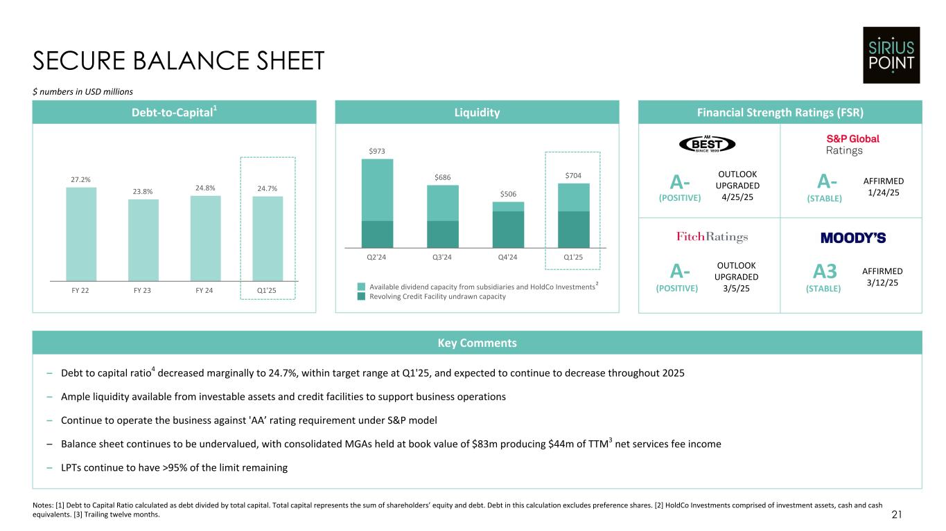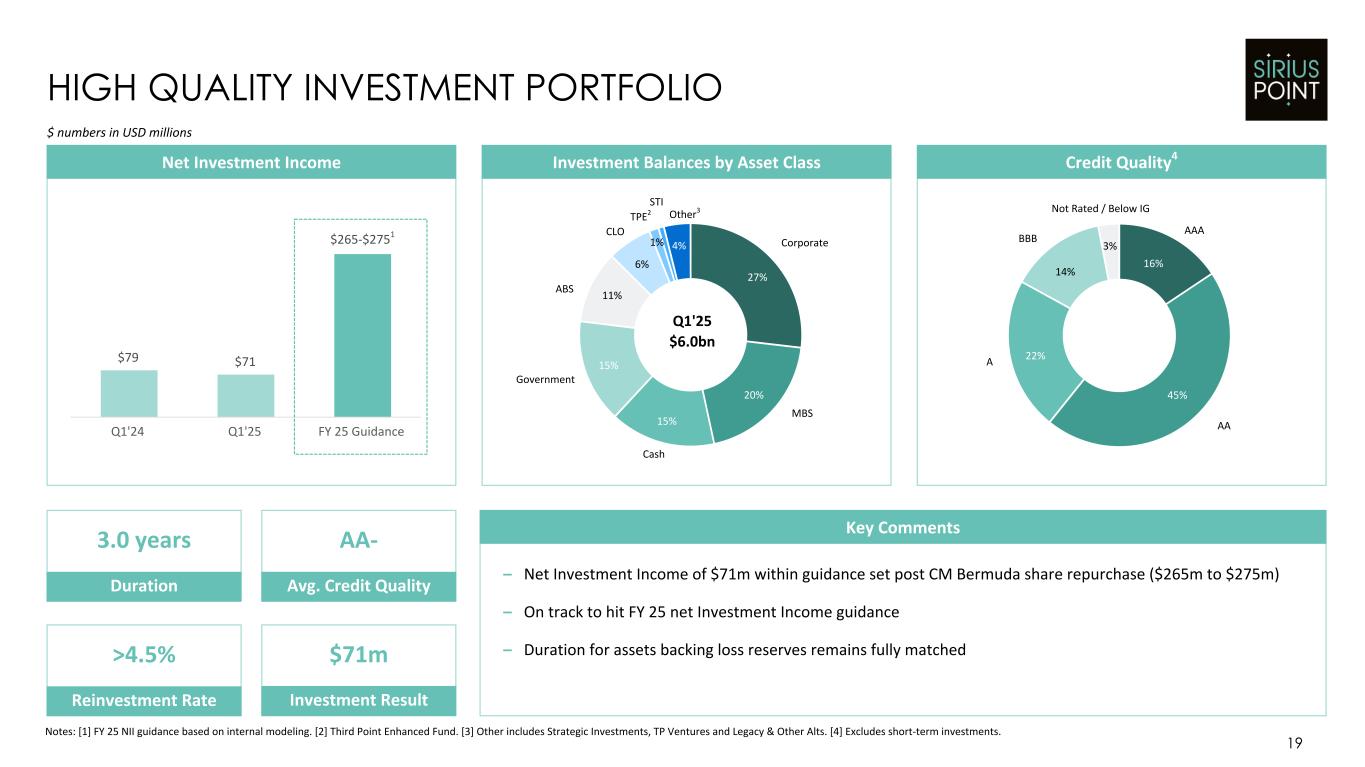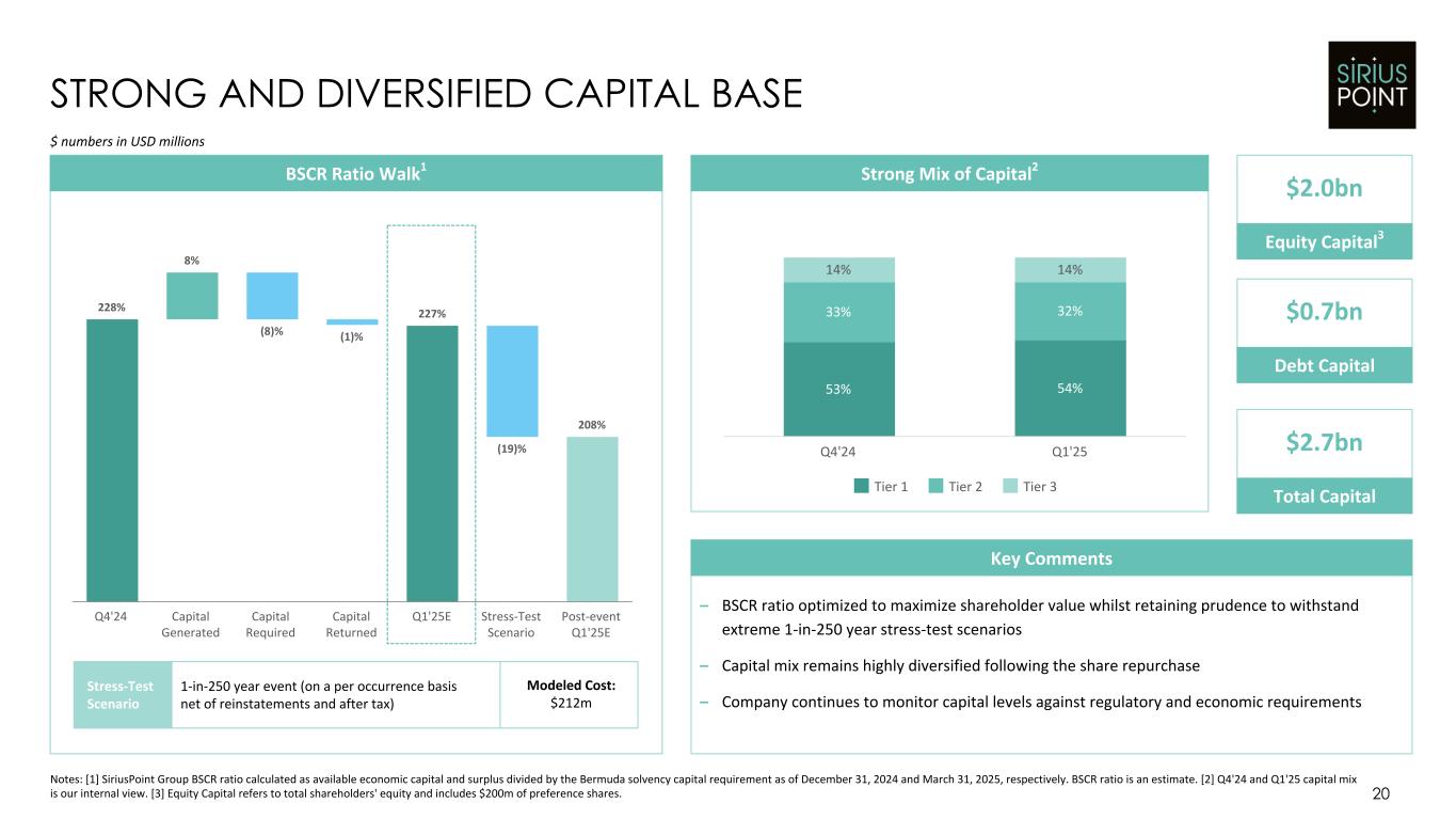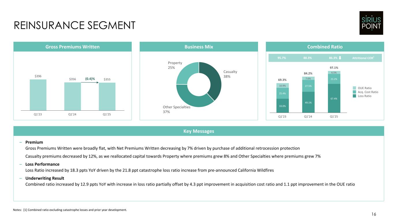Basis of Presentation and Non-GAAP Financial Measures: Unless the context otherwise indicates or requires, as used in this presentation references to “we,” “our,” “us,” the “Company,” and "SiriusPoint" refer to SiriusPoint Ltd. and its directly and indirectly owned subsidiaries, as a combined entity, except where otherwise stated or where it is clear that the terms mean only SiriusPoint Ltd. exclusive of its subsidiaries. We have made rounding adjustments to reach some of the figures included in this presentation and, unless otherwise indicated, percentages presented in this presentation are approximate. In presenting SiriusPoint’s results, management has included financial measures that are not calculated under standards or rules that comprise accounting principles generally accepted in the United States (“GAAP”). SiriusPoint’s management uses this information in its internal analysis of results and believes that this information may be informative to investors in gauging the quality of SiriusPoint’s financial performance, identifying trends in our results and providing meaningful period-to-period comparisons. Core underwriting income, Core net services income, Core income, Core combined ratio, accident year loss ratio, accident year combined ratio, attritional loss ratio and attritional combined ratio are non-GAAP financial measures. Management believes it is useful to review Core results as it better reflects how management views the business and reflects the Company’s decision to exit the runoff business. Book value per diluted common share excluding accumulated other comprehensive income (loss) ("AOCI") and tangible book value per diluted common share, as presented, are non-GAAP financial measures and the most directly comparable U.S. GAAP measure is book value per common share. Management believes it is useful to exclude AOCI because it may fluctuate significantly between periods based on movements in interest and currency rates. Management believes the effects of intangible assets are not indicative of underlying underwriting results or trends and make book value comparisons to less acquisitive peer companies less meaningful. Underlying net income is a non-GAAP financial measure and the most directly comparable U.S. GAAP measure is net income. Underlying net income excludes items which we believe are not indicative of the operations of our underlying businesses, including realized and unrealized gains (losses) on strategic and other investments and liability-classified capital instruments, income (expense) related to loss portfolio transfers, deferred tax assets attributable to the enactment of the Bermuda corporate income tax, development on COVID-19 reserves resulting from the COVID-19 reserve study performed concurrently with the settlement of the Series A Preference shares in the third quarter of 2024, and foreign exchange gains (losses). We believe it is useful to review underlying net income as it better reflects how we view the business, as well as provides investors with an alternative metric that can assist in predicting future earnings and profitability that are complementary to GAAP metrics. Underlying return on average common shareholders’ equity is calculated by dividing underlying net income available to SiriusPoint common shareholders for the period by the average common shareholders’ equity, excluding AOCI. Management believes it is useful to exclude AOCI because it may fluctuate significantly between periods based on movements in interest and currency rates. A reconciliation of these non-GAAP financial measures to the most directly comparable GAAP measure is contained in our Form 10-Q, earnings release or financial Supplement for the quarter ended March 31, 2025. Safe Harbor Statement Regarding Forward-Looking Statements: This presentation includes “forward-looking statements” within the meaning of the Private Securities Litigation Reform Act of 1995. Forward-looking statements are subject to known and unknown risks and uncertainties, many of which may be beyond the Company’s control. The Company cautions you that the forward-looking information presented in this presentation is not a guarantee of future events, and that actual events may differ materially from those made in or suggested by the forward-looking information contained in this presentation. In addition, forward-looking statements generally can be identified by the use of forward-looking terminology such as “believes,” “intends,” “seeks,” “anticipates,” “aims,” “plans,” “targets,” “estimates,” “expects,” “assumes,” “continues,” “guidance,” “should,” “could,” “will,” “may” and the negative of these or similar terms and phrases. Specific forward-looking statements in this presentation include, but not limited to, statements regarding the trend of our performance as compared to the previous guidance, the future success from our strategic transaction with CMIG, the current insurtech market trends, our ability to generate shareholder value and whether we will continue to have momentum in our business in the future. Actual events, results and outcomes may differ materially from the Company’s expectations due to a variety of known and unknown risks, uncertainties and other factors. Among the risks and uncertainties that could cause actual results to differ from those described in the forward-looking statements are the following: our ability to execute on our strategic transformation, including re-underwriting to reduce volatility and improve underwriting performance, de-risking our investment portfolio, and transforming our business; the impact of unpredictable catastrophic events, including uncertainties with respect to current and future COVID-19 losses across many classes of insurance business and the amount of insurance losses that may ultimately be ceded to the reinsurance market, supply chain issues, 