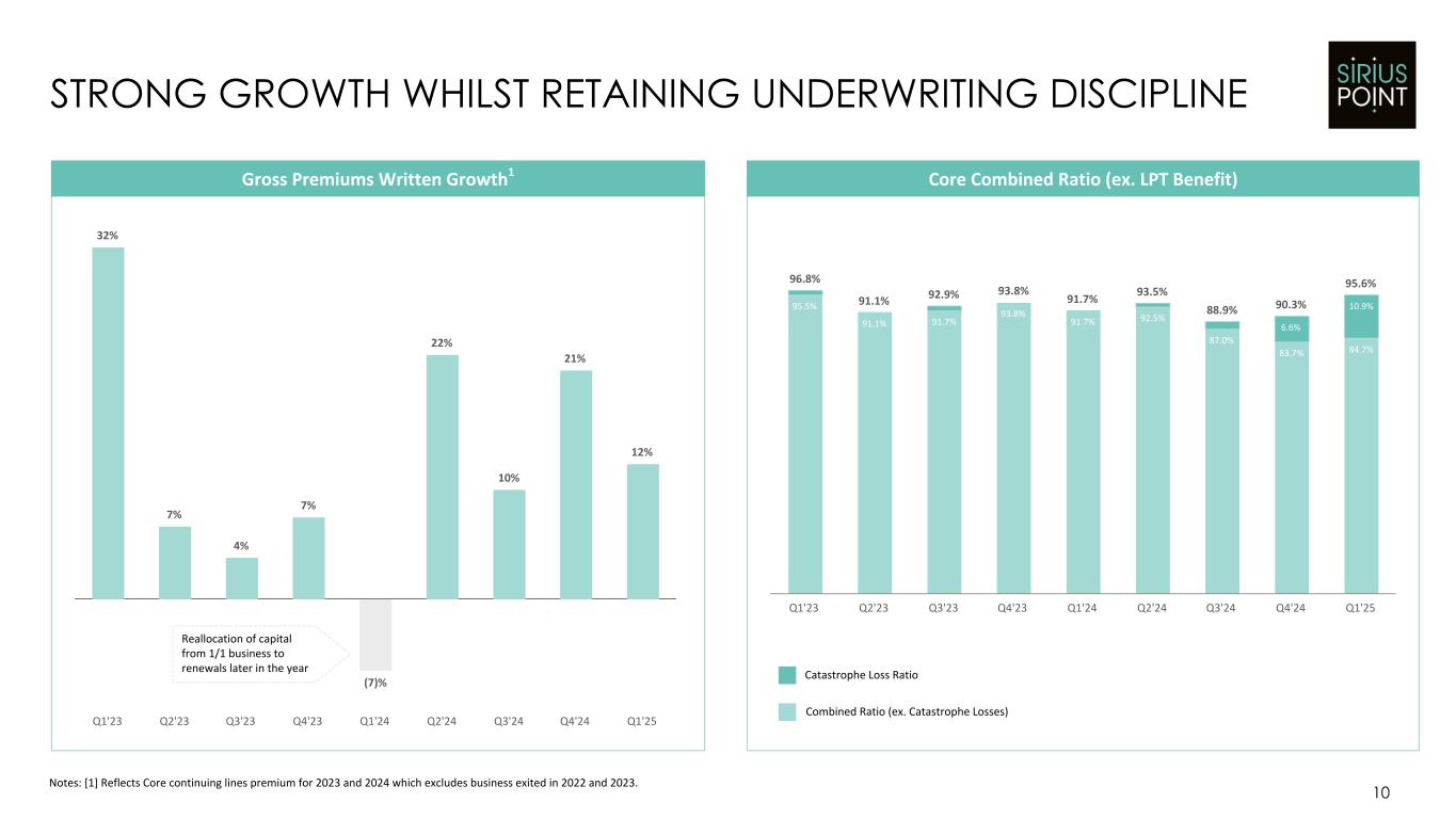 9 PROGRESS TOWARDS OUR AIM OF BEST-IN-CLASS UNDERWRITING Notes: [1] Peer average includes AFG, AIG, Arch, AXIS, Chubb, Everest, Fidelis, Hamilton, James River, Markel, Renaissance Re, RLI, Selective, Skyward Specialty, Travelers, W.R. Berkley. [2] Q1'25 peer average not shown as various peers are still to report. Trailing Twelve Months Combined Ratio 90.1% 89.1% 94.2% 92.2% 91.7% 92.1% 89.2% 90.2% 90.2% 90.5% 91.3% 93.7% 97.5% 97.9% 103.9% 101.6% 101.3% 99.4% 93.9% 93.7% 92.4% 93.0% 92.0% 91.3% 92.4% Peer Average SiriusPoint Core (ex. LPT Benefit) Q1 22 Q2 22 Q3 22 Q4 22 Q1 23 Q2 23 Q3 23 Q4 23 Q1 24 Q2 24 Q3 24 Q4 24 Q1 25 1 2 +9.6 ppts +2.2 ppts Key Messages – SiriusPoint's Core combined ratio outperformed the peer average combined ratio in Q4'24 by 2.4 points ◦ Continued to outperform the peer average combined ratio in Q1'25 for those who have reported so far – Portfolio actions have led to a 8.9 point improvement in SiriusPoint's trailing twelve months combined ratio versus Q1'23 – Portfolio actions include: ◦ Closure of 5 locations in 2022 writing International Property ◦ Exit of two specific partnerships in 2023 (Workers' Compensation and Cyber)