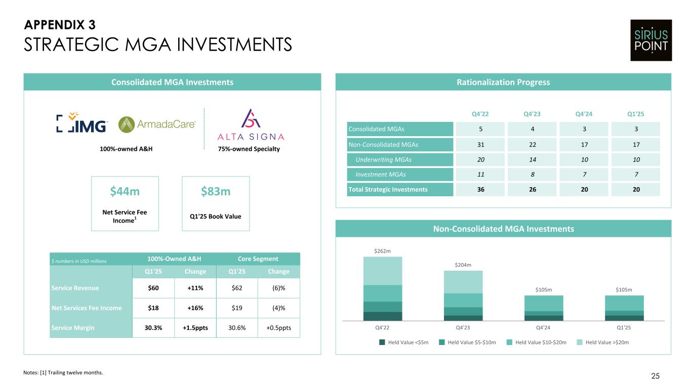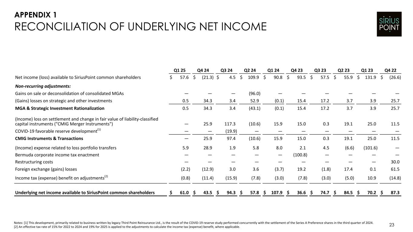 24 RECONCILIATION OF UNDERLYING RETURN ON EQUITY Q1'25 Q1'24 Net income available to SiriusPoint common shareholders $ 57.6 $ 90.8 Non-recurring adjustments: Gains on sale or deconsolidation of consolidated MGAs — — Losses on strategic and other investments 0.5 (0.1) MGA & Strategic Investment Rationalization 0.5 (0.1) Losses on settlement and change in fair value of liability-classified capital instruments ("CMIG Merger Instruments") — 15.9 COVID-19 favorable reserve development(1) — — CMIG Instruments & Transactions — 15.9 (Income) expense related to loss portfolio transfers 5.9 8.0 Bermuda corporate income tax enactment — — Foreign exchange (gains) losses (2.2) (3.7) Income tax expense on adjustments (2) (0.8) (3.0) Underlying net income available to SiriusPoint common shareholders $ 61.0 $ 107.9 Common shareholders’ equity attributable to SiriusPoint common shareholders - beginning of period $ 1,737.4 $ 2,313.9 Less: Accumulated other comprehensive (income) loss, net of tax 4.1 (3.1) Common shareholders’ equity attributable to SiriusPoint common shareholders ex AOCI - beginning of period 1,741.5 2,310.8 Common shareholders’ equity attributable to SiriusPoint common shareholders - end of period 1,825.2 2,402.6 Impact of adjustments from above 3.4 17.1 Less: Accumulated other comprehensive (income) loss, net of tax (26.4) 17.4 Common shareholders’ equity attributable to SiriusPoint common shareholders ex AOCI - end of period 1,802.2 2,437.1 Average common shareholders’ equity attributable to SiriusPoint common shareholders ex AOCI $ 1,771.9 $ 2,373.9 Return on average common shareholders’ equity attributable to SiriusPoint common shareholders 12.9 % 15.4 % Underlying return on average common shareholders’ equity attributable to SiriusPoint common shareholders ex AOCI 13.8 % 18.2 % Notes: [1] This development, primarily related to business written by legacy Third Point Reinsurance Ltd., is the result of the COVID-19 reserve study performed concurrently with the settlement of the Series A Preference shares in the third quarter of 2024. [2] For the three months ended March 31, 2025 and 2024, an effective tax rate of 19% and 15%, respectively, is applied to the adjustments to calculate the income tax expense, where applicable. APPENDIX 2