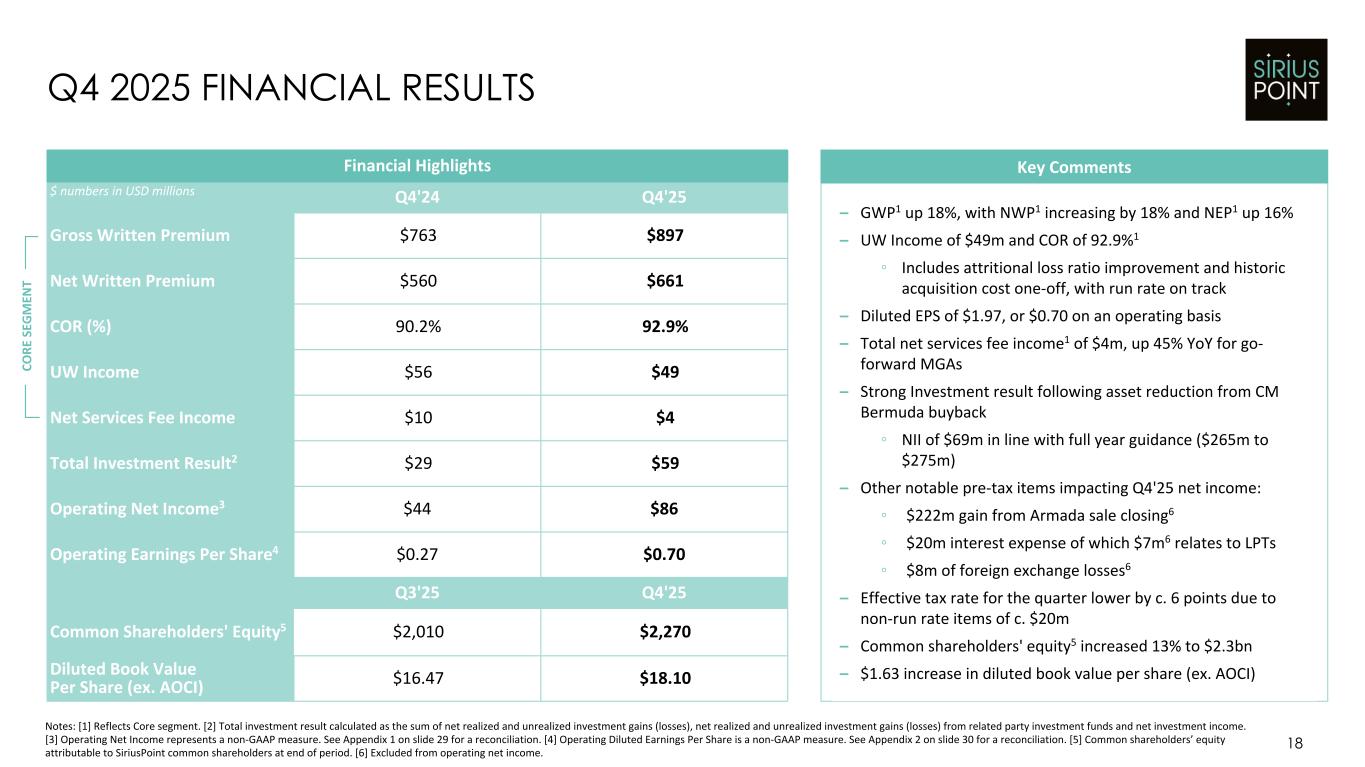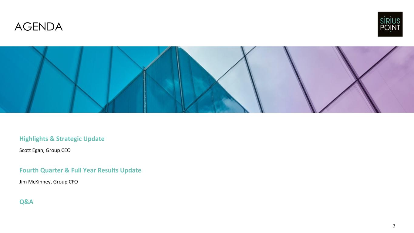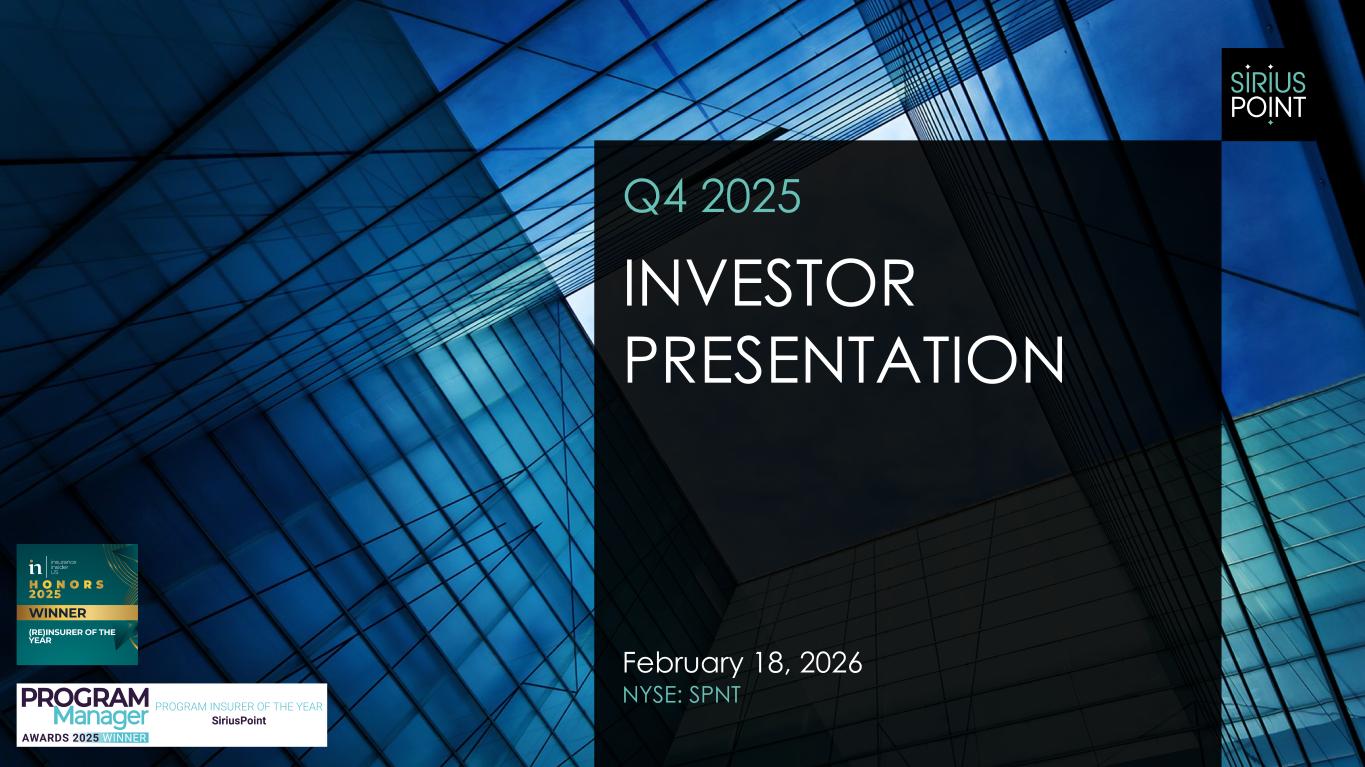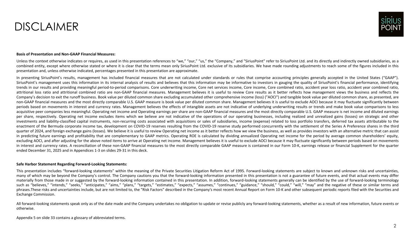 Basis of Presentation and Non-GAAP Financial Measures: Unless the context otherwise indicates or requires, as used in this presentation references to “we,” “our,” “us,” the “Company,” and "SiriusPoint" refer to SiriusPoint Ltd. and its directly and indirectly owned subsidiaries, as a combined entity, except where otherwise stated or where it is clear that the terms mean only SiriusPoint Ltd. exclusive of its subsidiaries. We have made rounding adjustments to reach some of the figures included in this presentation and, unless otherwise indicated, percentages presented in this presentation are approximate. In presenting SiriusPoint’s results, management has included financial measures that are not calculated under standards or rules that comprise accounting principles generally accepted in the United States (“GAAP”). SiriusPoint’s management uses this information in its internal analysis of results and believes that this information may be informative to investors in gauging the quality of SiriusPoint’s financial performance, identifying trends in our results and providing meaningful period-to-period comparisons. Core underwriting income, Core net services income, Core income, Core combined ratio, accident year loss ratio, accident year combined ratio, attritional loss ratio and attritional combined ratio are non-GAAP financial measures. Management believes it is useful to review Core results as it better reflects how management views the business and reflects the Company’s decision to exit the runoff business. Book value per diluted common share excluding accumulated other comprehensive income (loss) ("AOCI") and tangible book value per diluted common share, as presented, are non-GAAP financial measures and the most directly comparable U.S. GAAP measure is book value per diluted common share. Management believes it is useful to exclude AOCI because it may fluctuate significantly between periods based on movements in interest and currency rates. Management believes the effects of intangible assets are not indicative of underlying underwriting results or trends and make book value comparisons to less acquisitive peer companies less meaningful. Operating net income and Operating earnings per share are non-GAAP financial measures and the most directly comparable U.S. GAAP measure is net income and diluted earnings per share, respectively. Operating net income excludes items which we believe are not indicative of the operations of our operating businesses, including realized and unrealized gains (losses) on strategic and other investments and liability-classified capital instruments, non-recurring costs associated with acquisitions or sales of subsidiaries, income (expense) related to loss portfolio transfers, deferred tax assets attributable to the enactment of the Bermuda corporate income tax, development on COVID-19 reserves resulting from the COVID-19 reserve study performed concurrently with the settlement of the Series A Preference shares in the third quarter of 2024, and foreign exchange gains (losses). We believe it is useful to review Operating net income as it better reflects how we view the business, as well as provides investors with an alternative metric that can assist in predicting future earnings and profitability that are complementary to GAAP metrics. Operating ROE is calculated by dividing annualized Operating net income for the period by average common shareholders’ equity, excluding AOCI, and after adjusting for the above noted items to arrive at Operating net income. Management believes it is useful to exclude AOCI because it may fluctuate significantly between periods based on movements in interest and currency rates. A reconciliation of these non-GAAP financial measures to the most directly comparable GAAP measure is contained in our Form 10-K, earnings release or financial Supplement for the quarter ended December 31, 2025 and in Appendices 1-3 on slides 29-31 in this deck. Safe Harbor Statement Regarding Forward-Looking Statements: This presentation includes “forward-looking statements” within the meaning of the Private Securities Litigation Reform Act of 1995. Forward-looking statements are subject to known and unknown risks and uncertainties, many of which may be beyond the Company’s control. The Company cautions you that the forward-looking information presented in this presentation is not a guarantee of future events, and that actual events may differ materially from those made in or suggested by the forward-looking information contained in this presentation. In addition, forward-looking statements generally can be identified by the use of forward-looking terminology such as “believes,” “intends,” “seeks,” “anticipates,” “aims,” “plans,” “targets,” “estimates,” “expects,” “assumes,” “continues,” “guidance,” “should,” “could,” “will,” “may” and the negative of these or similar terms and phrases.These risks and uncertainties include, but are not limited to, the "Risk Factors" described in the Company's most recent Annual Report on Form 10-K and other subsequent periodic reports filed with the Securities and Exchange Commission. All forward-looking statements speak only as of the date made and the Company undertakes no obligation to update or revise publicly any forward-looking statements, whether as a result of new information, future events or otherwise. Appendix 5 on slide 33 contains a glossary of abbreviated terms. 2 DISCLAIMER