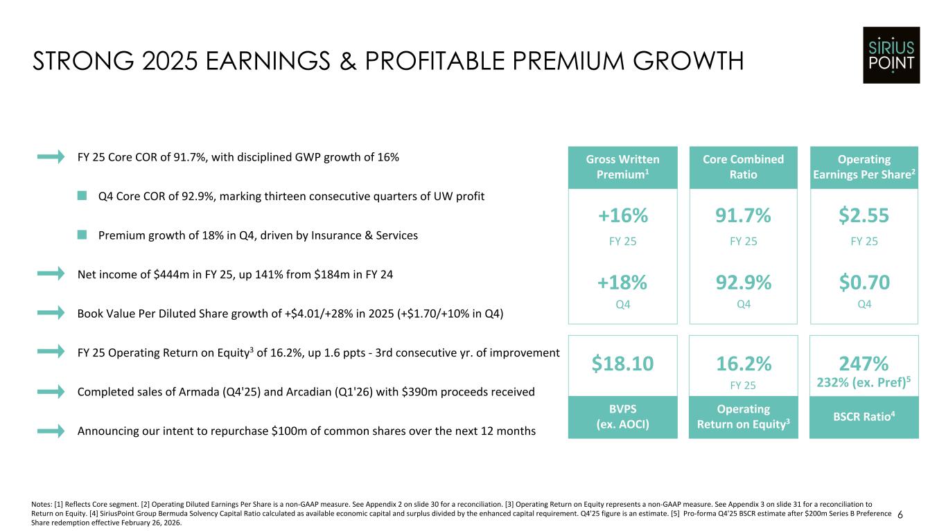 5 SIRIUSPOINT OVERVIEW Notes: Pie Chart represents Trailing Twelve Months Gross Written Premium. [1] Gross Written Premium on a Trailing Twelve Months basis. [2] Represents total shareholders' equity plus debt capital. [3] SiriusPoint Group Bermuda Solvency Capital Ratio calculated as available economic capital and surplus divided by the enhanced capital requirement. Q4'25 figure is an estimate. [4] Financial Strength Ratings and outlook according to AM Best, Fitch and S&P. Moody's FSR of A3 with stable outlook. Drive excellence as a best-in-class specialty underwriter, with a diverse and low-volatility portfolio, that targets a 12-15% ROE across the cycle Energy Surety Casualty Aviation/Space Other Specialties Credit Environmental Marine Total AssetsTotal Capitalization2Gross Written Premium1 $3.7bn $3.2bn $12.6bn Accident & HealthProperty BSCR Ratio3 247% Financial Strength Rating4 A- (Positive) Strong Balance Sheet with Robust Risk Management Relentless Focus on Underwriting Disciplined and Agile Capital Allocator Dynamic Multi-Channel Global Access 32% 27% 15% 7% 6% 5% 3%