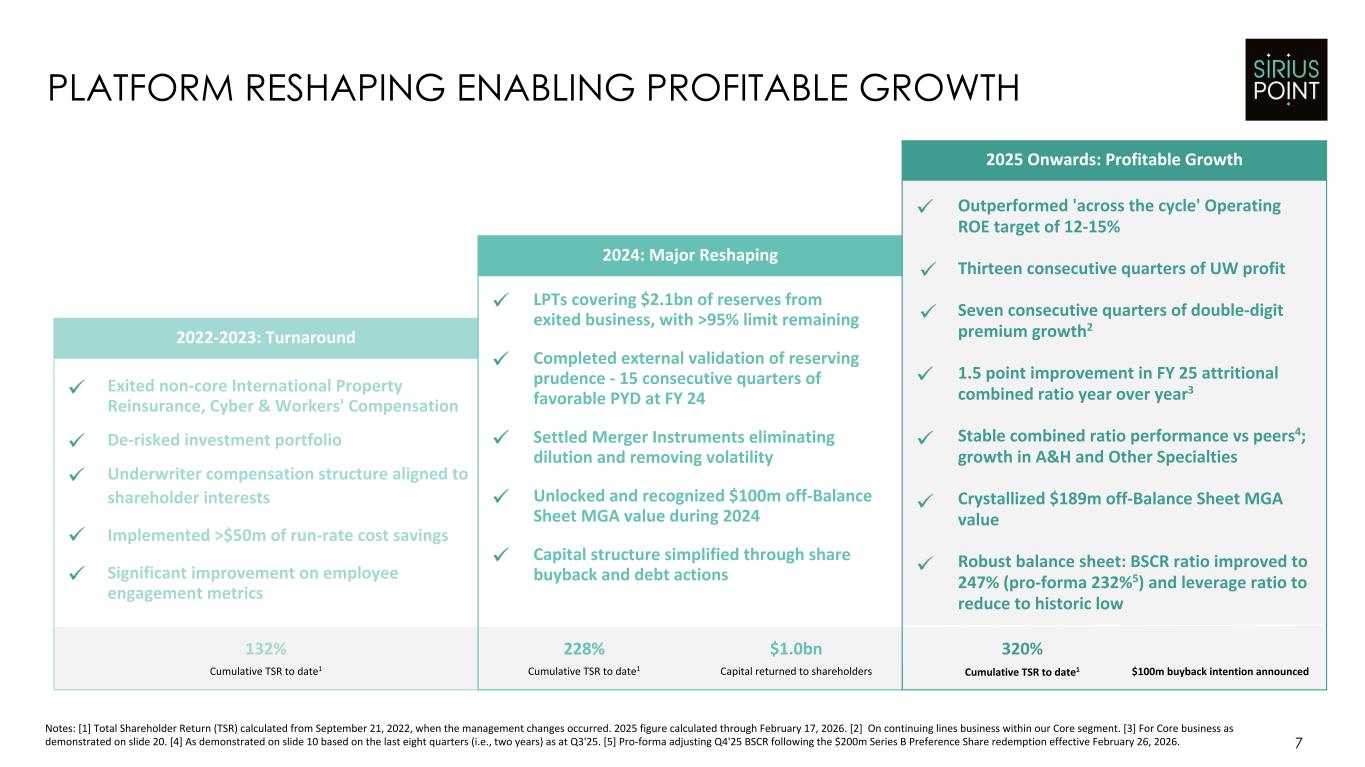 6 STRONG 2025 EARNINGS & PROFITABLE PREMIUM GROWTH Notes: [1] Reflects Core segment. [2] Operating Diluted Earnings Per Share is a non-GAAP measure. See Appendix 2 on slide 30 for a reconciliation. [3] Operating Return on Equity represents a non-GAAP measure. See Appendix 3 on slide 31 for a reconciliation to Return on Equity. [4] SiriusPoint Group Bermuda Solvency Capital Ratio calculated as available economic capital and surplus divided by the enhanced capital requirement. Q4'25 figure is an estimate. [5] Pro-forma Q4'25 BSCR estimate after $200m Series B Preference Share redemption effective February 26, 2026. BVPS (ex. AOCI) $18.10 Operating Return on Equity3 16.2% BSCR Ratio4 247% 232% (ex. Pref)5 Gross Written Premium1 Core Combined Ratio FY 25 Q4 FY 25 Q4 Operating Earnings Per Share2 FY 25 Q4 FY 25 Core COR of 91.7%, with disciplined GWP growth of 16% Q4 Core COR of 92.9%, marking thirteen consecutive quarters of UW profit Book Value Per Diluted Share growth of +$4.01/+28% in 2025 (+$1.70/+10% in Q4) Premium growth of 18% in Q4, driven by Insurance & Services Announcing our intent to repurchase $100m of common shares over the next 12 months FY 25 FY 25 Operating Return on Equity3 of 16.2%, up 1.6 ppts - 3rd consecutive yr. of improvement Completed sales of Armada (Q4'25) and Arcadian (Q1'26) with $390m proceeds received +18% 92.9% $0.70 +16% 91.7% $2.55 Net income of $444m in FY 25, up 141% from $184m in FY 24