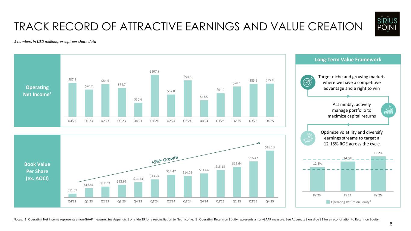2022-2023: Turnaround 2024: Major Reshaping 7 Notes: [1] Total Shareholder Return (TSR) calculated from September 21, 2022, when the management changes occurred. 2025 figure calculated through February 17, 2026. [2] On continuing lines business within our Core segment. [3] For Core business as demonstrated on slide 20. [4] As demonstrated on slide 10 based on the last eight quarters (i.e., two years) as at Q3'25. [5] Pro-forma adjusting Q4'25 BSCR following the $200m Series B Preference Share redemption effective February 26, 2026. PLATFORM RESHAPING ENABLING PROFITABLE GROWTH 132% Cumulative TSR to date1 228% Cumulative TSR to date1 Exited non-core International Property Reinsurance, Cyber & Workers' Compensation De-risked investment portfolio Underwriter compensation structure aligned to shareholder interests Implemented >$50m of run-rate cost savings Significant improvement on employee engagement metrics LPTs covering $2.1bn of reserves from exited business, with >95% limit remaining Completed external validation of reserving prudence - 15 consecutive quarters of favorable PYD at FY 24 Settled Merger Instruments eliminating dilution and removing volatility Unlocked and recognized $100m off-Balance Sheet MGA value during 2024 Capital structure simplified through share buyback and debt actions 320% Cumulative TSR to date1 $1.0bn Capital returned to shareholders $100m buyback intention announced Outperformed 'across the cycle' Operating ROE target of 12-15% Thirteen consecutive quarters of UW profit Seven consecutive quarters of double-digit premium growth2 1.5 point improvement in FY 25 attritional combined ratio year over year3 Stable combined ratio performance vs peers4; growth in A&H and Other Specialties Crystallized $189m off-Balance Sheet MGA value Robust balance sheet: BSCR ratio improved to 247% (pro-forma 232%5) and leverage ratio to reduce to historic low 2025 Onwards: Profitable Growth