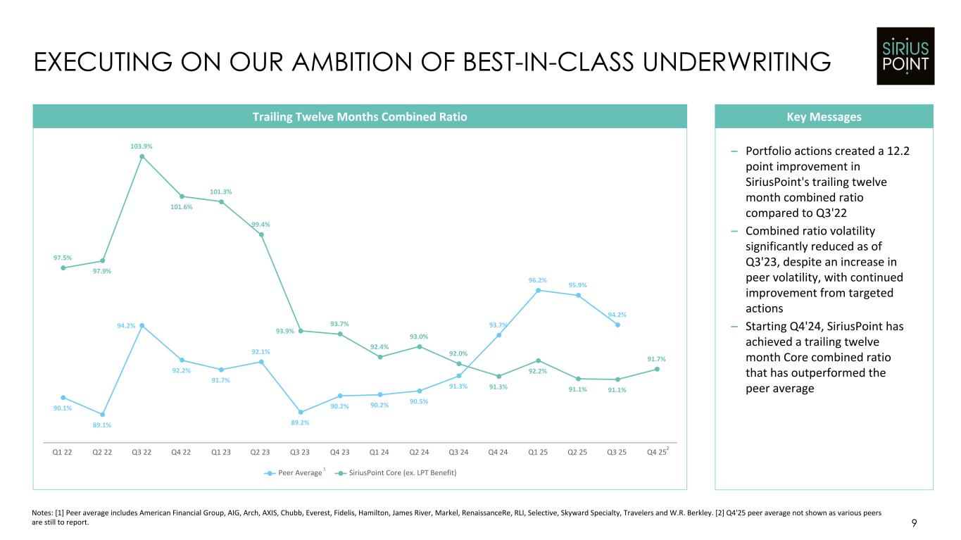 $11.59 $12.41 $12.63 $12.91 $13.33 $13.74 $14.47 $14.25 $14.64 $15.15 $15.64 $16.47 $18.10 Q4'22 Q1'23 Q2'23 Q3'23 Q4'23 Q1'24 Q2'24 Q3'24 Q4'24 Q1'25 Q2'25 Q3'25 Q4'25 $87.3 $70.2 $84.5 $74.7 $36.6 $107.9 $57.8 $94.3 $43.5 $61.0 $78.1 $85.2 $85.8 Q4'22 Q1'23 Q2'23 Q3'23 Q4'23 Q1'24 Q2'24 Q3'24 Q4'24 Q1'25 Q2'25 Q3'25 Q4'25 8 TRACK RECORD OF ATTRACTIVE EARNINGS AND VALUE CREATION Notes: [1] Operating Net Income represents a non-GAAP measure. See Appendix 1 on slide 29 for a reconciliation to Net Income. [2] Operating Return on Equity represents a non-GAAP measure. See Appendix 3 on slide 31 for a reconciliation to Return on Equity. Operating Net Income1 Book Value Per Share (ex. AOCI) $ numbers in USD millions, except per share data +56% G rowth Long-Term Value Framework 12.8% 14.6% 16.2% Operating Return on Equity FY 23 FY 24 FY 25 Target niche and growing markets where we have a competitive advantage and a right to win Act nimbly, actively manage portfolio to maximize capital returns Optimize volatility and diversify earnings streams to target a 12-15% ROE across the cycle 2